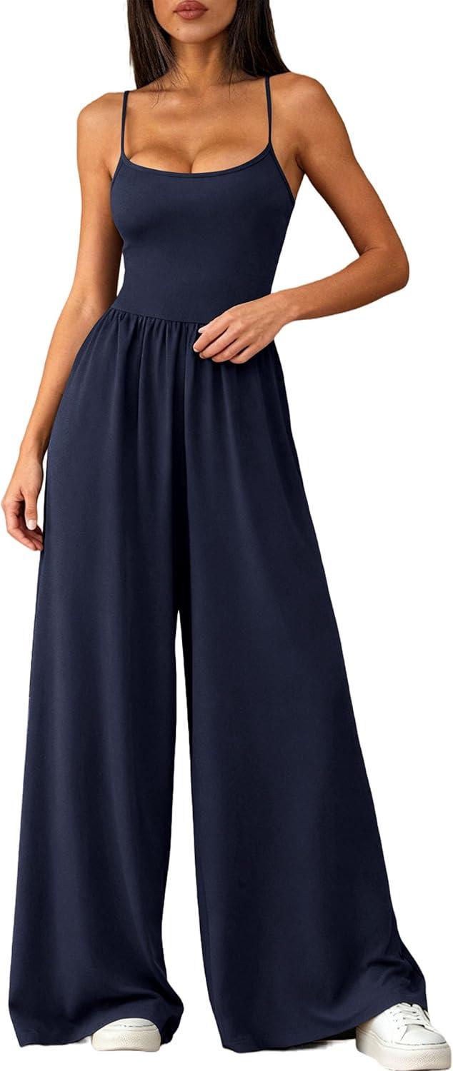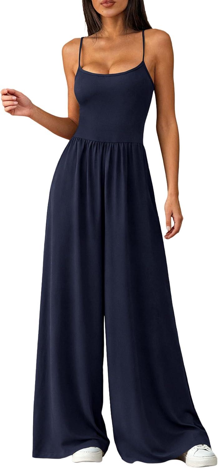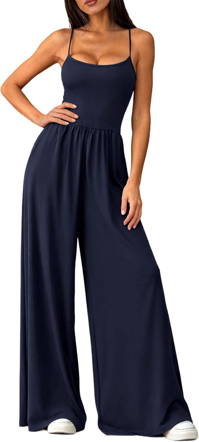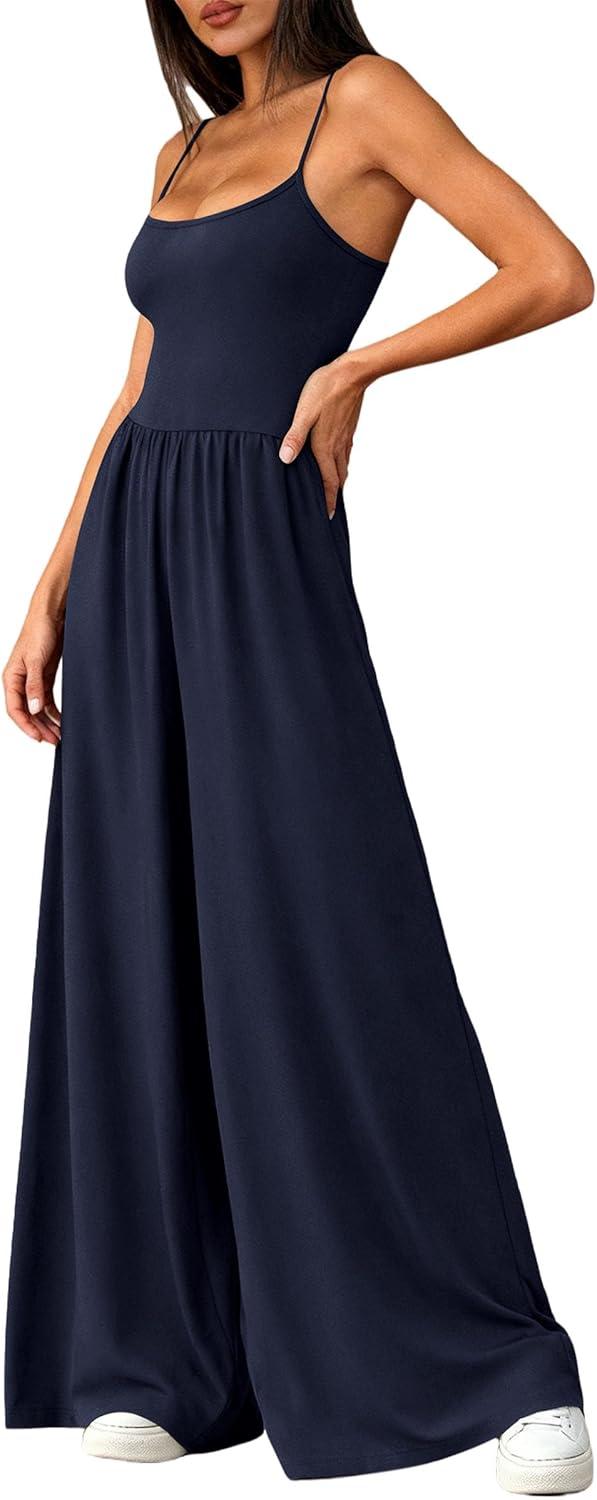 PRETTYGARDEN Jumpsuits for Women 2026 Sleeveless Strap Wide Leg Date Night Rompers Beach Vacation One Piece Summer Outfits(Navy Blue)
