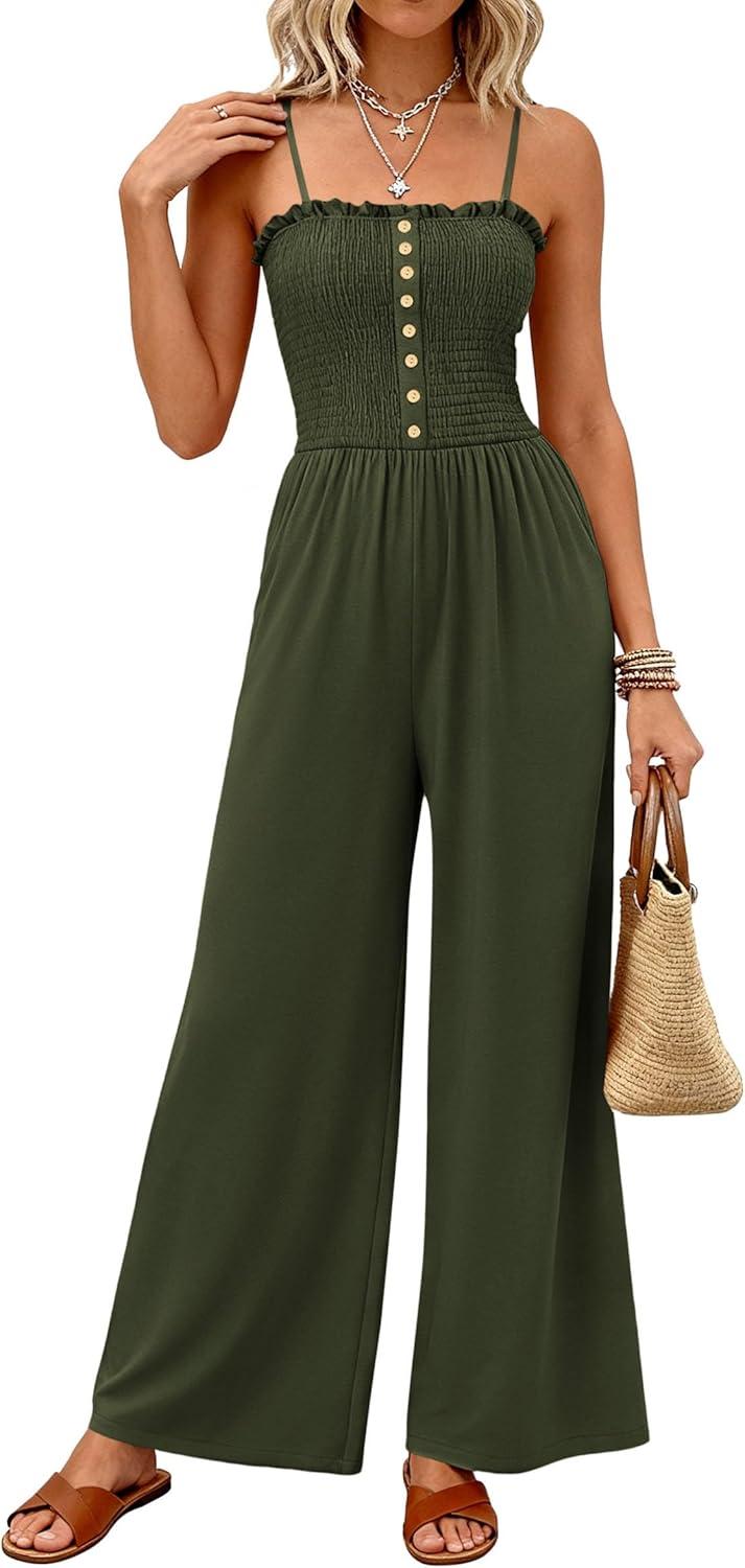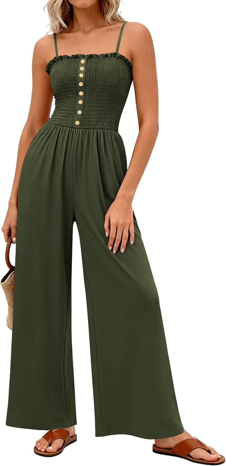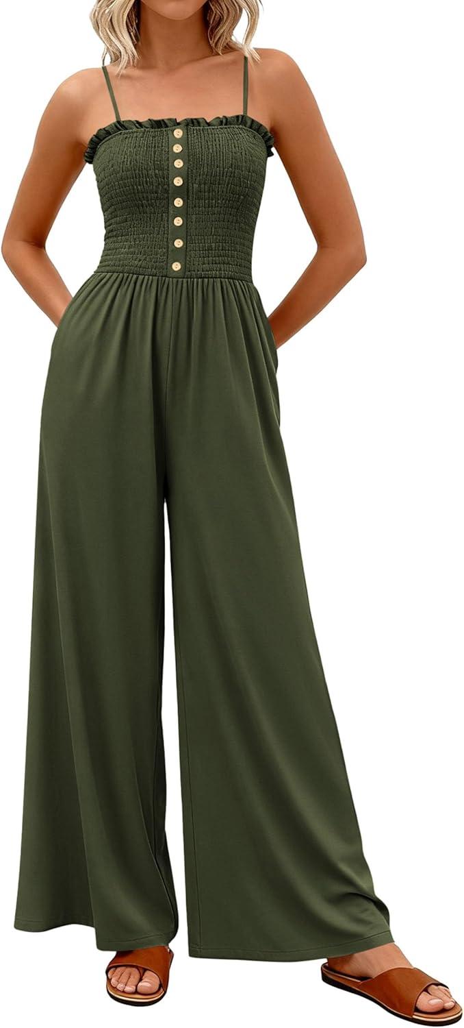 PRETTYGARDEN Jumpsuits for Women 2026 Summer Sleeveless Smocked Button Wide Leg Rompers Spring Travel One Piece Outfits(Army Green)