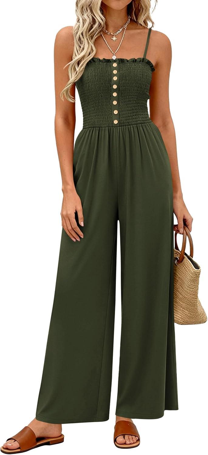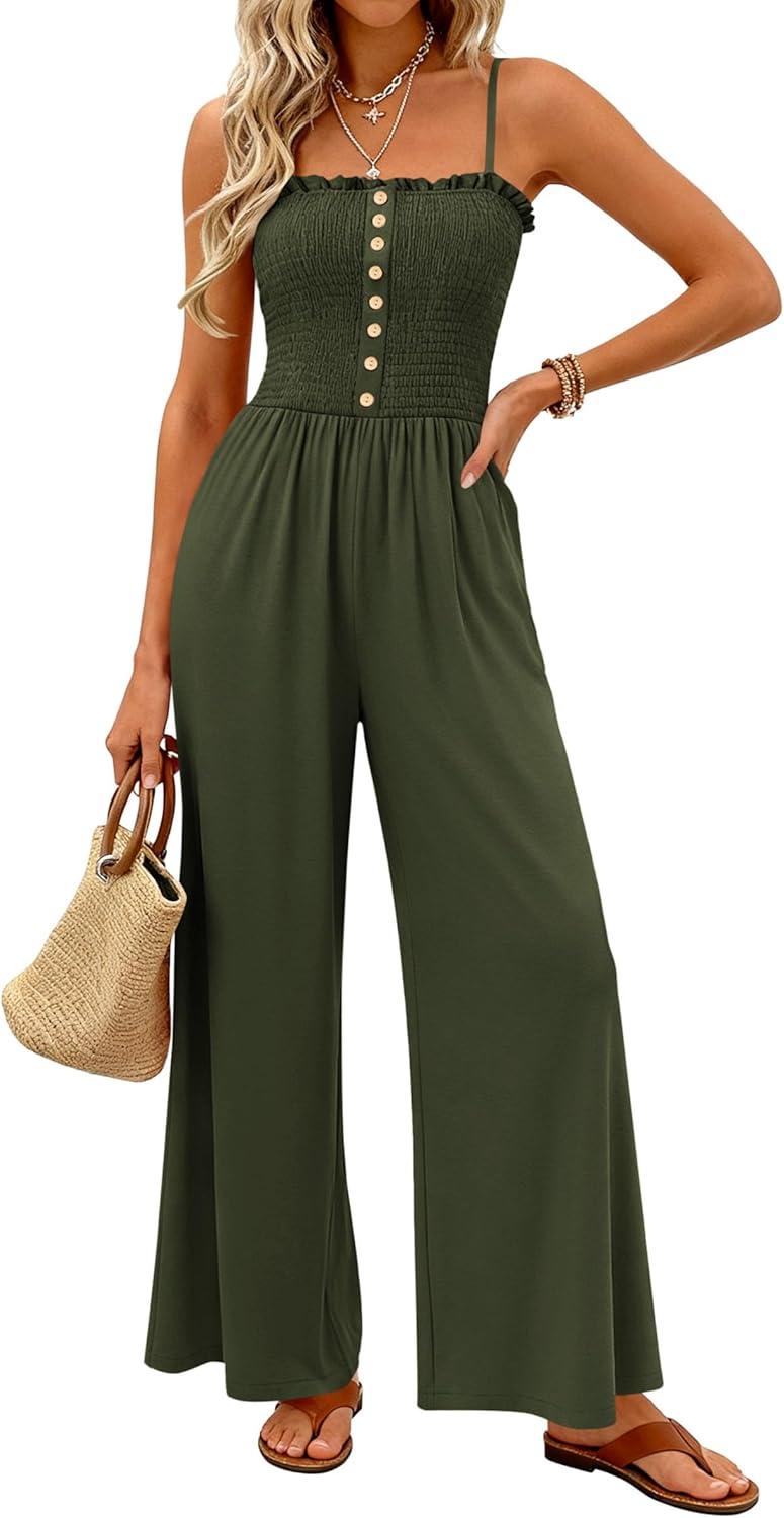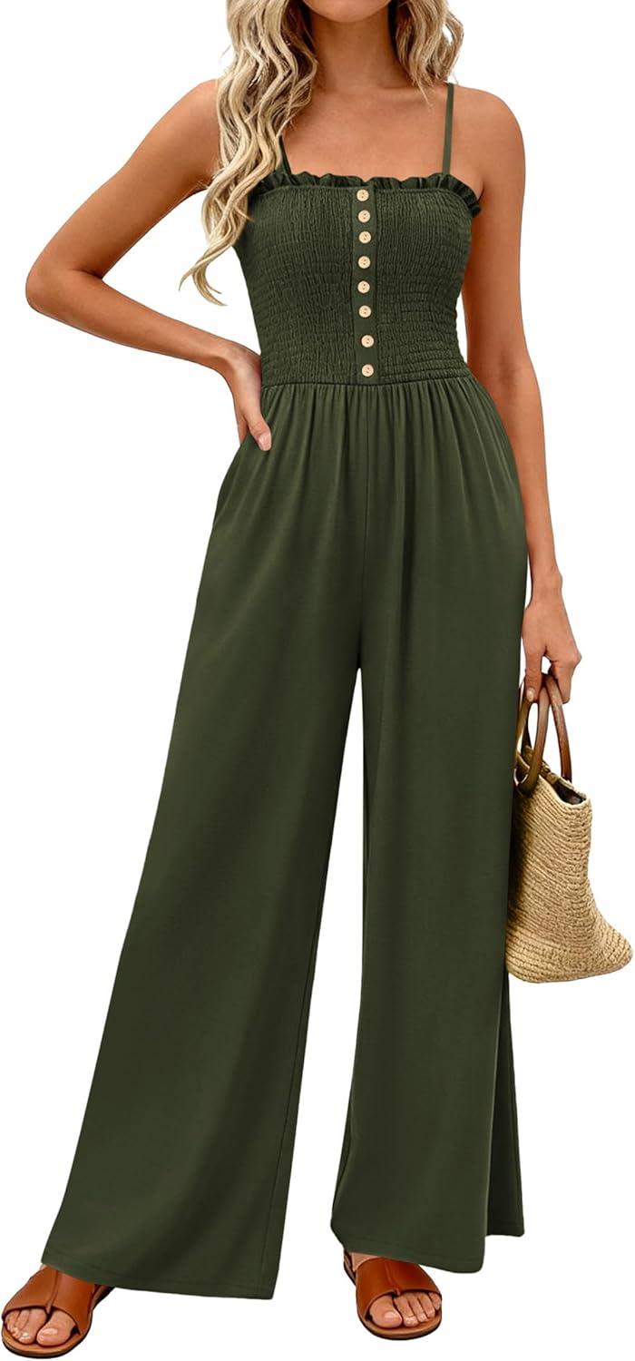 PRETTYGARDEN Jumpsuits for Women 2026 Summer Sleeveless Smocked Button Wide Leg Rompers Spring Travel One Piece Outfits(Army Green)