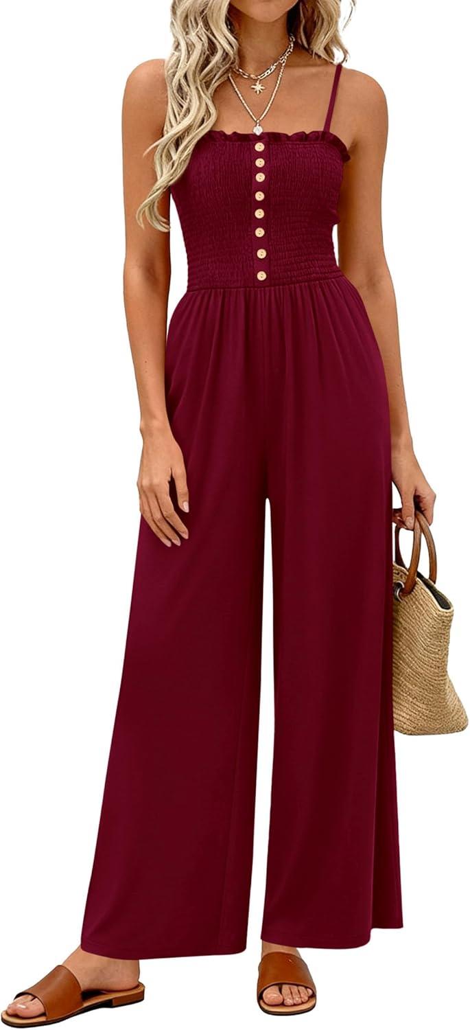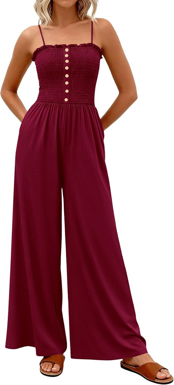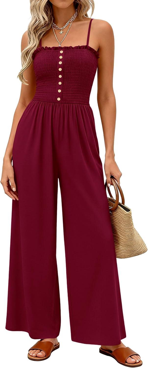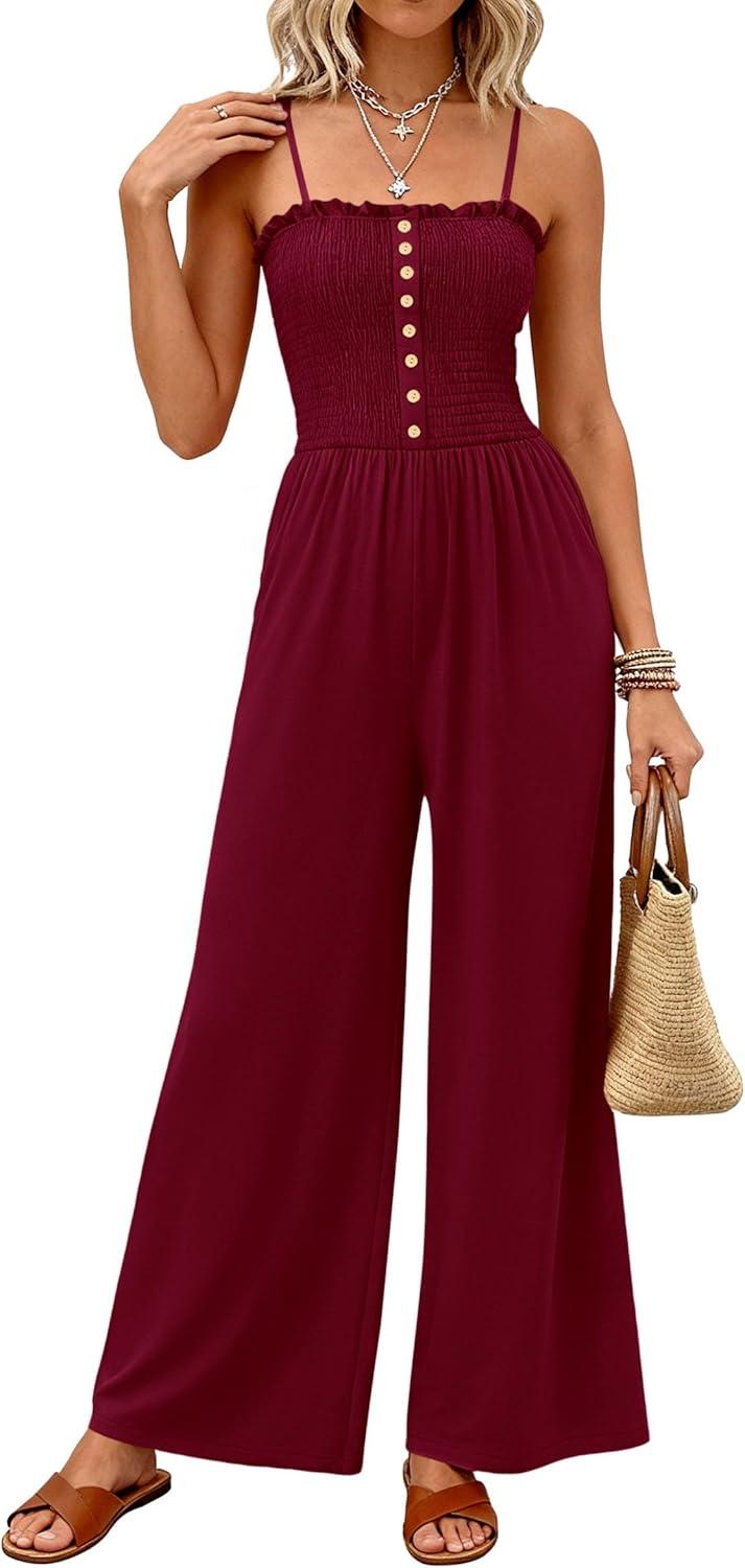 PRETTYGARDEN Jumpsuits for Women 2026 Summer Sleeveless Smocked Button Wide Leg Rompers Spring Travel One Piece Outfits(Burgundy)