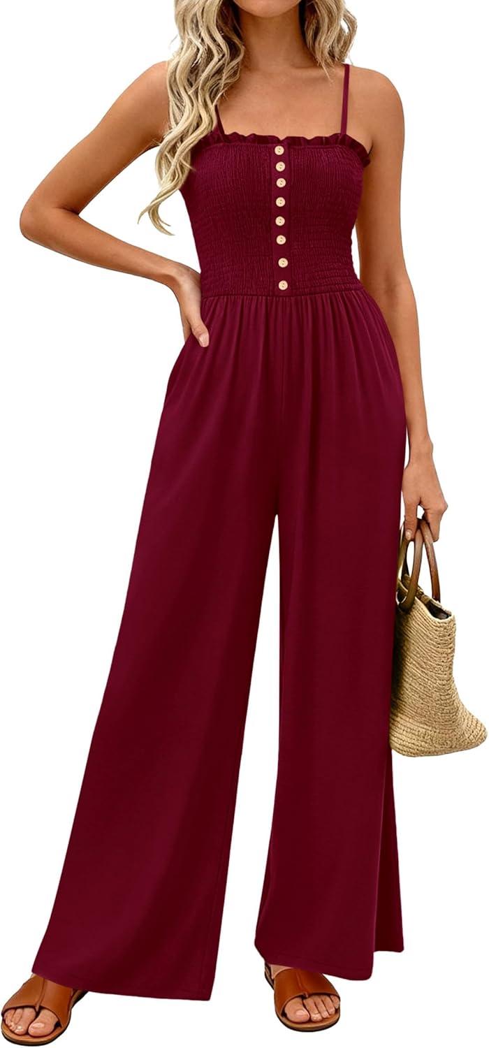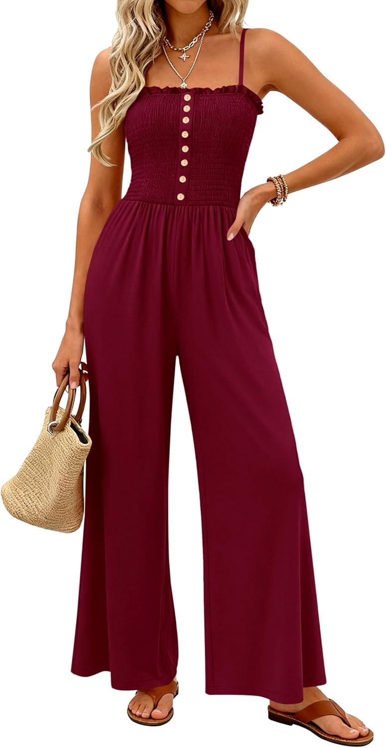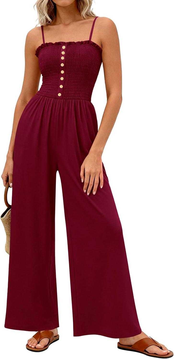 PRETTYGARDEN Jumpsuits for Women 2026 Summer Sleeveless Smocked Button Wide Leg Rompers Spring Travel One Piece Outfits(Burgundy)