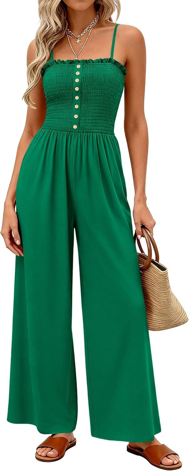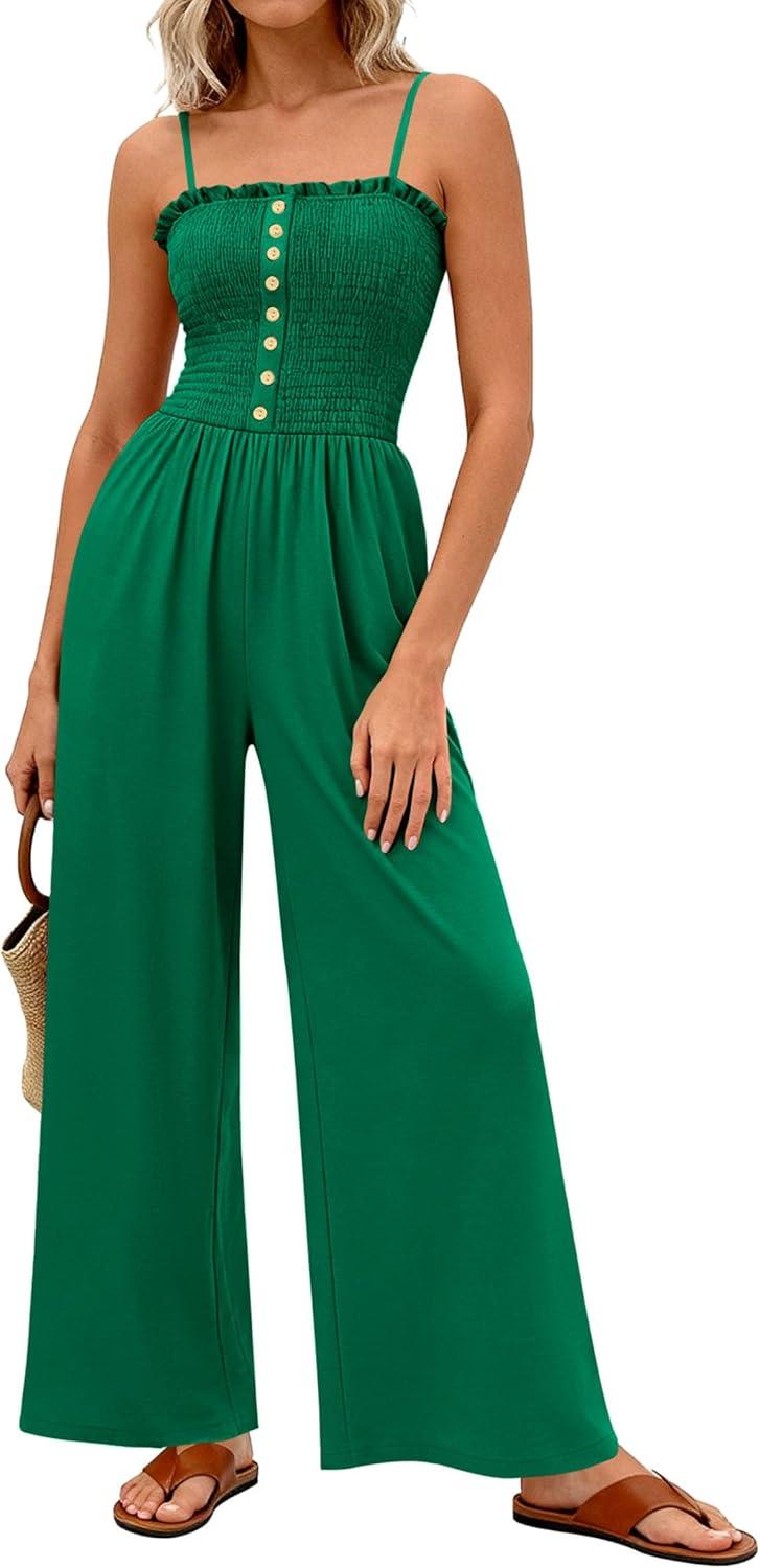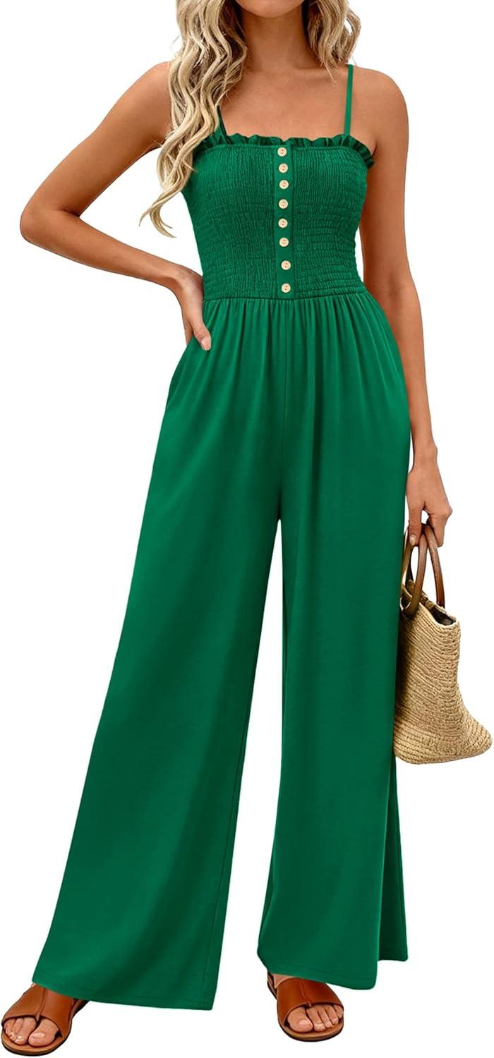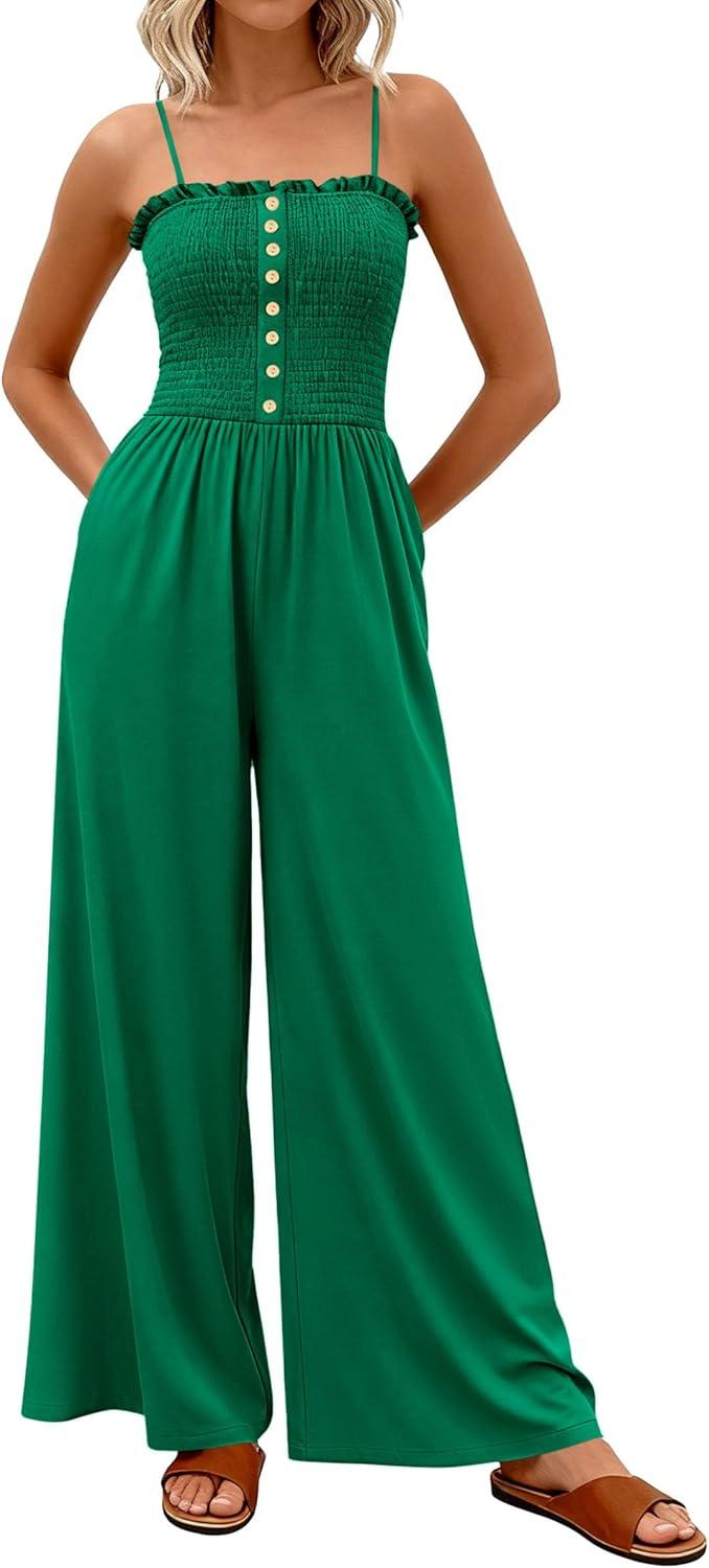 PRETTYGARDEN Jumpsuits for Women 2026 Summer Sleeveless Smocked Button Wide Leg Rompers Spring Travel One Piece Outfits(Green)