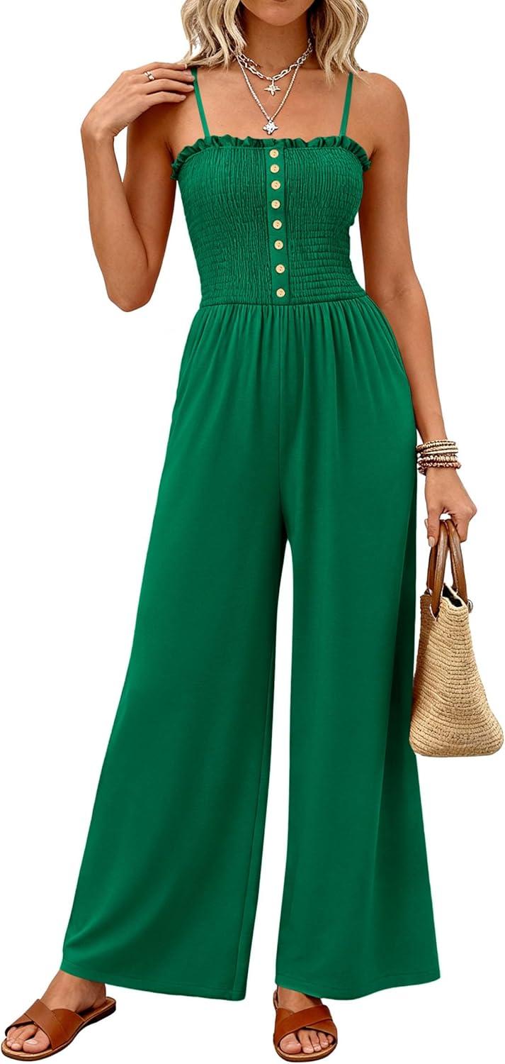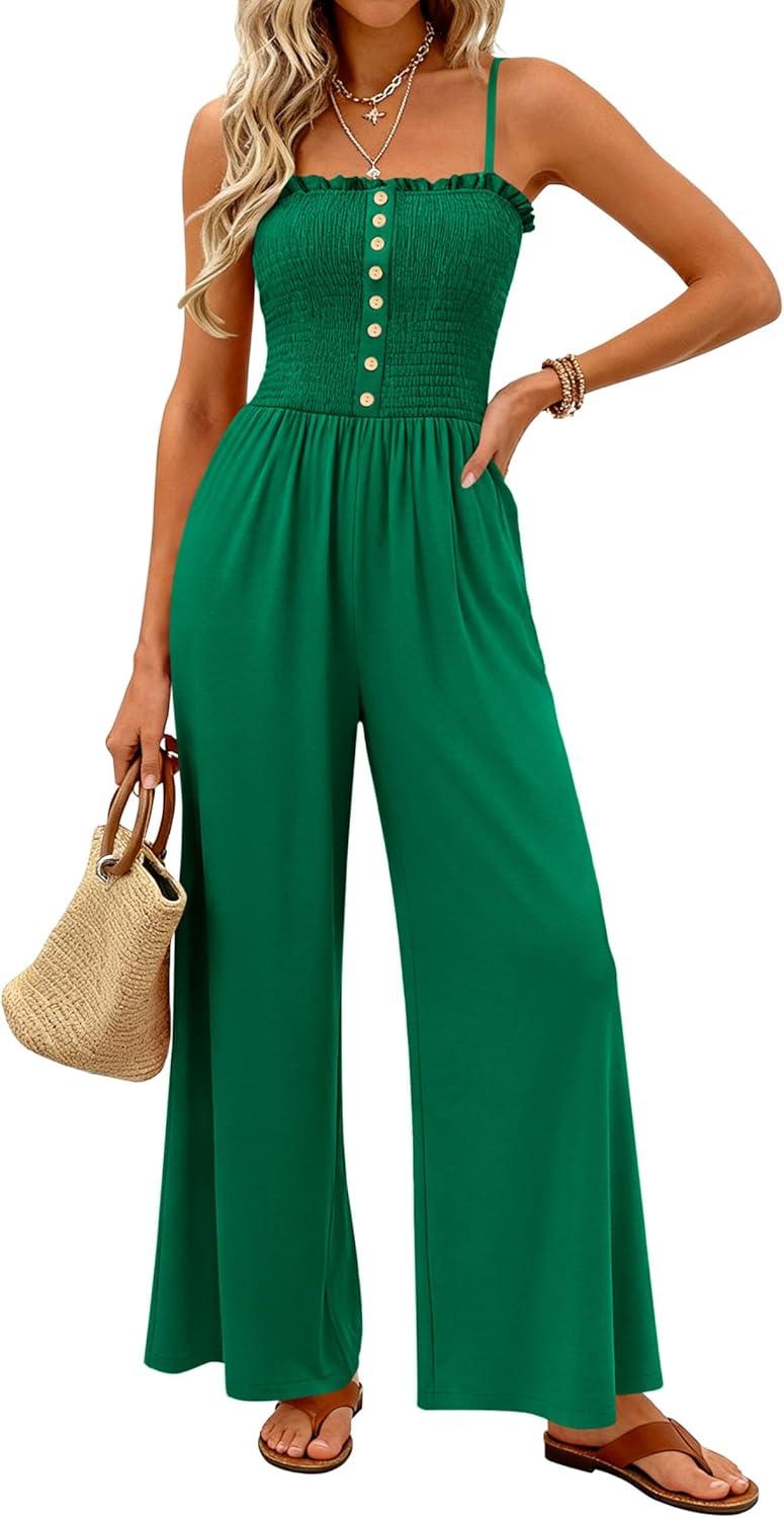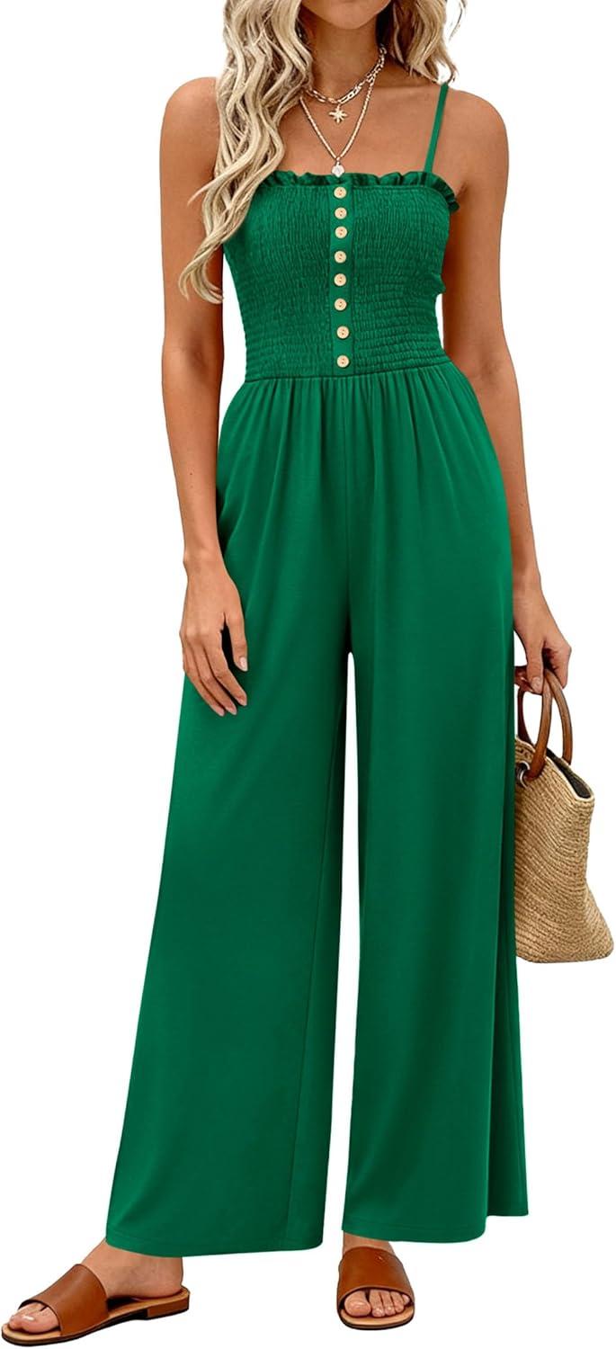 PRETTYGARDEN Jumpsuits for Women 2026 Summer Sleeveless Smocked Button Wide Leg Rompers Spring Travel One Piece Outfits(Green)