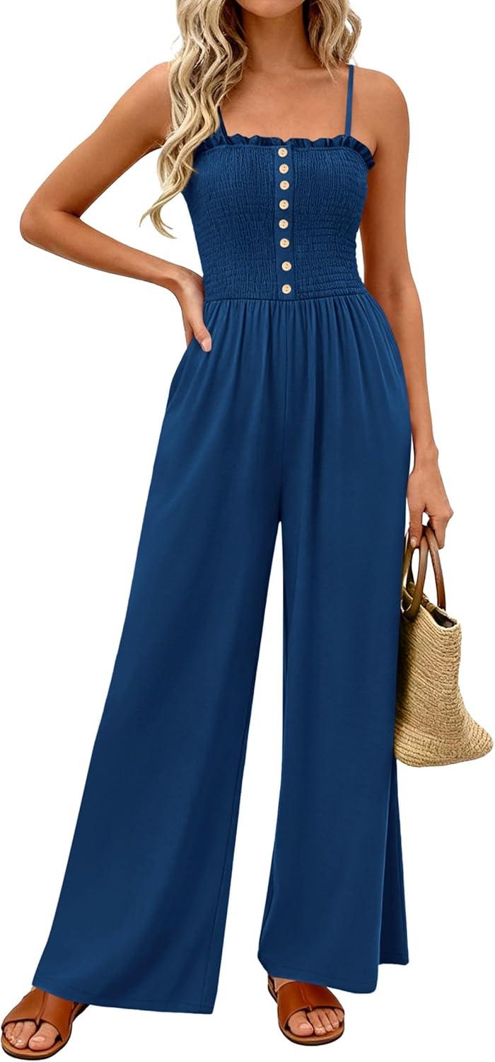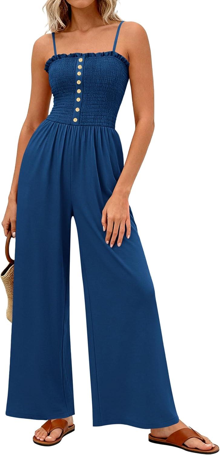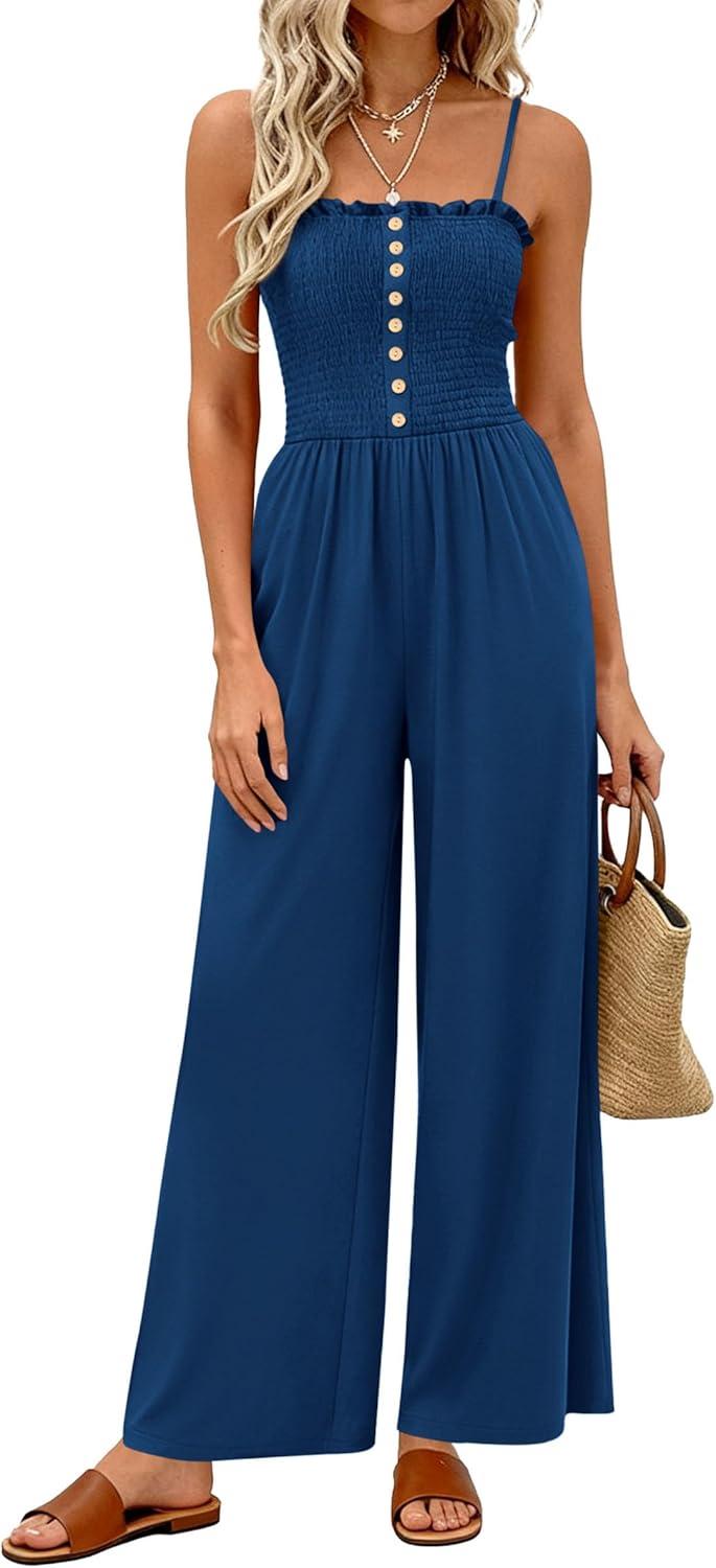 PRETTYGARDEN Jumpsuits for Women 2026 Summer Sleeveless Smocked Button Wide Leg Rompers Spring Travel One Piece Outfits(Navy Blue)