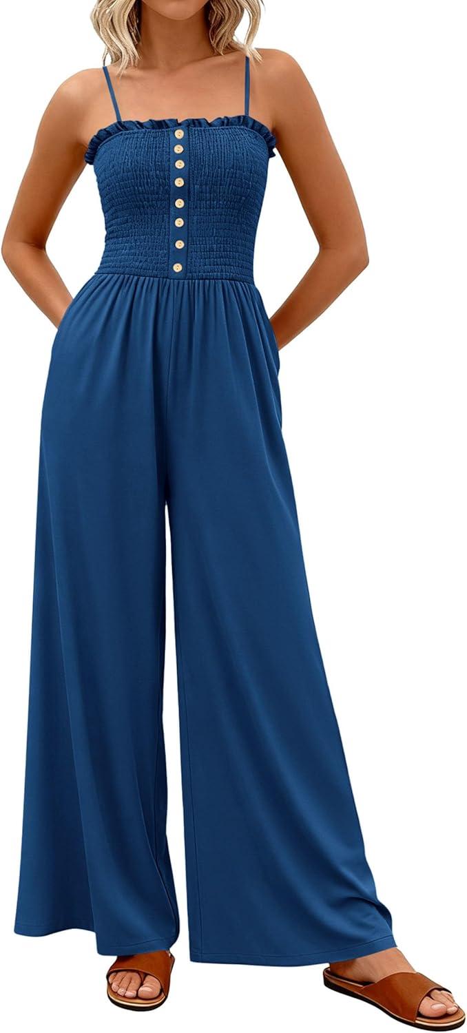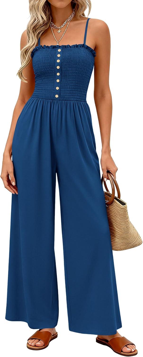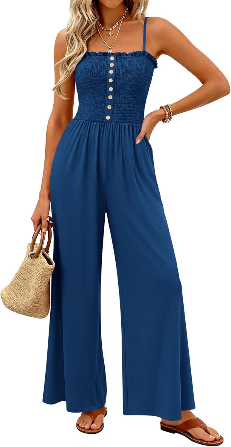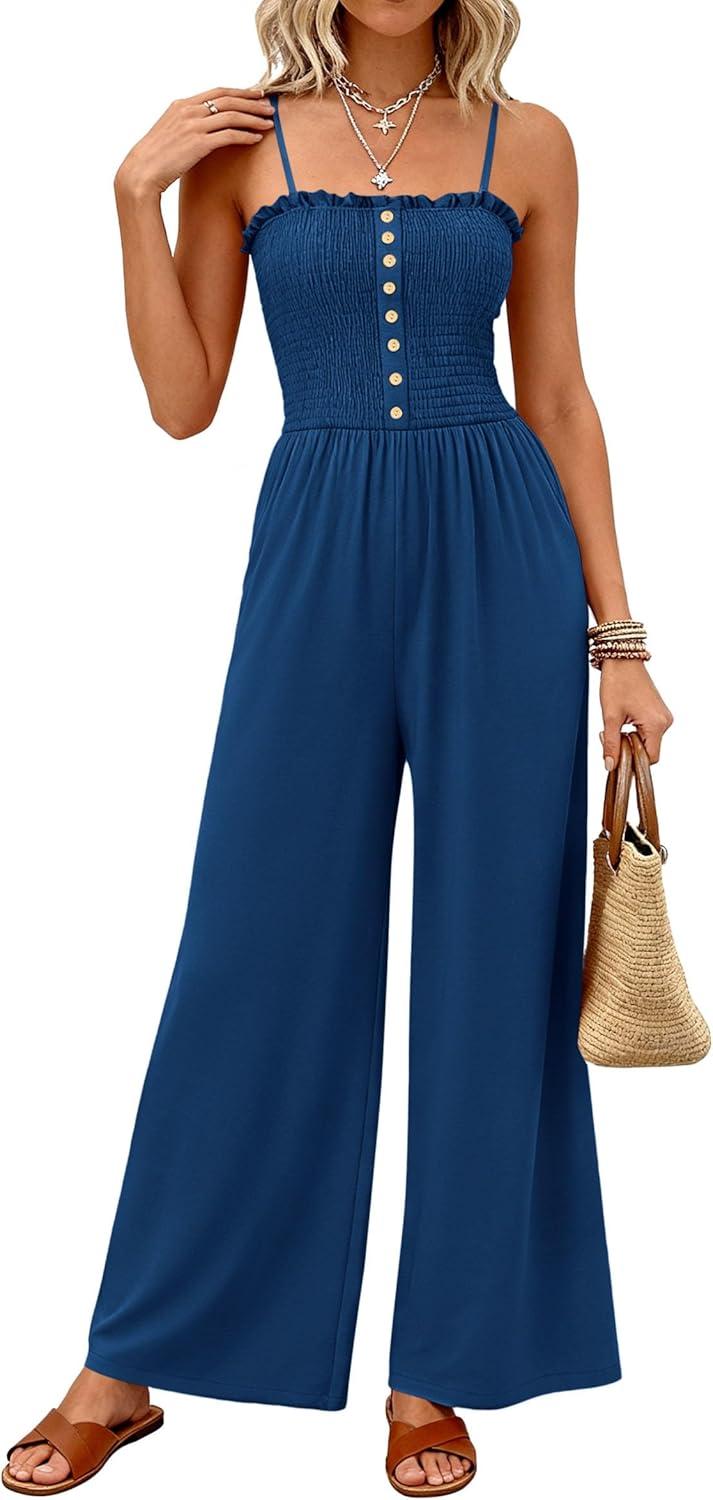 PRETTYGARDEN Jumpsuits for Women 2026 Summer Sleeveless Smocked Button Wide Leg Rompers Spring Travel One Piece Outfits(Navy Blue)