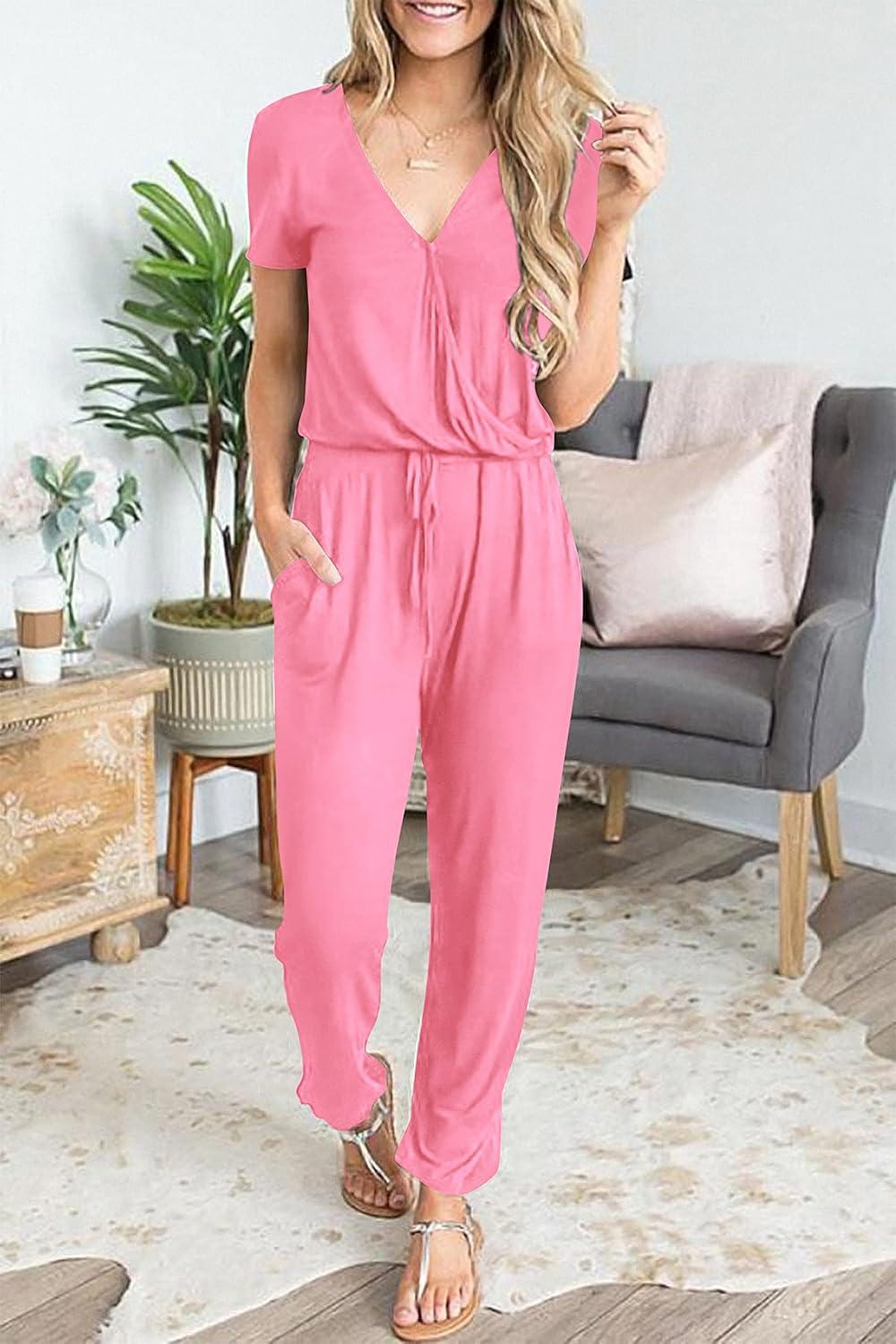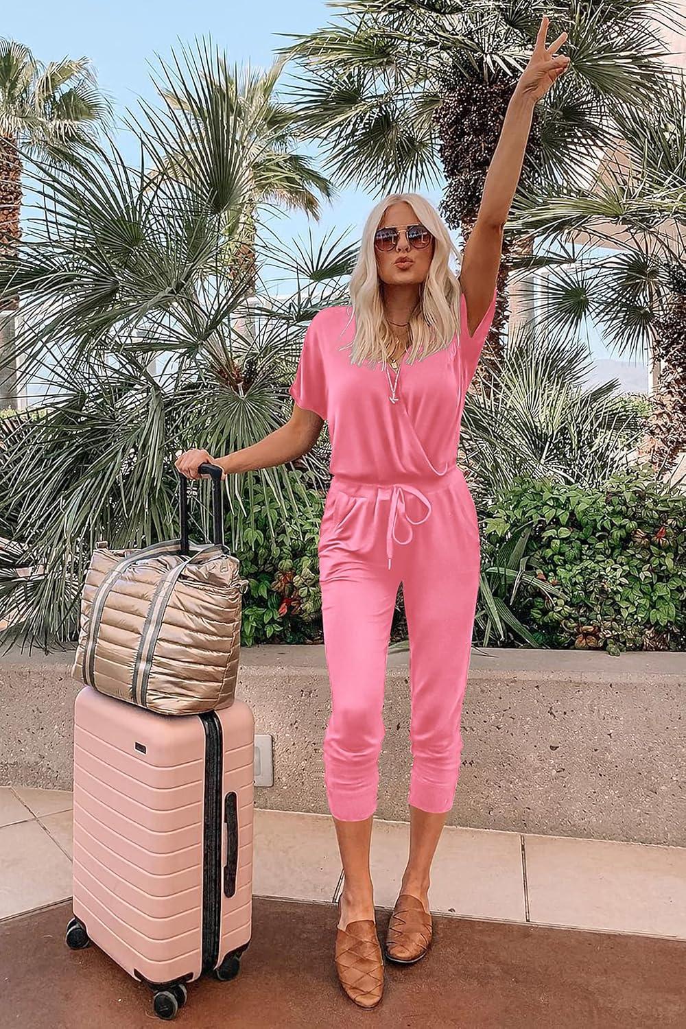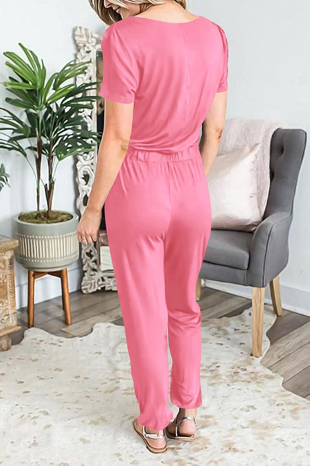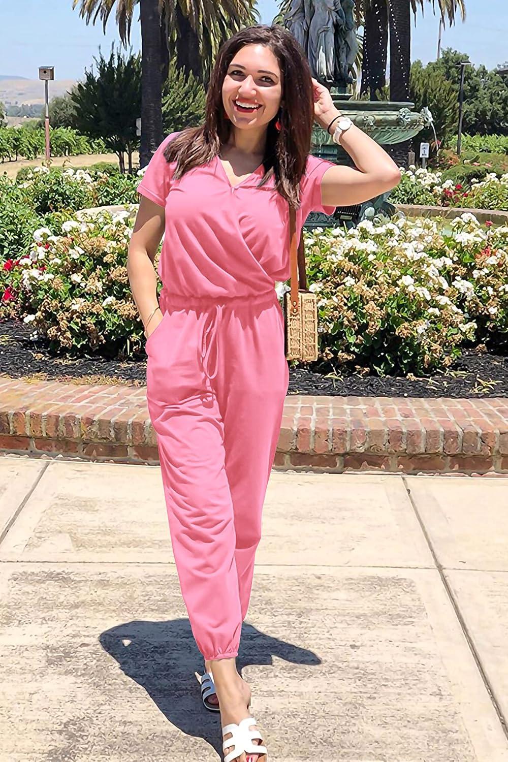 PRETTYGARDEN Jumpsuits for Women Dressy 2025 Summer Casual Short Sleeve Romper Spring Airport Beach Vacation Travel Outfits(Rose Pink)