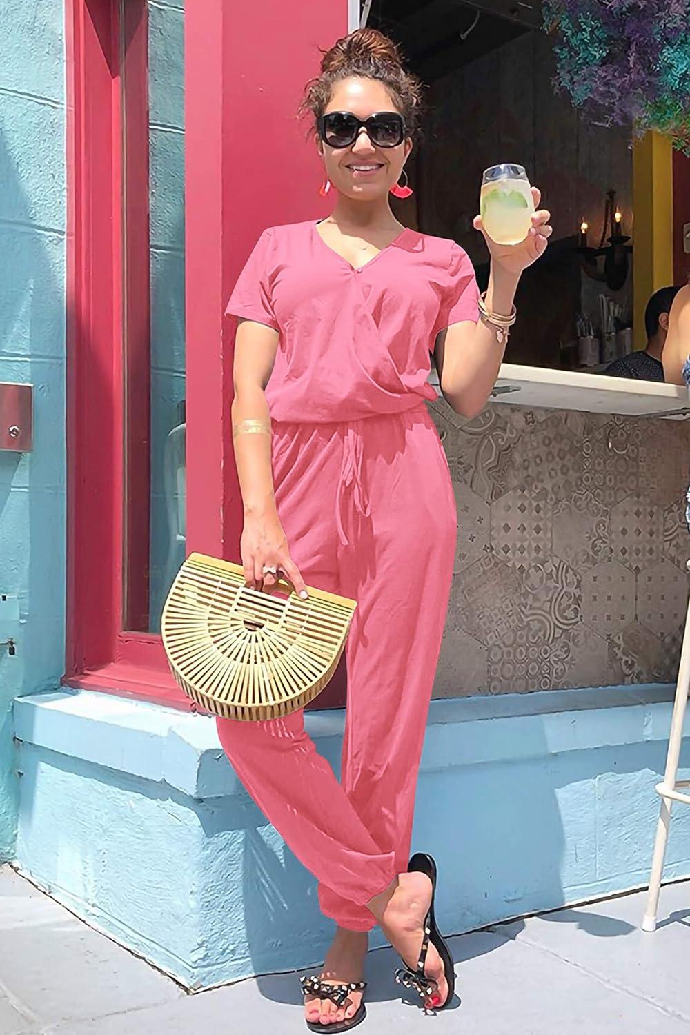 imagePRETTYGARDEN Jumpsuits for Women Dressy 2025 Summer Casual Short Sleeve Romper Spring Airport Beach Vacation Travel OutfitsRose Pink