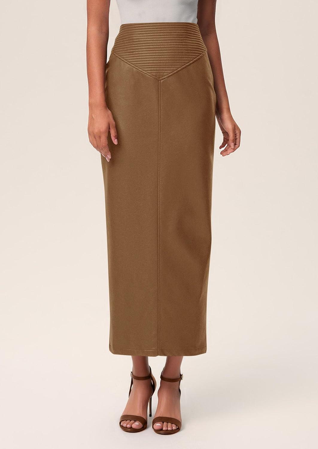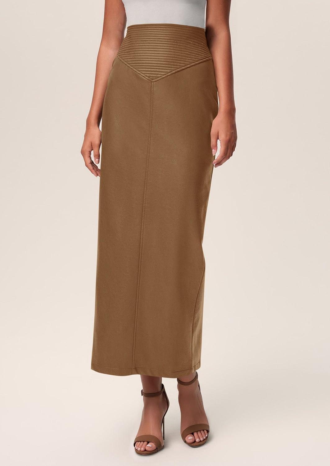 PRETTYGARDEN Long Skirts for Women 2025 Fall Fashion Clothing Faux Leather High Waist Dressy Casual Slit Pencil Maxi Skirt(Camel)