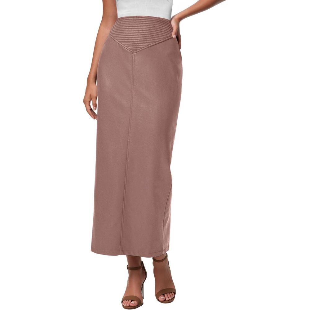 PRETTYGARDEN Long Skirts for Women 2026 Fall Fashion Clothing Faux Leather High Waist Dressy Casual Slit Pencil Maxi Skirt(Pink)