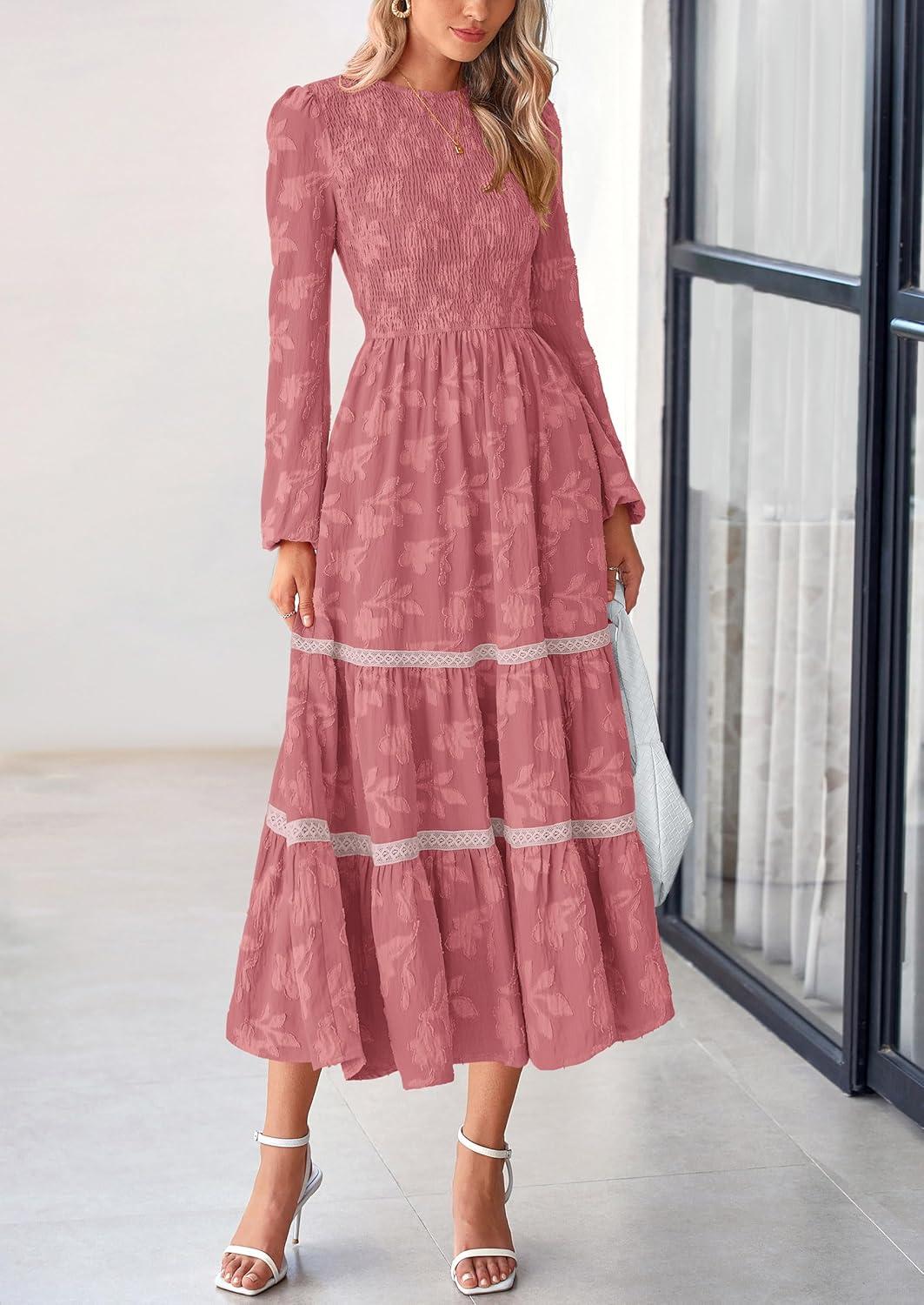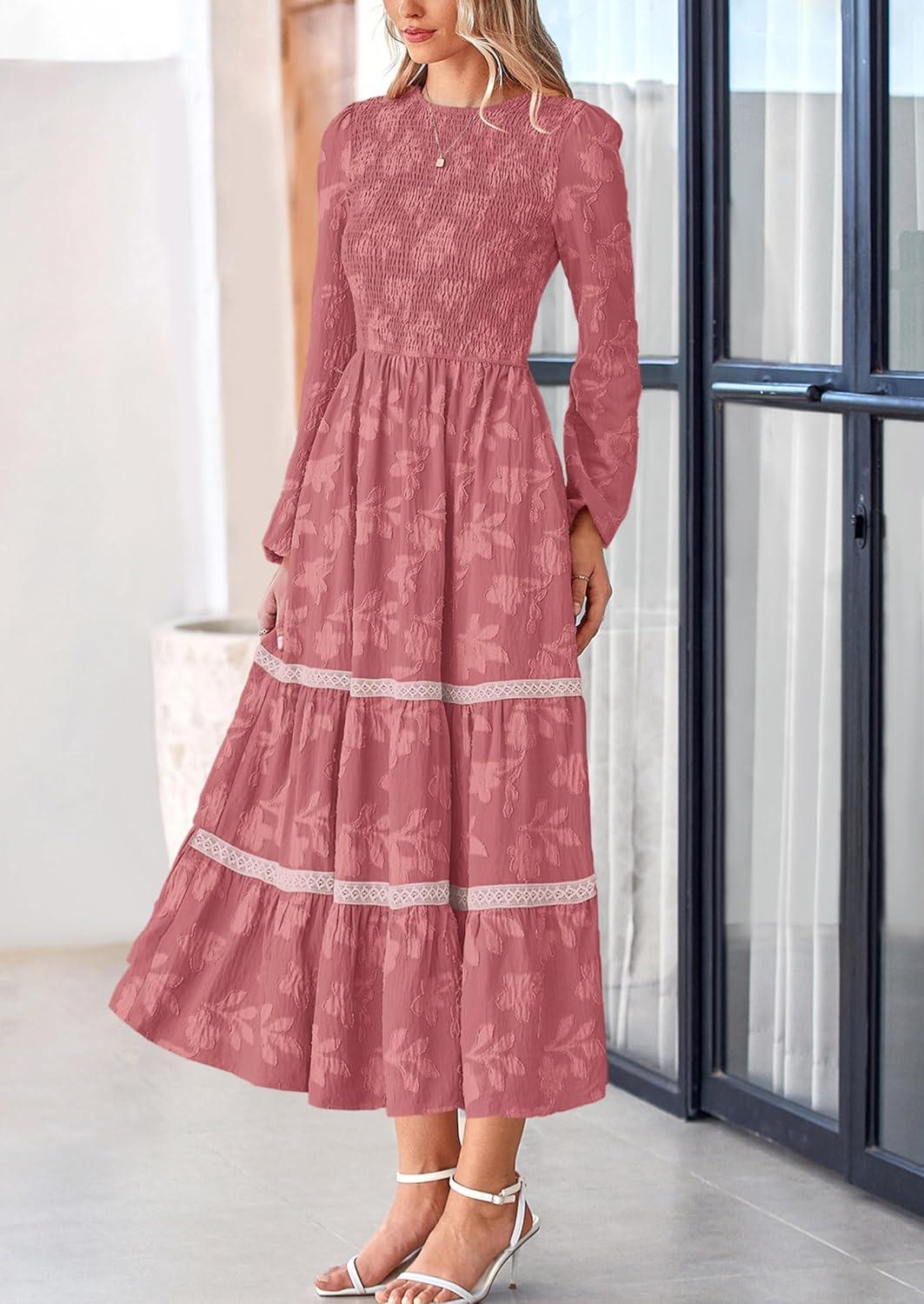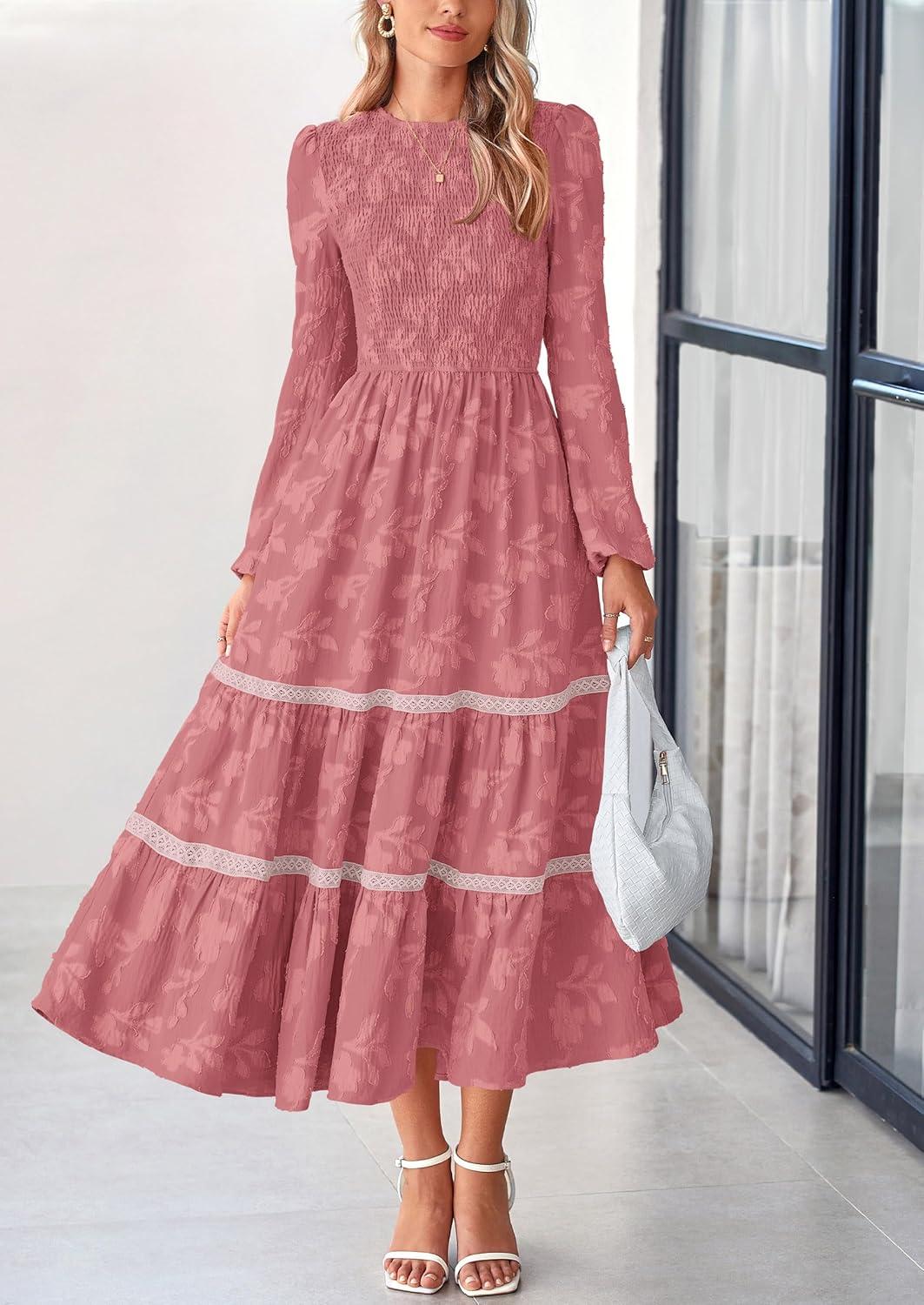 PRETTYGARDEN Long Sleeve Dress for Women 2025 Fall Elegant Modest Floral Boho Smocked Flowy Wedding Guest Midi Dresses(Bean Paste Pink)