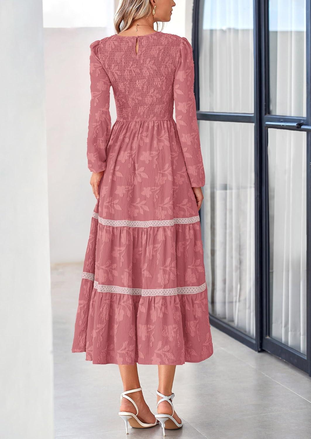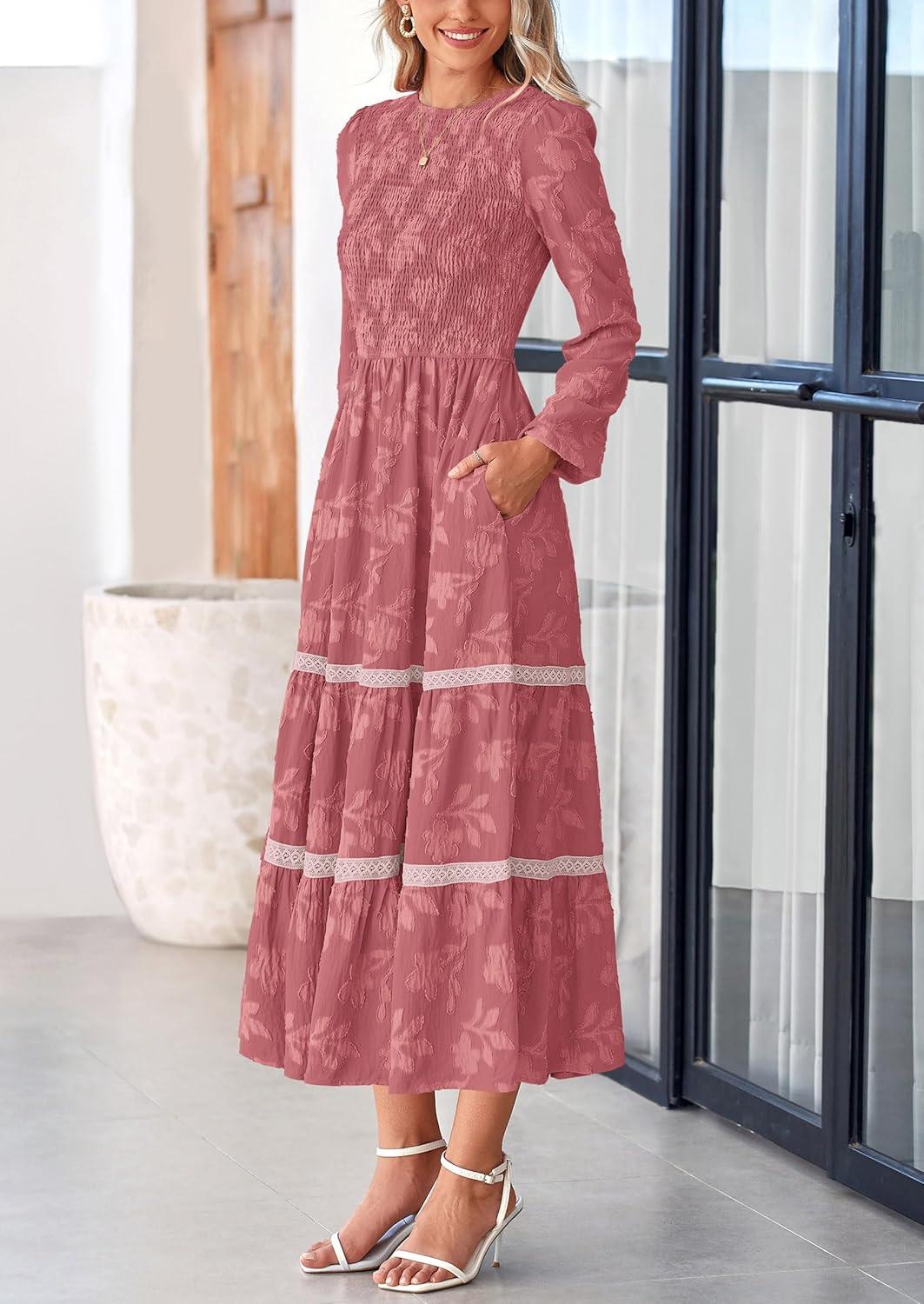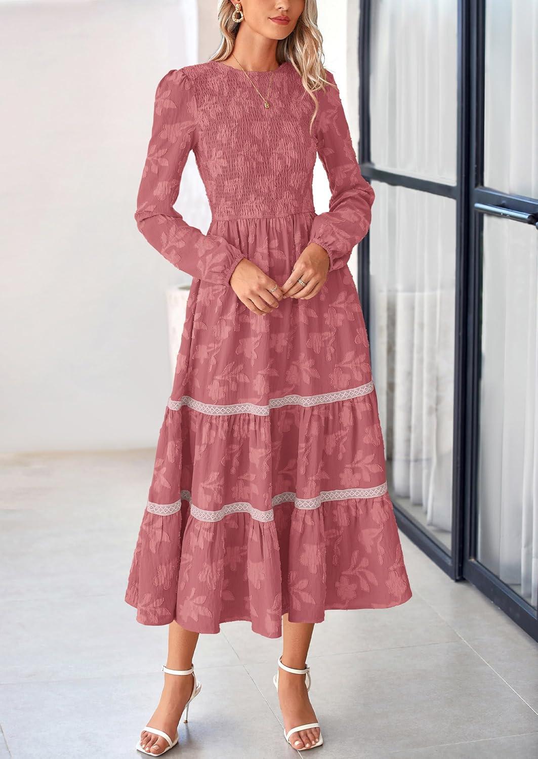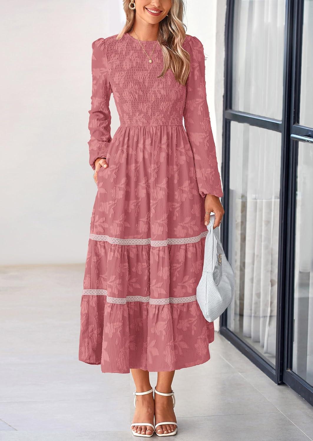 PRETTYGARDEN Long Sleeve Dress for Women 2025 Fall Elegant Modest Floral Boho Smocked Flowy Wedding Guest Midi Dresses(Bean Paste Pink)
