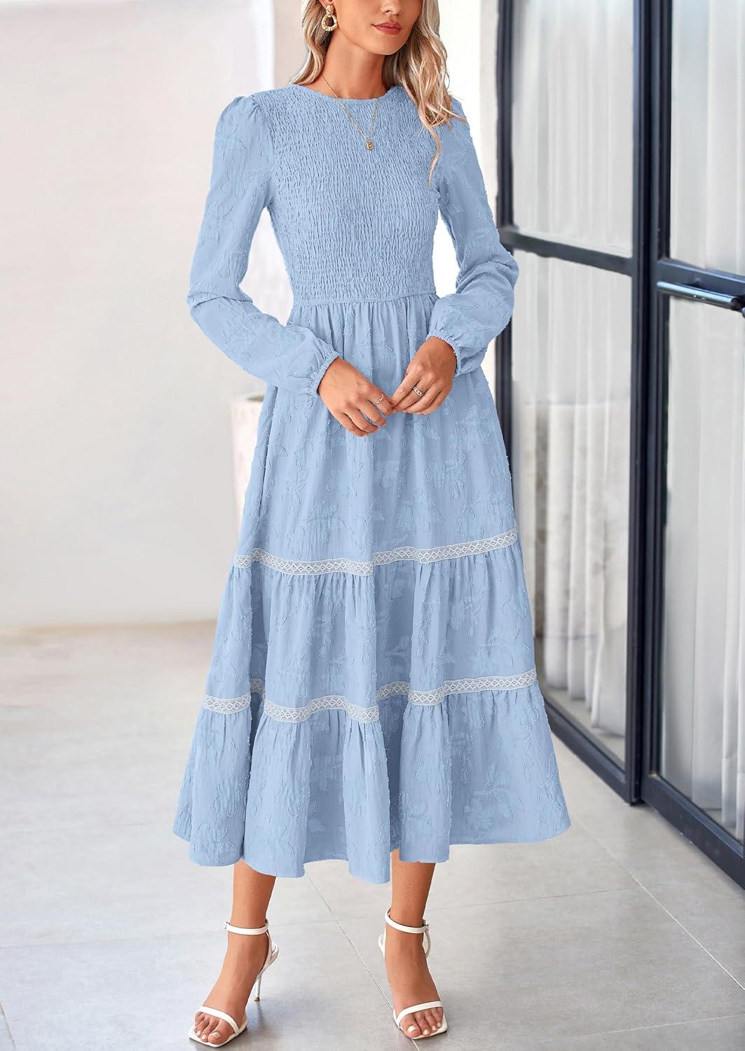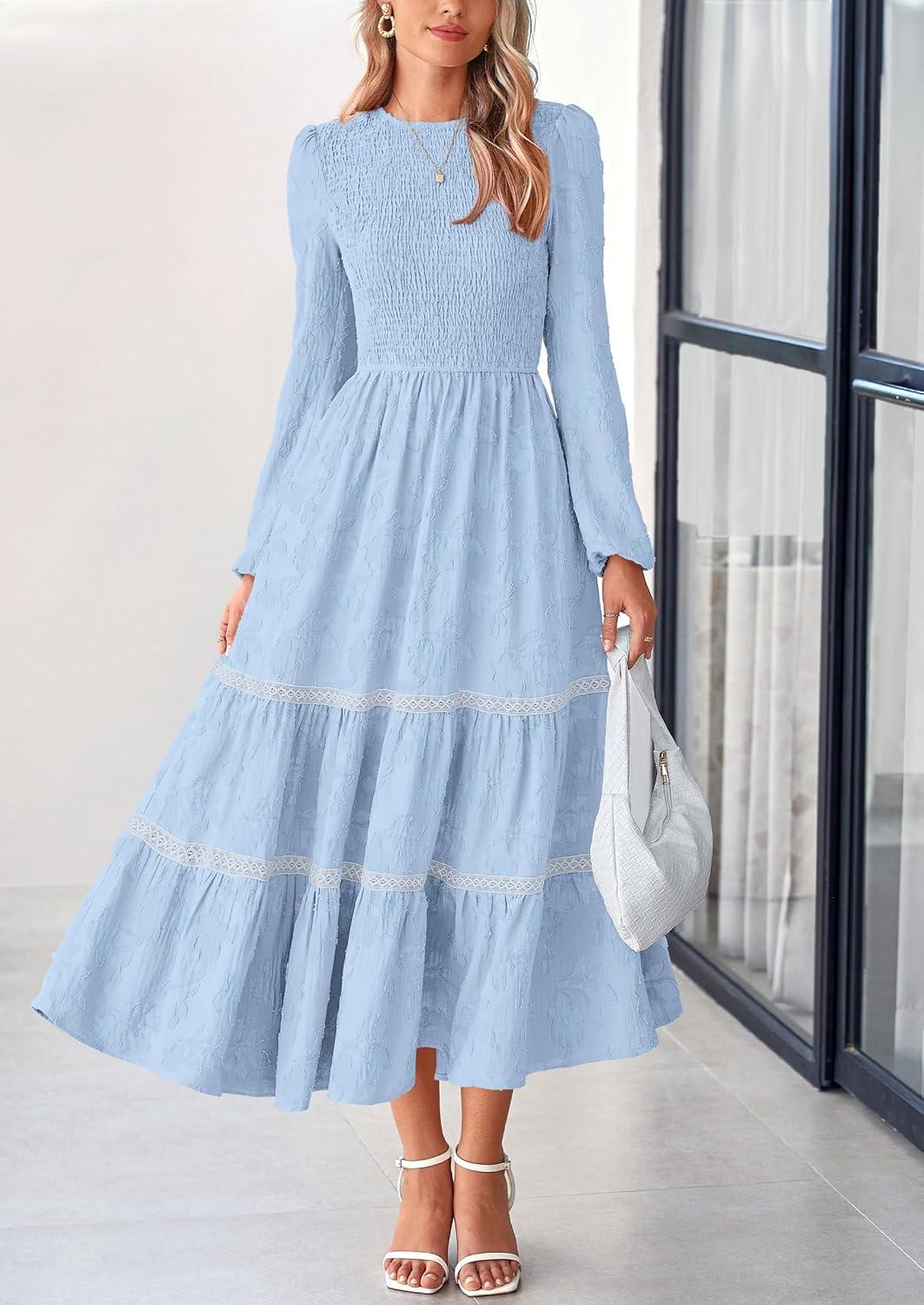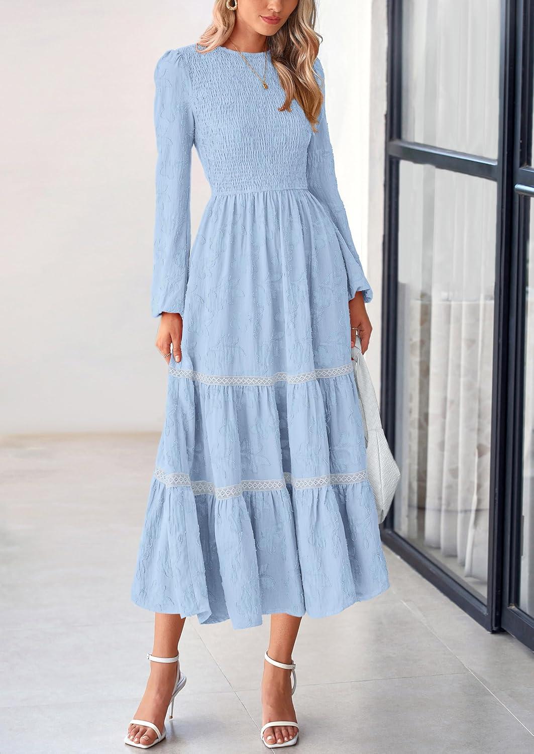 PRETTYGARDEN Long Sleeve Dress for Women 2025 Fall Elegant Modest Floral Boho Smocked Flowy Wedding Guest Midi Dresses(Light Blue)