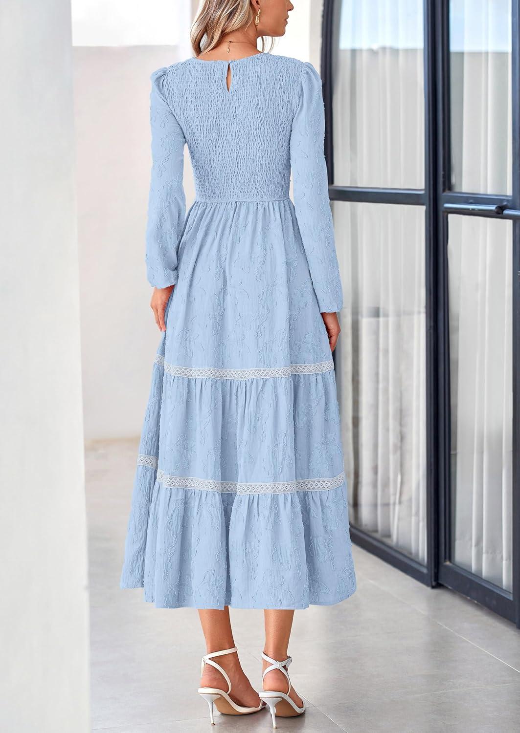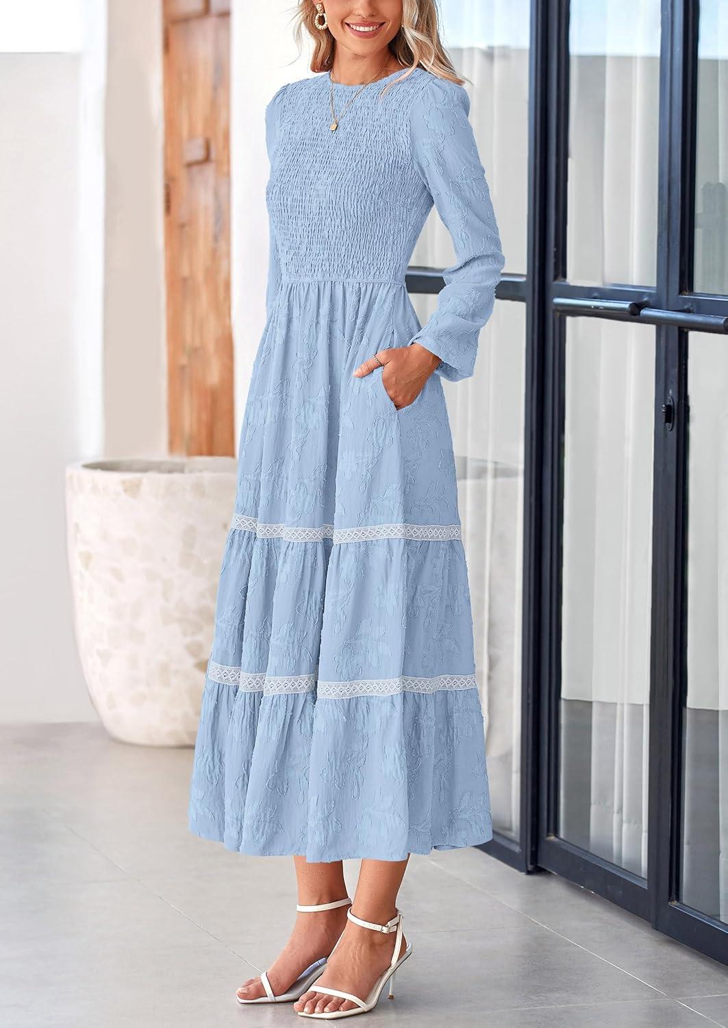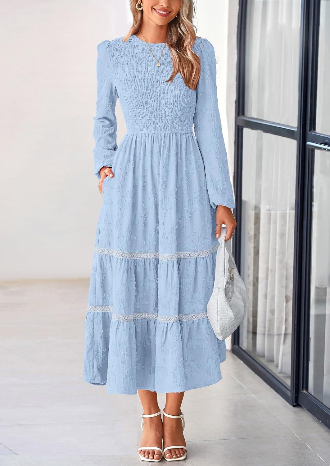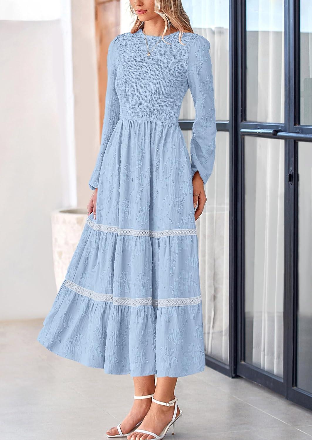 PRETTYGARDEN Long Sleeve Dress for Women 2025 Fall Elegant Modest Floral Boho Smocked Flowy Wedding Guest Midi Dresses(Light Blue)