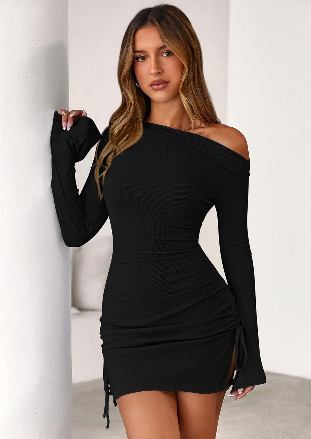 PRETTYGARDEN Long Sleeve Dress for Women Early Fall Fashion 2025 Cocktail Party Bodycon Off The Shoulder Mini Ruched Dresses(Black)