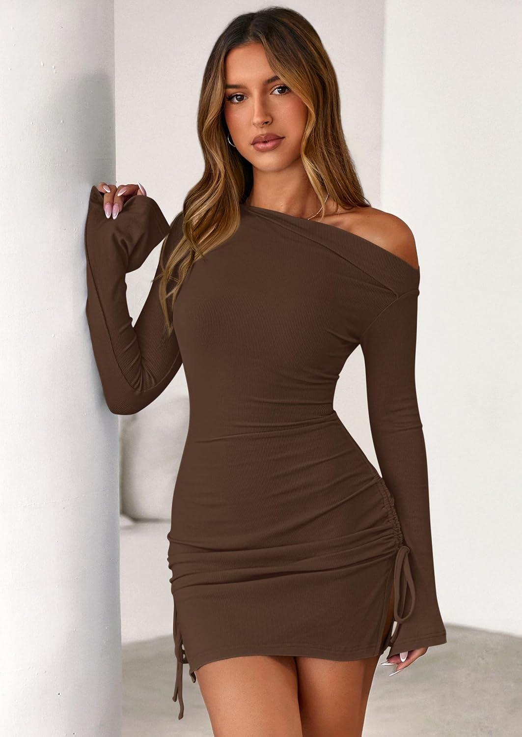 PRETTYGARDEN Long Sleeve Dress for Women Early Fall Fashion 2025 Cocktail Party Bodycon Off The Shoulder Mini Ruched Dresses(Brown)