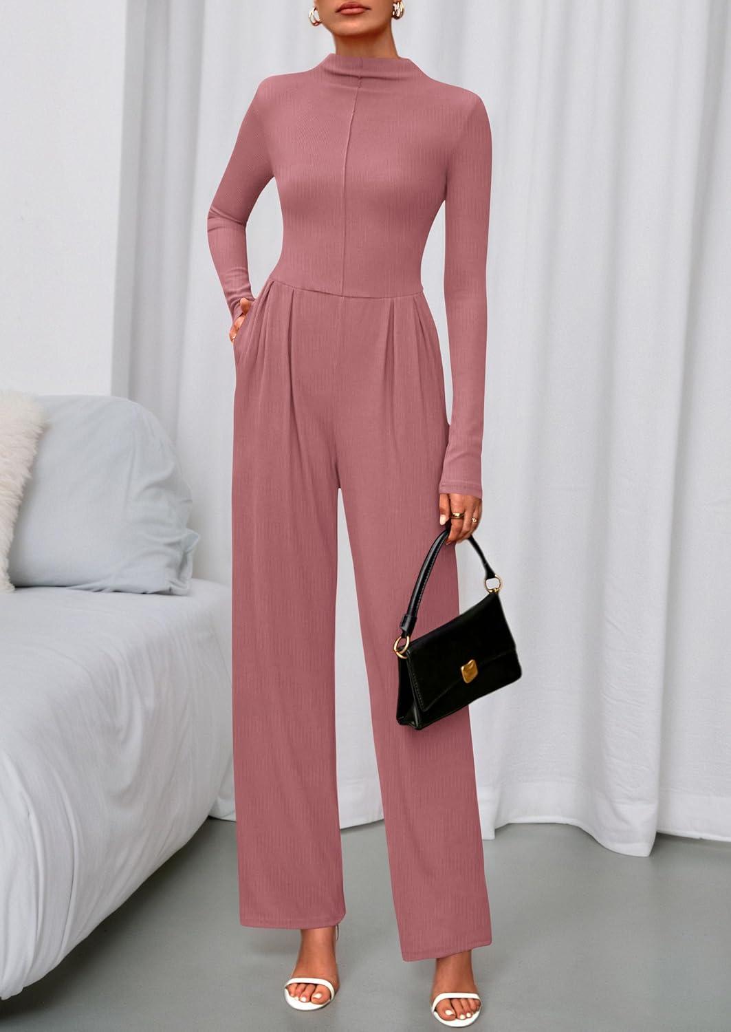 PRETTYGARDEN Long Sleeve Jumpsuit for Women 2025 Fall Date Night Rompers Dressy Casual One Piece Mock Neck Jumpsuits Pockets(Pink)