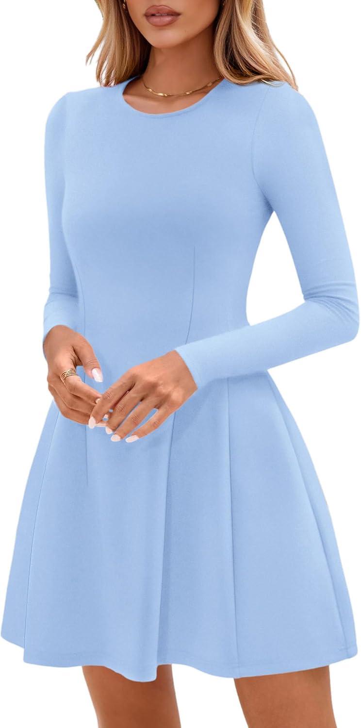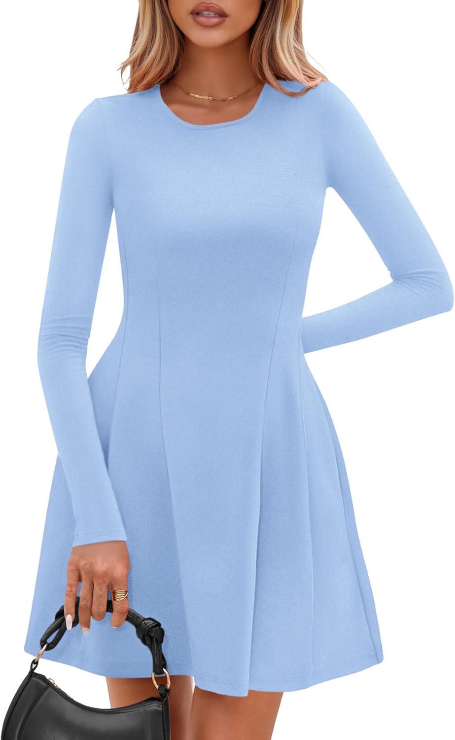 PRETTYGARDEN Long Sleeve Mini Dress for Women 2025 Fall Crewneck Knit Pleated Babydoll A Line Soft Casual Short Party Dresses(Light Blue)