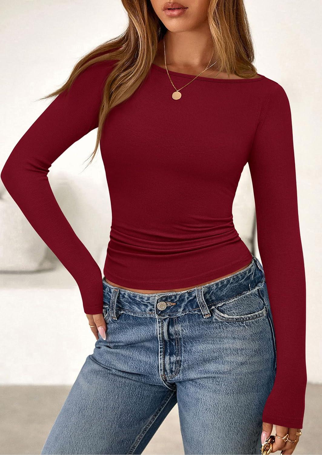 Get the PRETTYGARDEN Long Sleeve Shirts for Women 2025 Fall Boat Neck Ribbed Knit Ruched Fitted Going Out Tops Casual Basic Tees(Burgundy) you want at a discounted price during our markdown sale event.