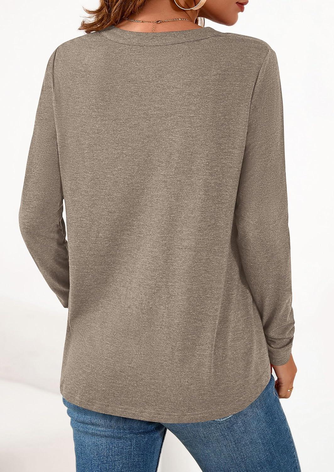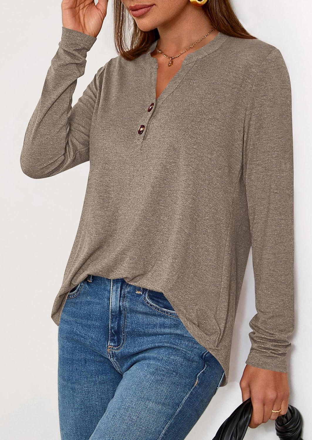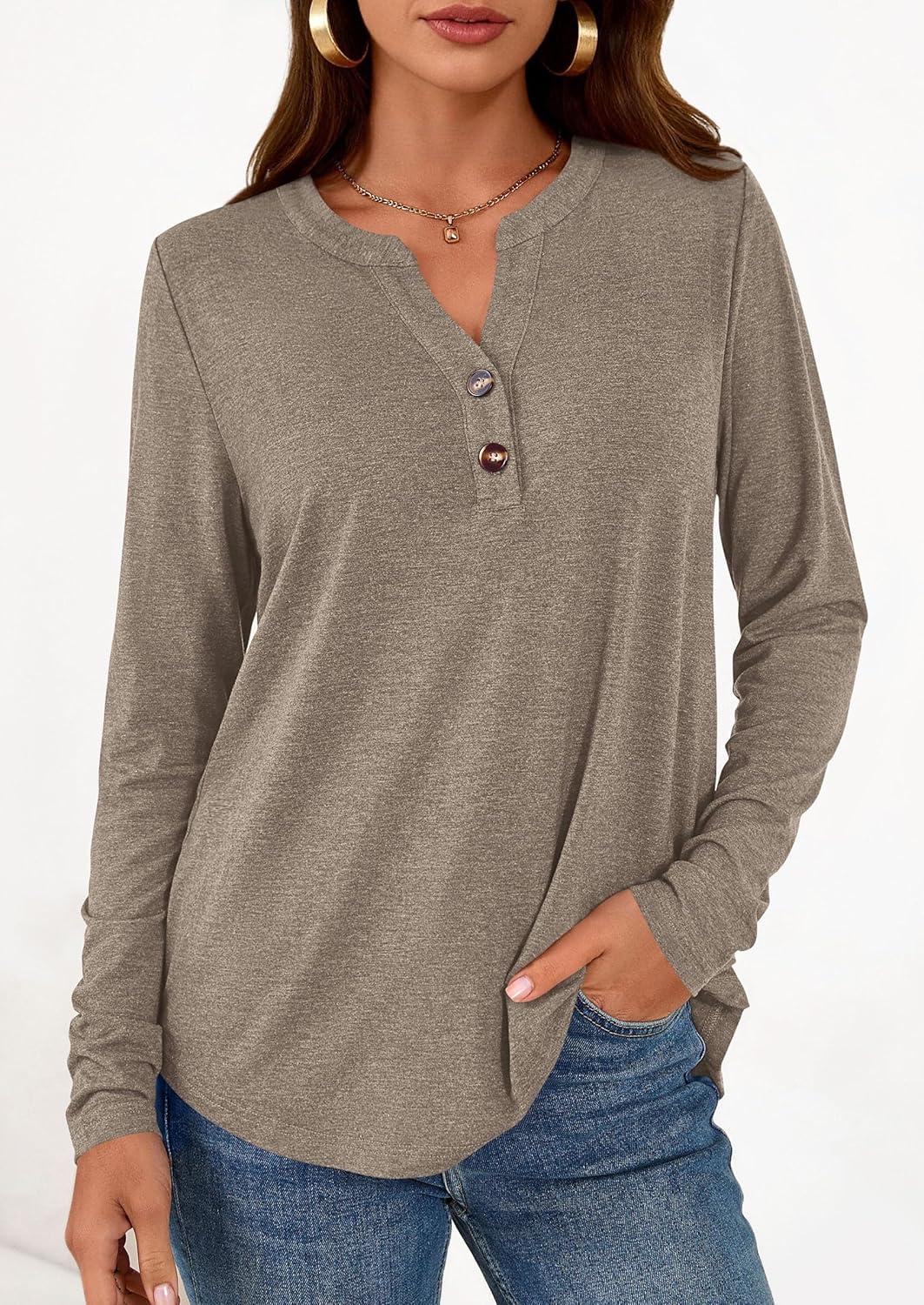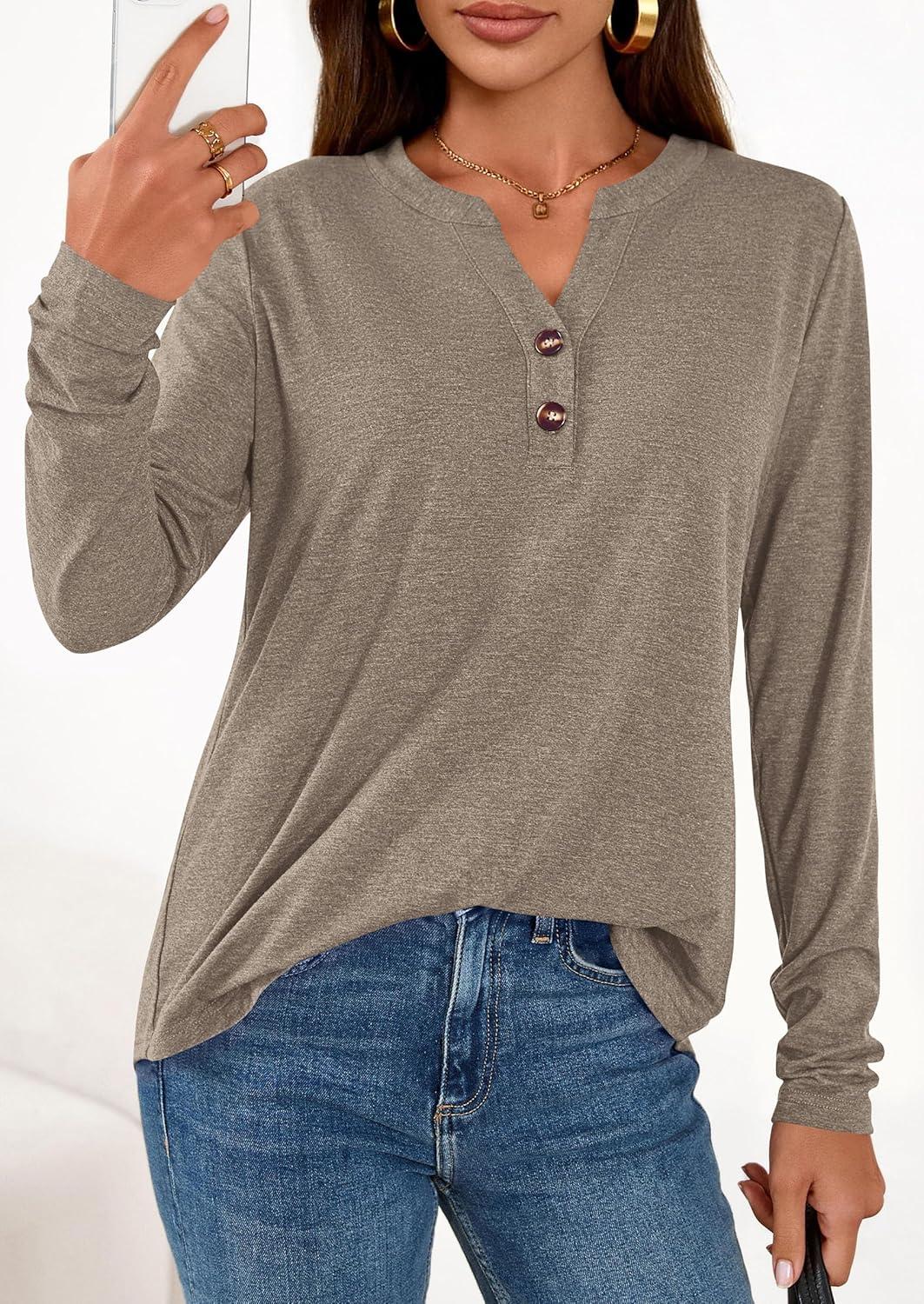 PRETTYGARDEN Long Sleeve Shirts for Women 2025 Fall Fashion Clothing Henley Tops Trendy Dressy Casual Blouses Work Outfits(Khaki)