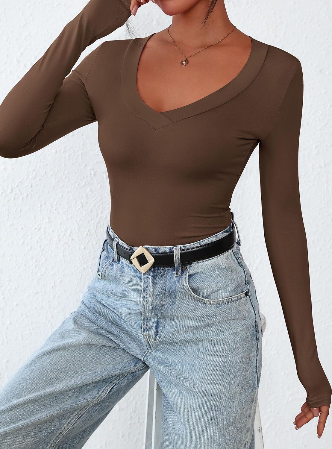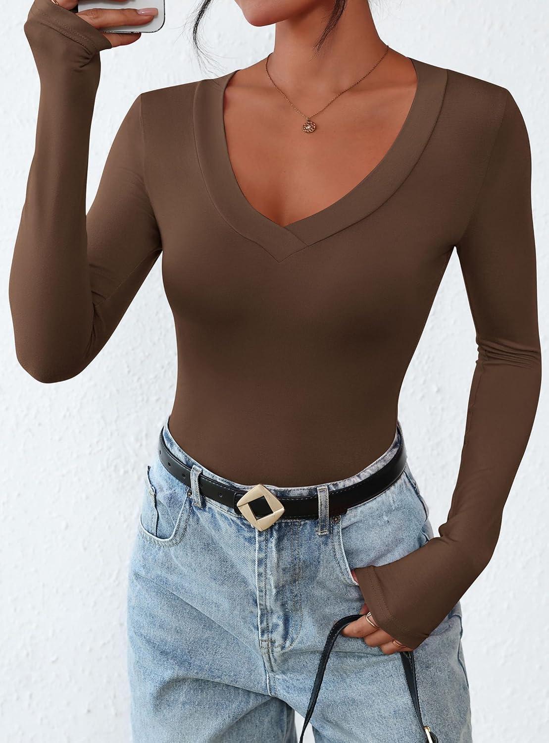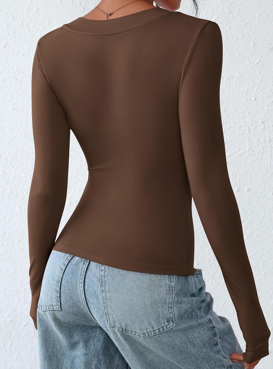 PRETTYGARDEN Long Sleeve Shirts for Women 2025 Fall Fashion V Neck Going Out Tops Slim Fit Basic Tees Y2K Clothes(Brown)
