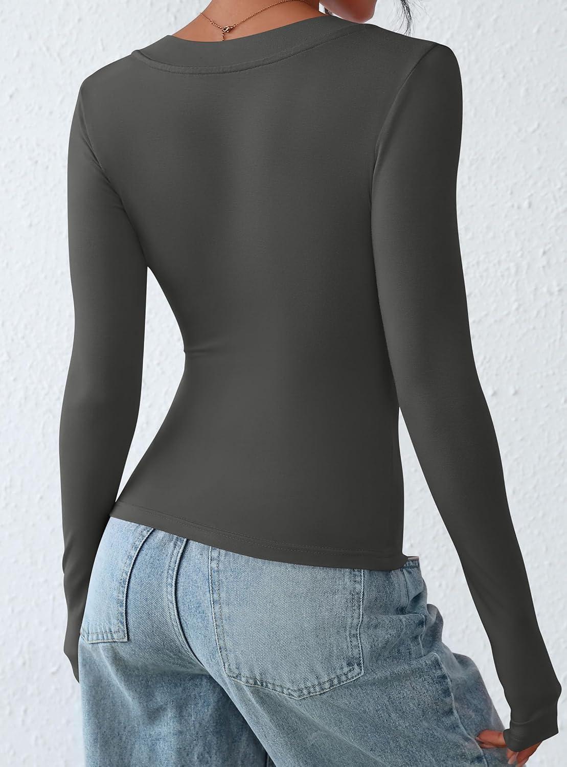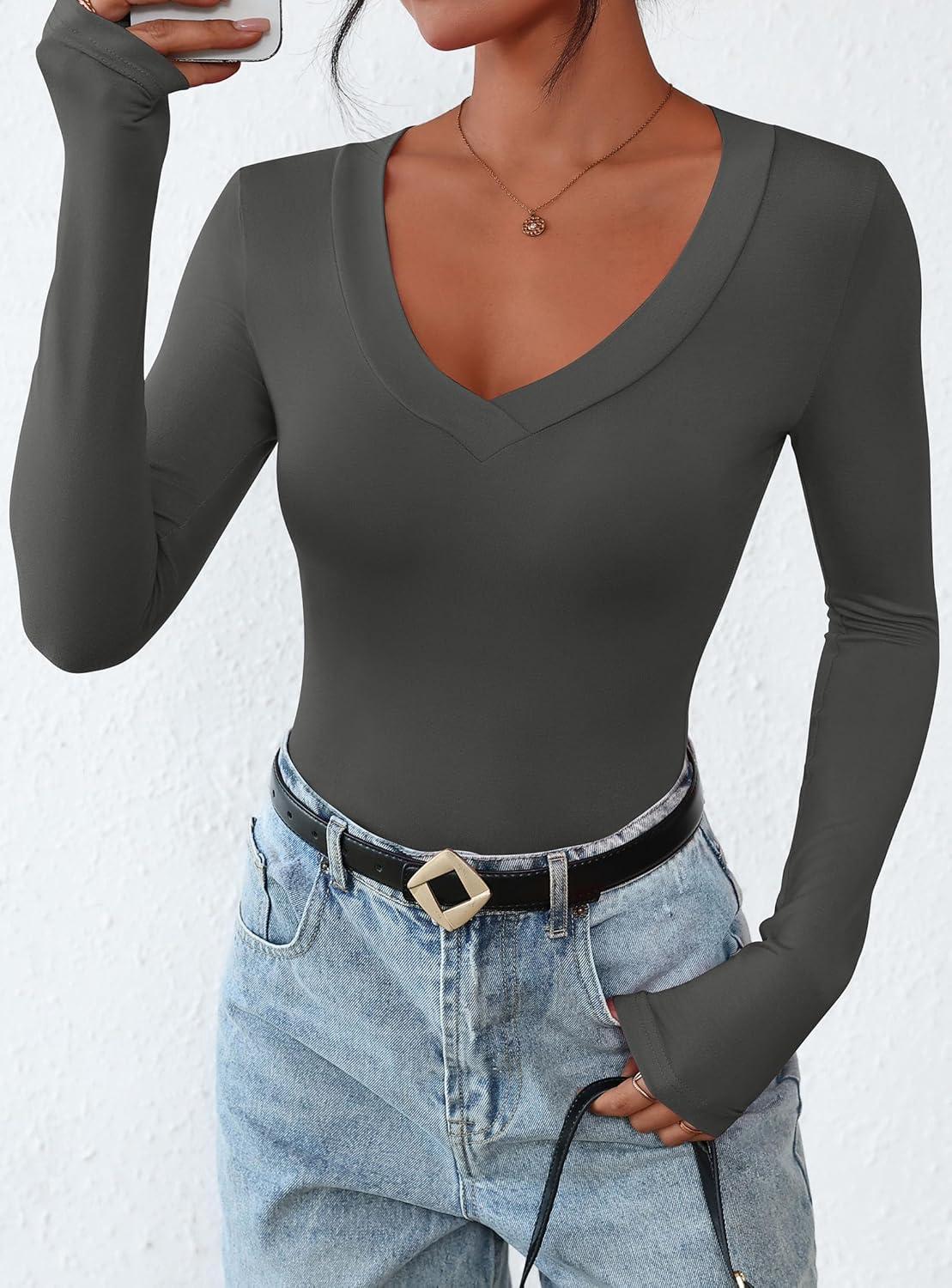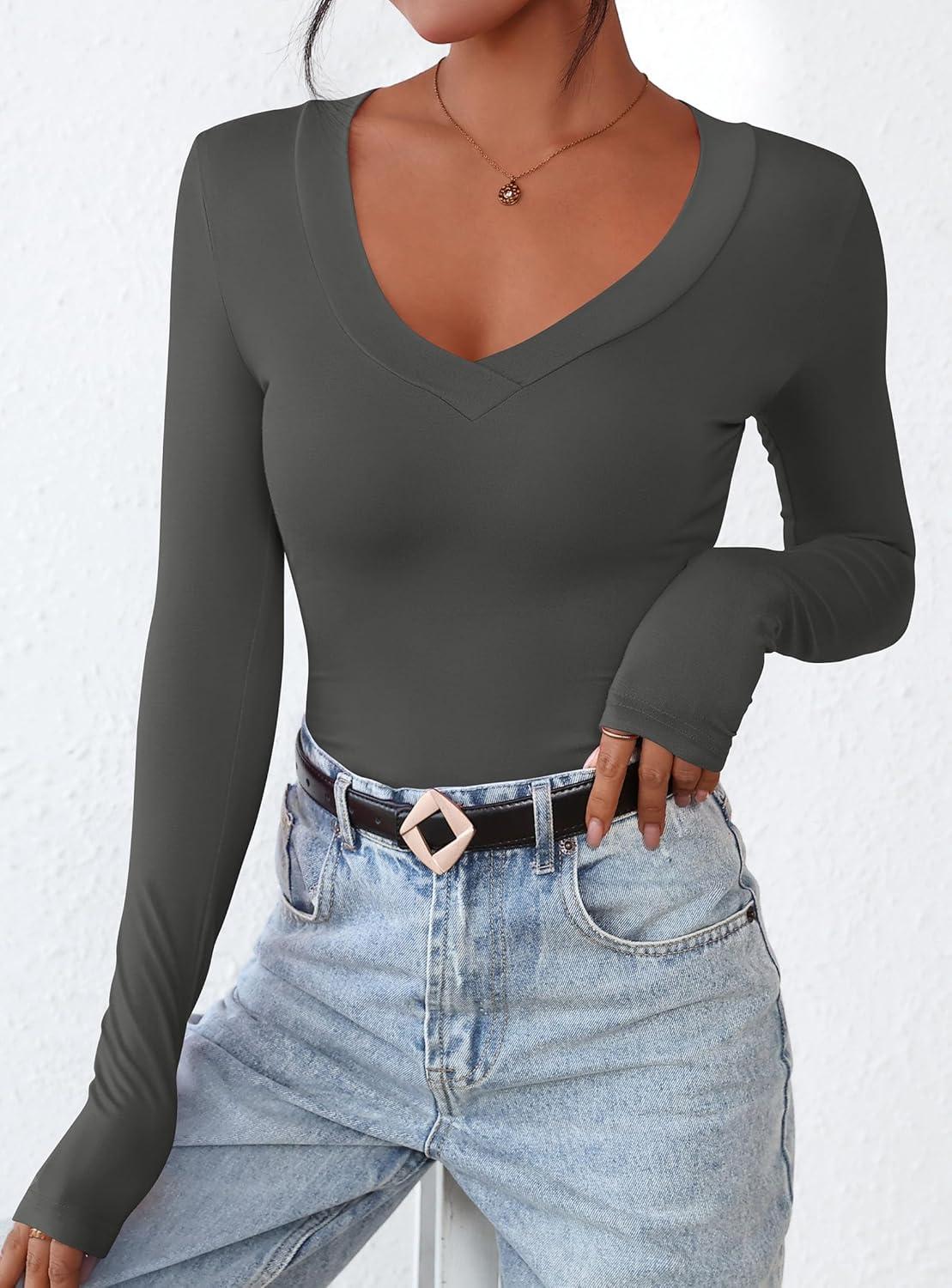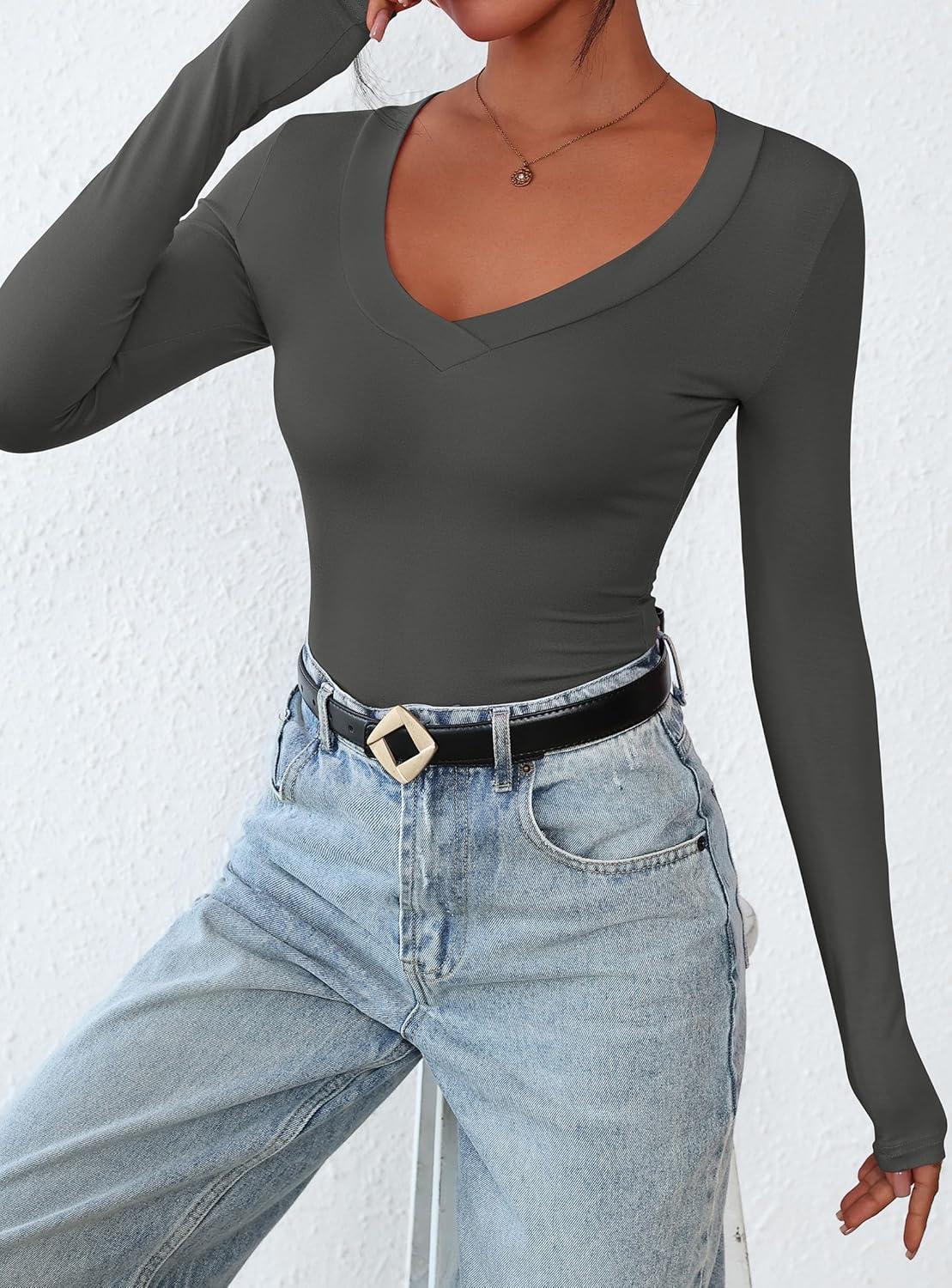 PRETTYGARDEN Long Sleeve Shirts for Women 2025 Fall Fashion V Neck Going Out Tops Slim Fit Basic Tees Y2K Clothes(Dark Grey)