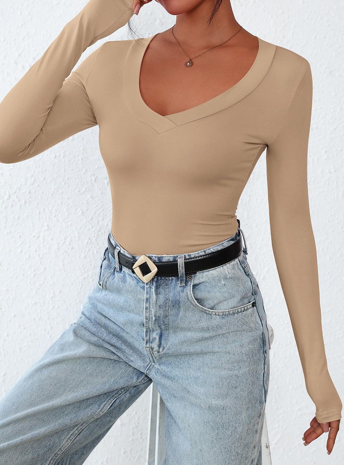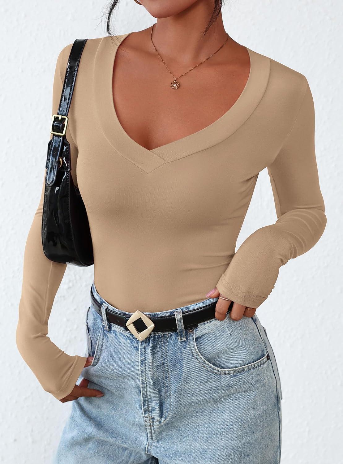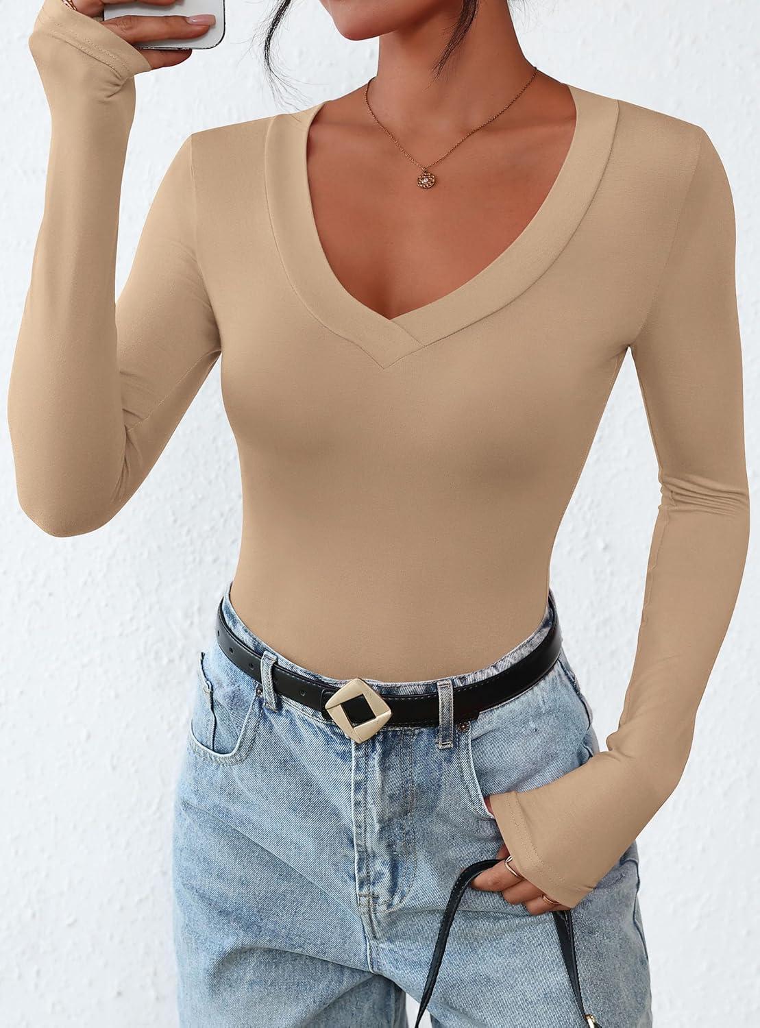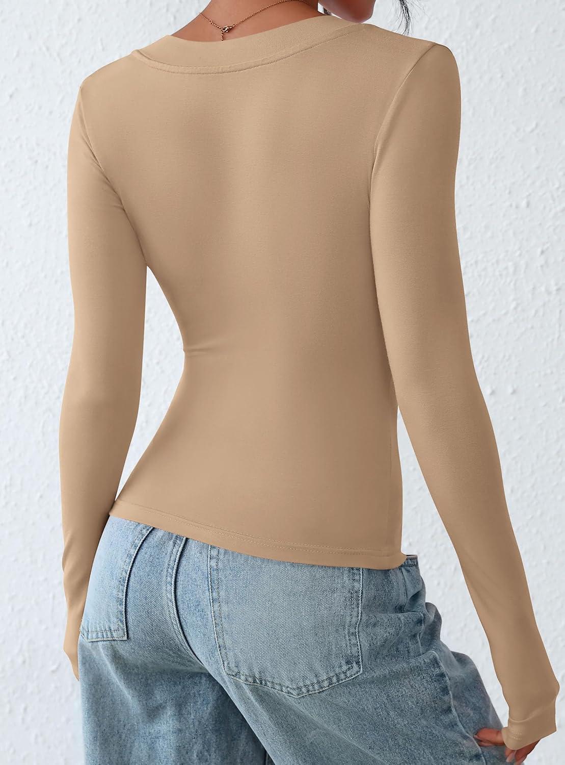 PRETTYGARDEN Long Sleeve Shirts for Women 2025 Fall Fashion V Neck Going Out Tops Slim Fit Basic Tees Y2K Clothes(Khaki)