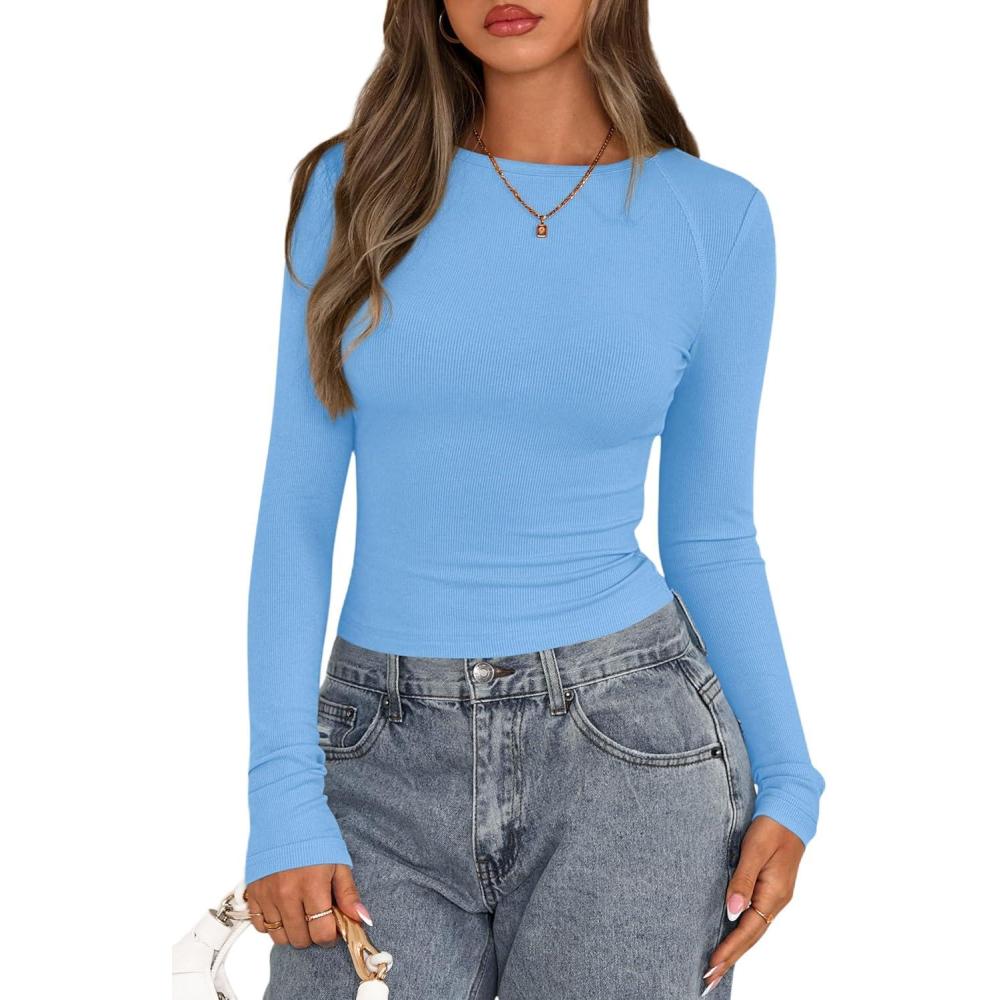 PRETTYGARDEN Long Sleeve Shirts for Women 2025 Fall Going Out Tops Casual Ribbed Knit Slim Fitted Basic Tees Y2K Clothes(Light Blue)