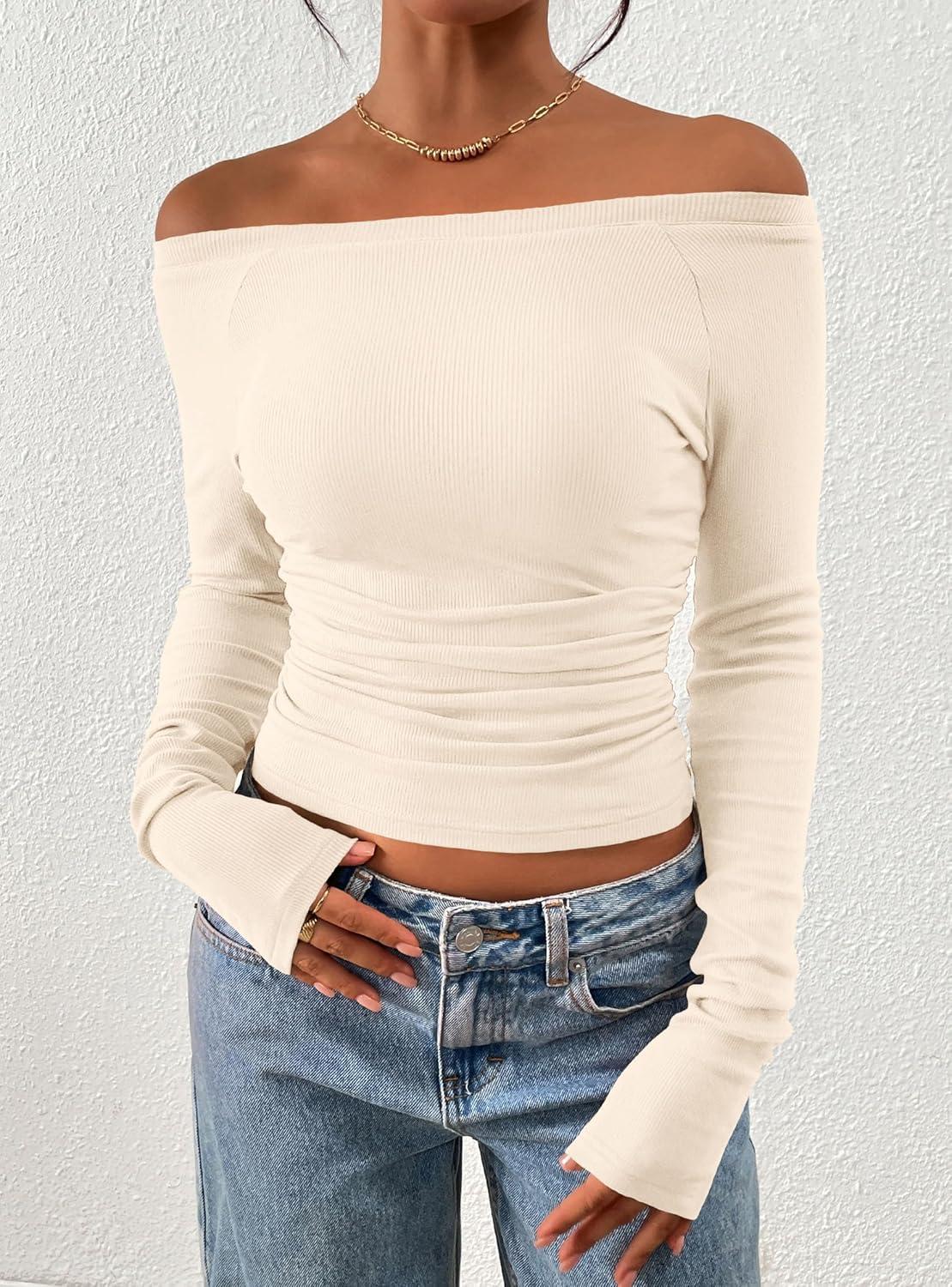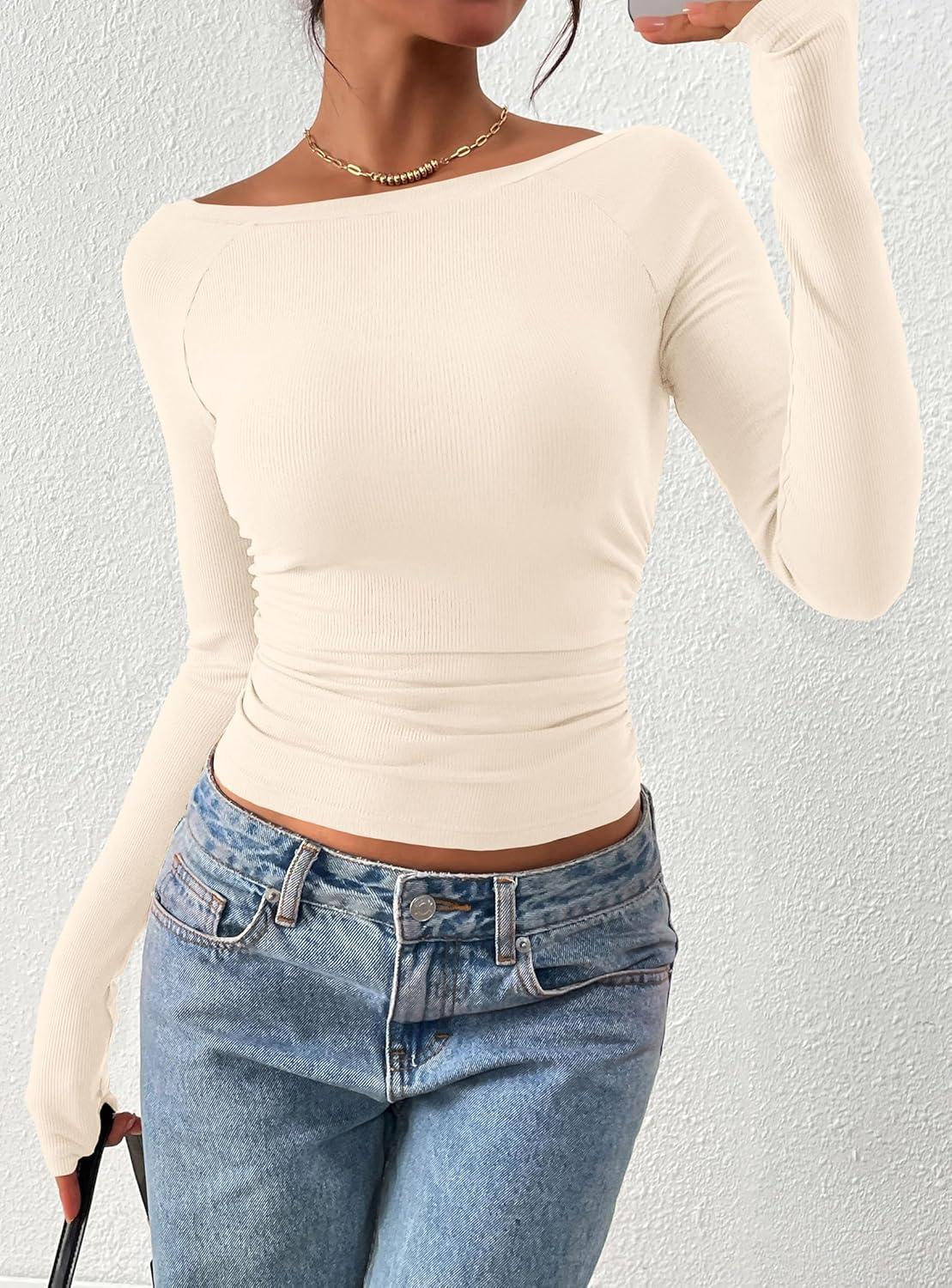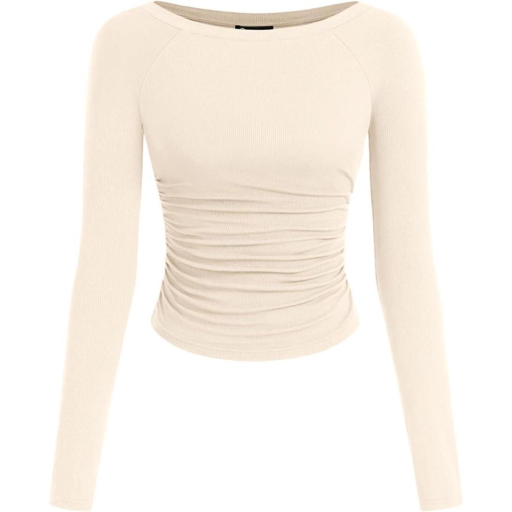 PRETTYGARDEN Long Sleeve Shirts for Women 2025 Fall Ruched Sides Boat Neck Basic Tee Casual Fitted Ribbed Knit Crop Tops(Beige)