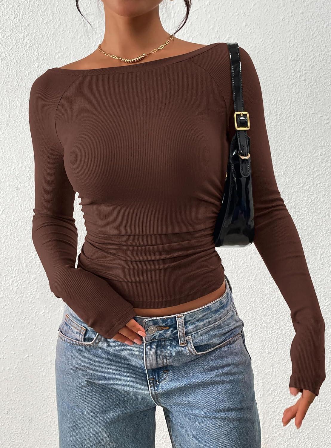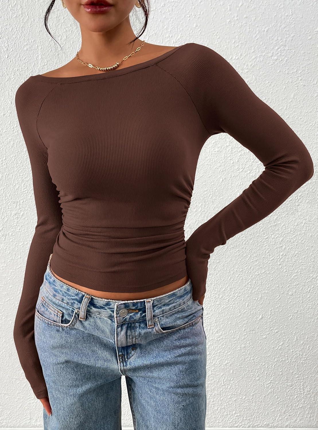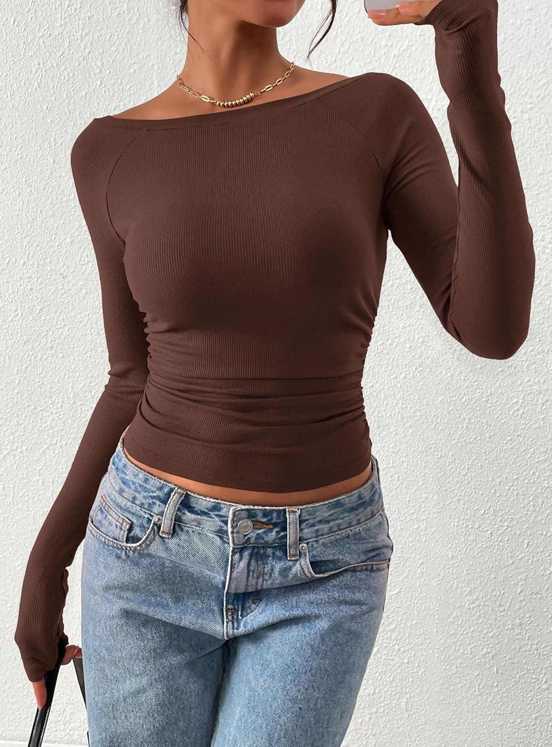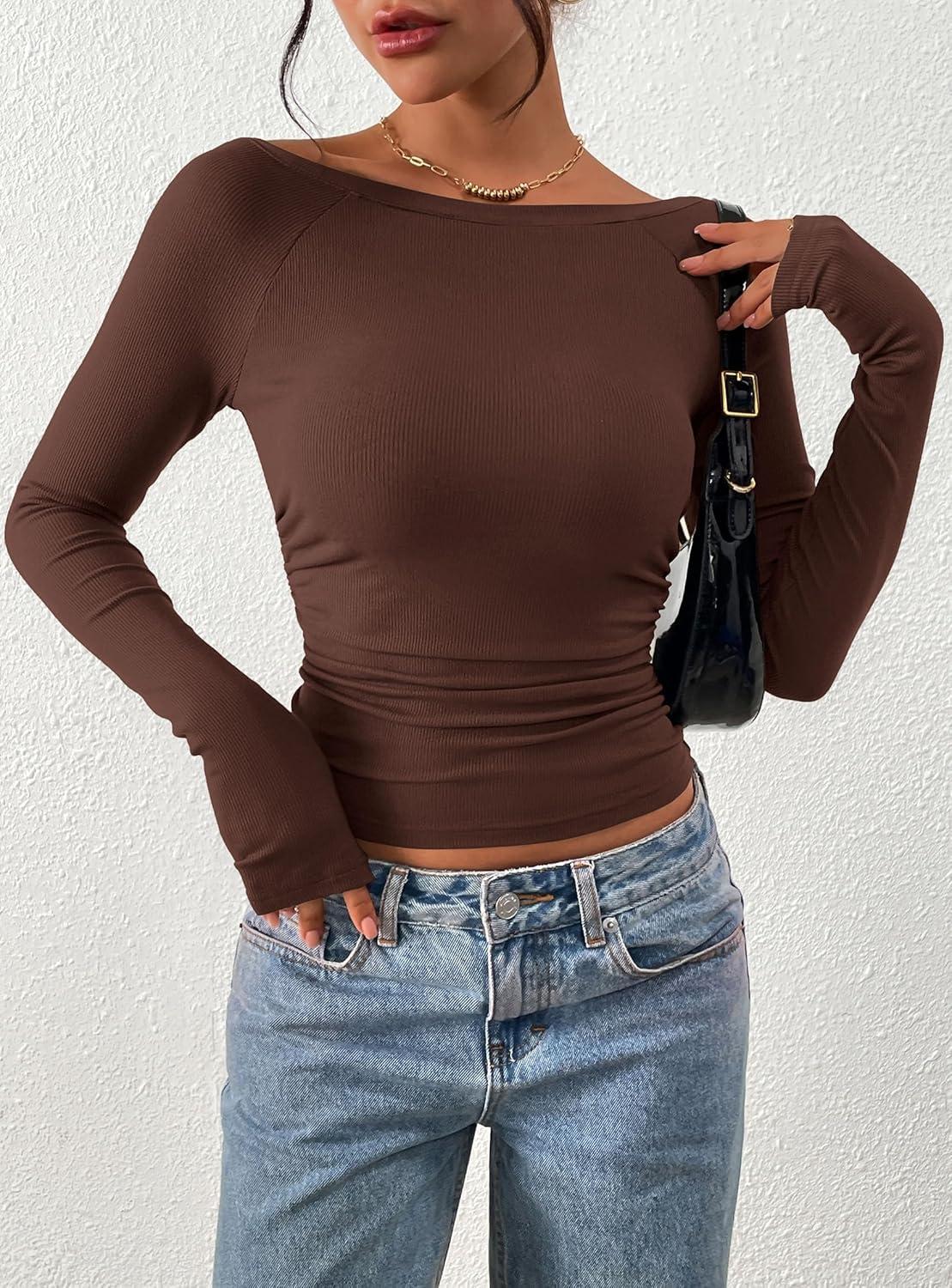 PRETTYGARDEN Long Sleeve Shirts for Women 2025 Fall Ruched Sides Boat Neck Basic Tee Casual Fitted Ribbed Knit Crop Tops(Brown)