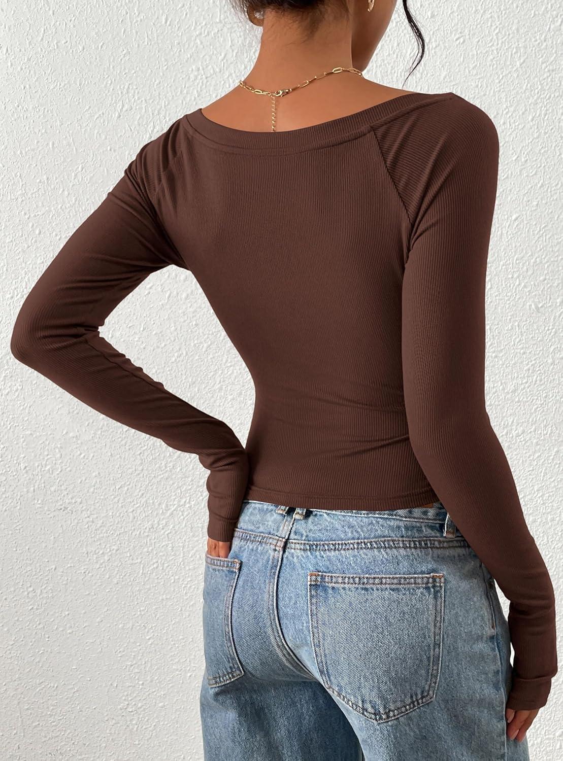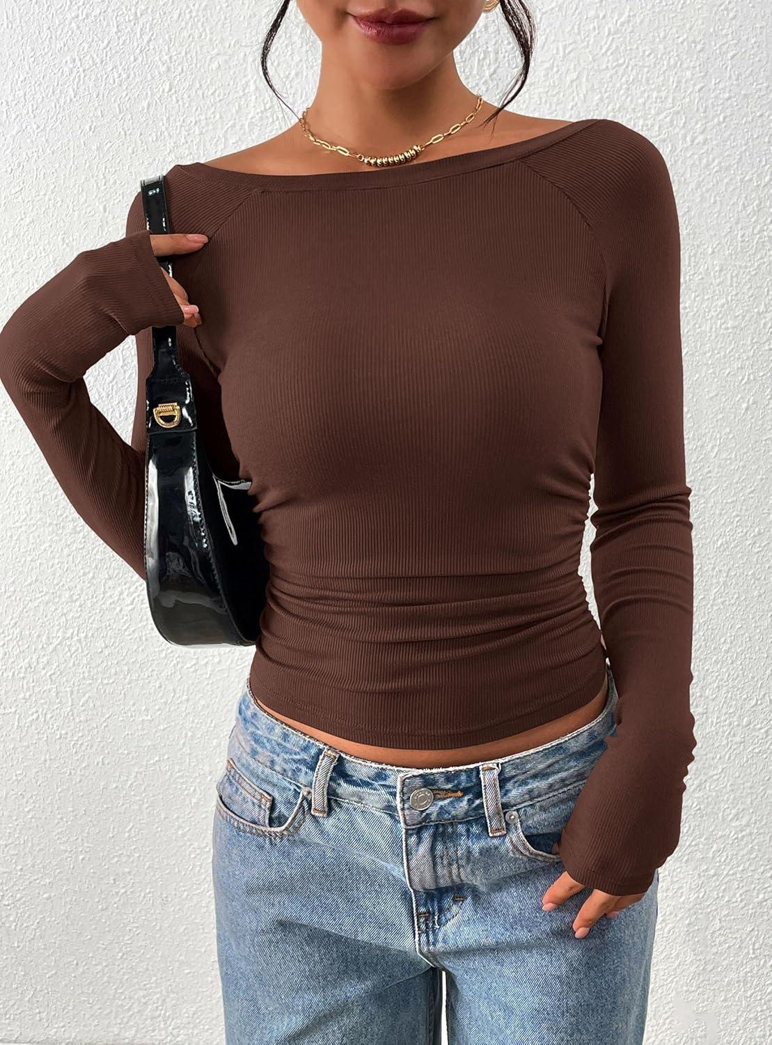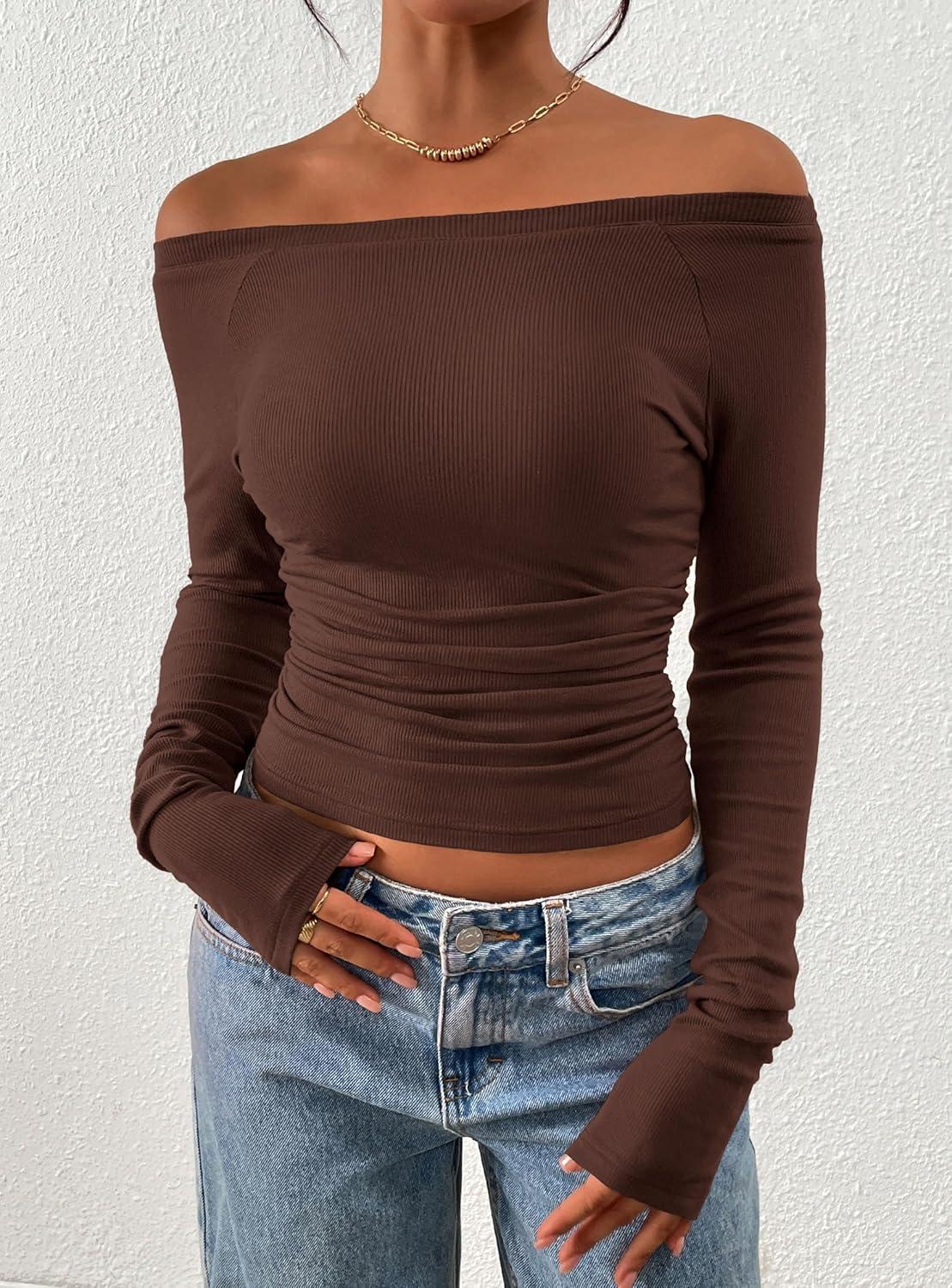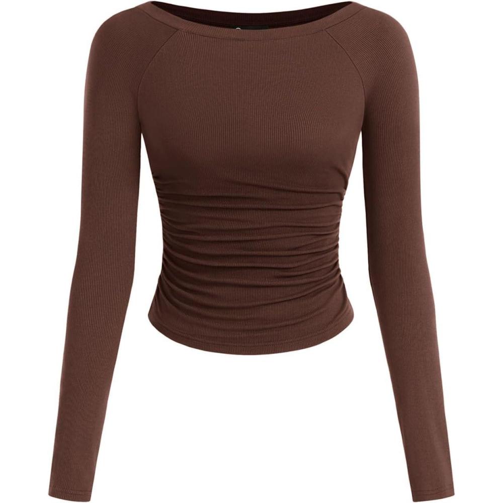 PRETTYGARDEN Long Sleeve Shirts for Women 2025 Fall Ruched Sides Boat Neck Basic Tee Casual Fitted Ribbed Knit Crop Tops(Brown)