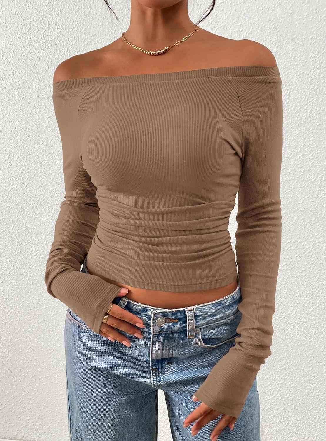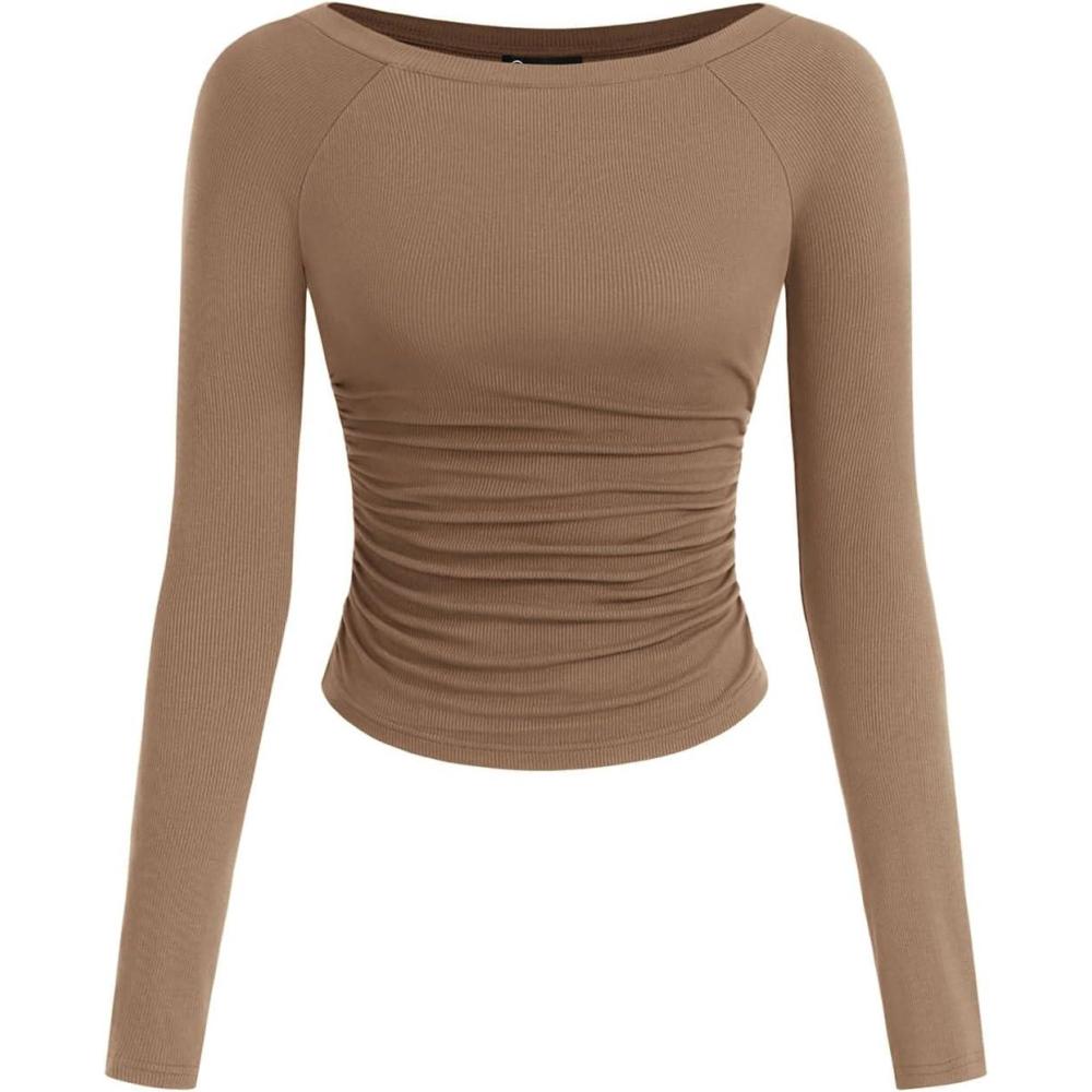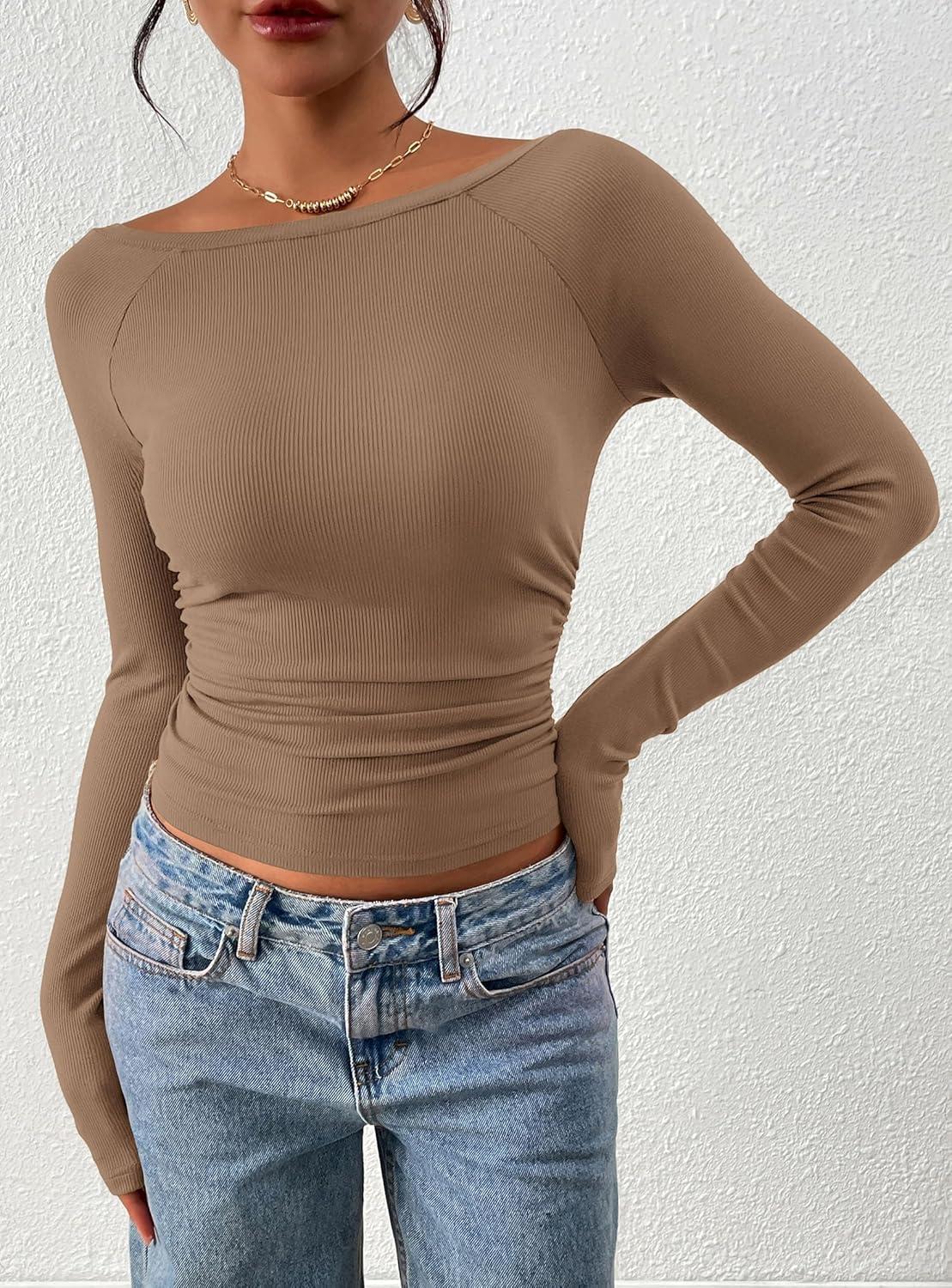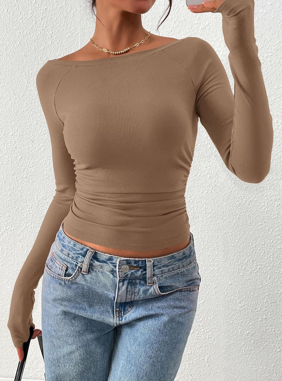 PRETTYGARDEN Long Sleeve Shirts for Women 2025 Fall Ruched Sides Boat Neck Basic Tee Casual Fitted Ribbed Knit Crop Tops(Brown)