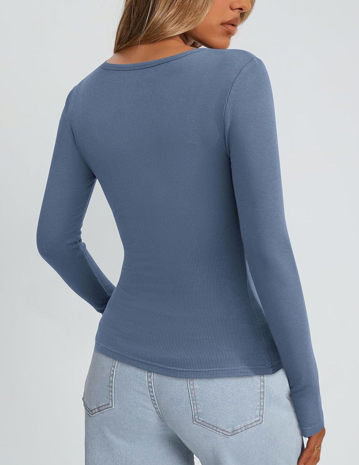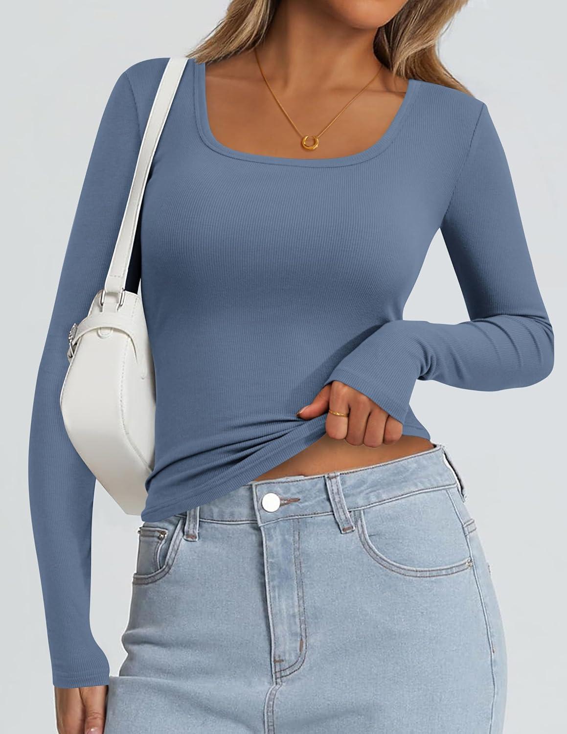 PRETTYGARDEN Long Sleeve Shirts for Women Fall Clothes 2025 Ribbed Basic Tees Scoop Neck Going Out Tops Fashion Clothing(Blue Grey)