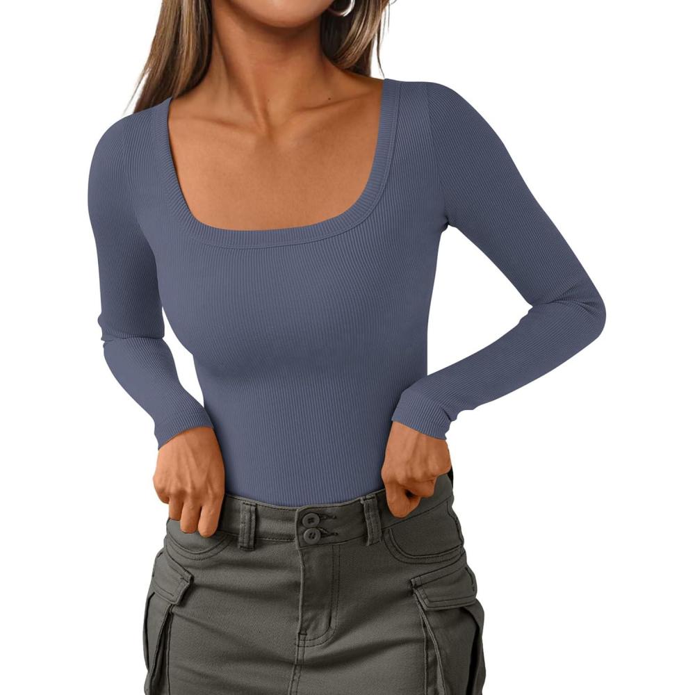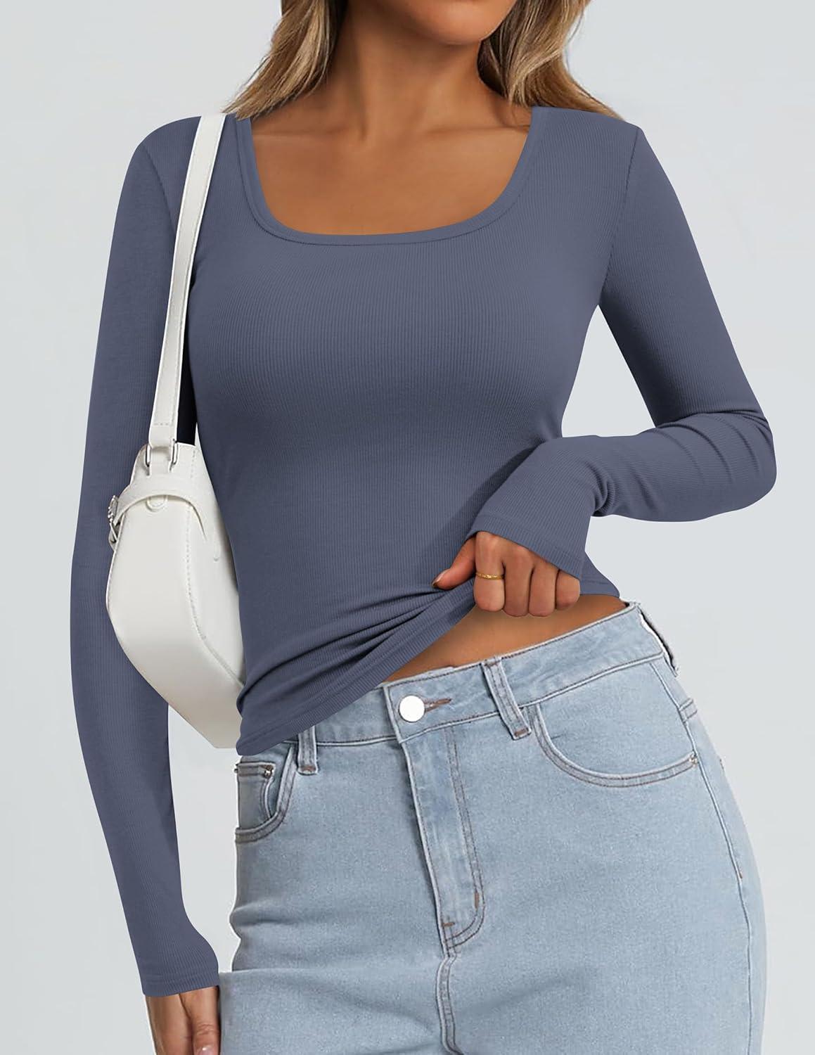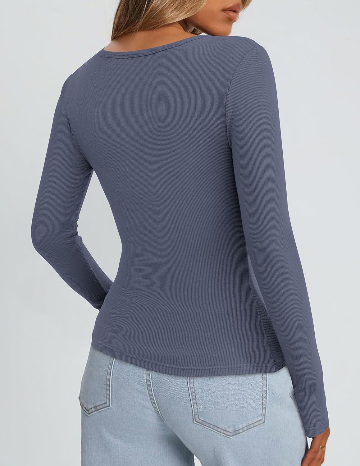 PRETTYGARDEN Long Sleeve Shirts for Women Fall Clothes 2025 Ribbed Basic Tees Scoop Neck Going Out Tops Fashion Clothing(Dark Dusty Blue)