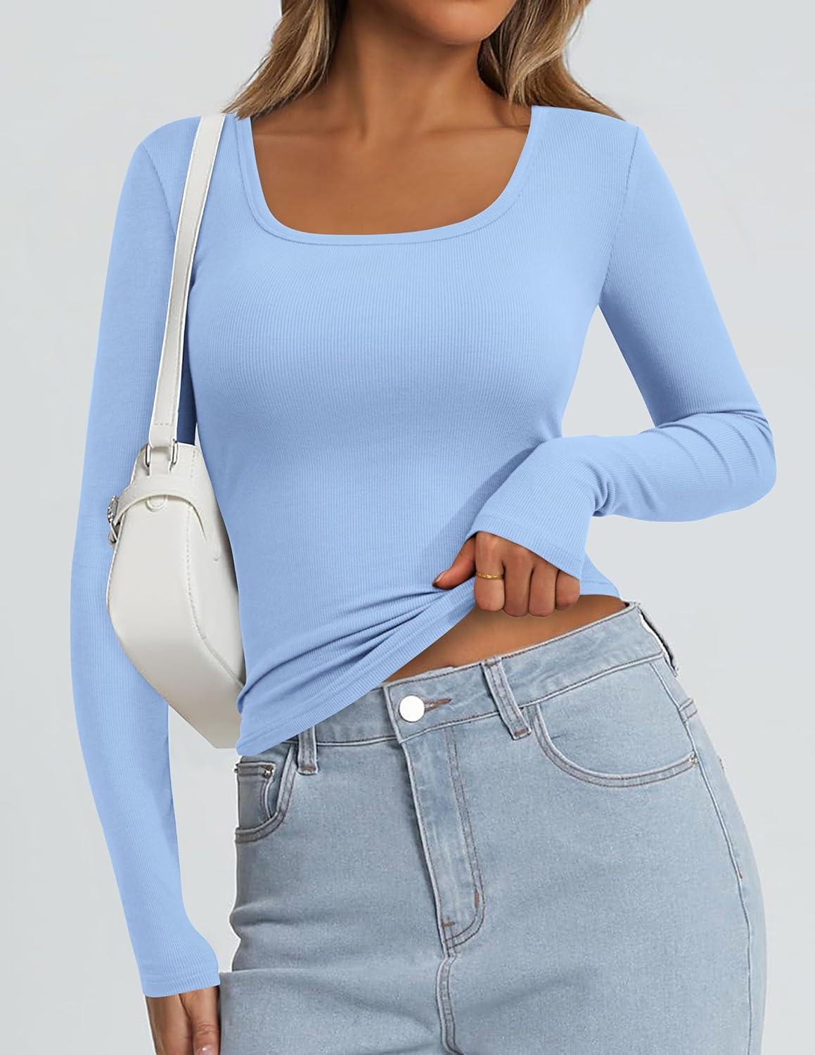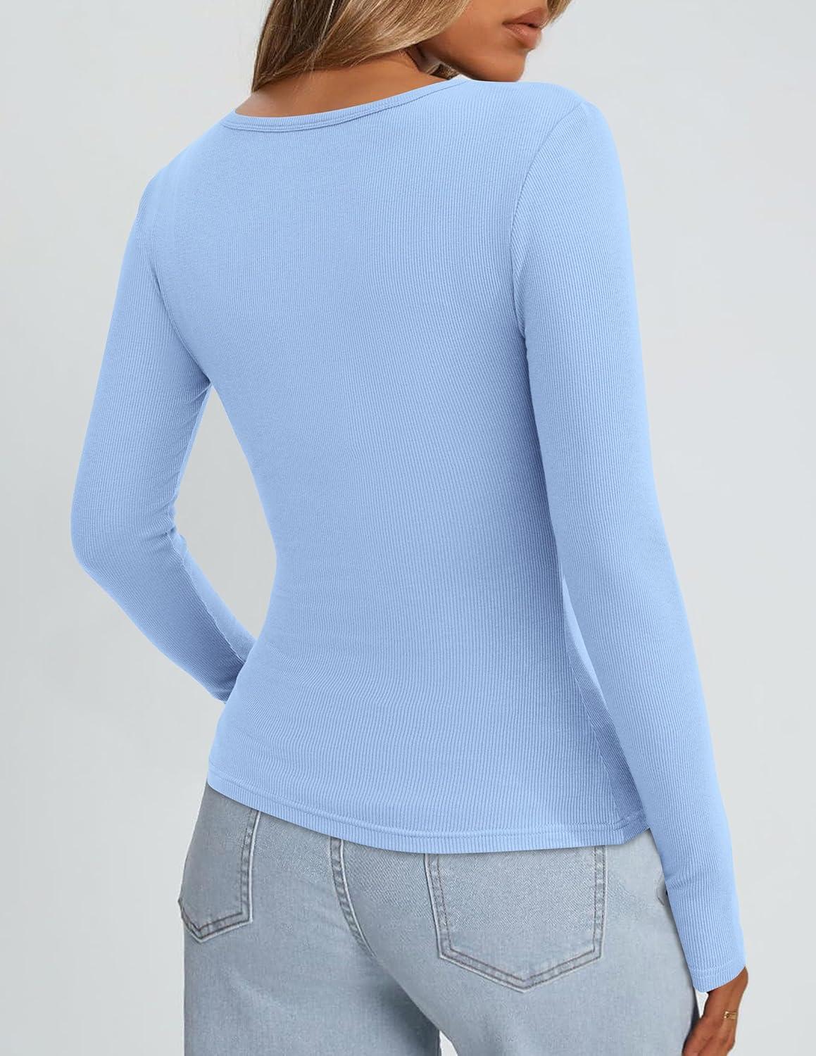 PRETTYGARDEN Long Sleeve Shirts for Women Fall Clothes 2025 Ribbed Basic Tees Scoop Neck Going Out Tops Fashion Clothing(Light Blue)