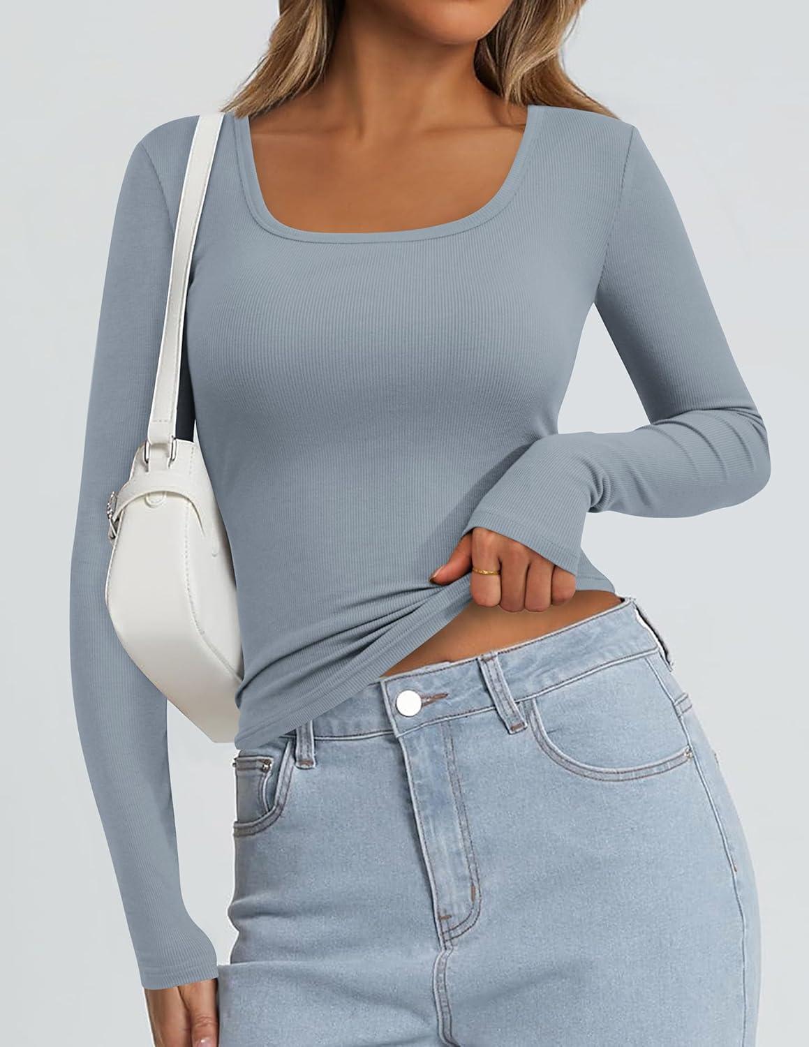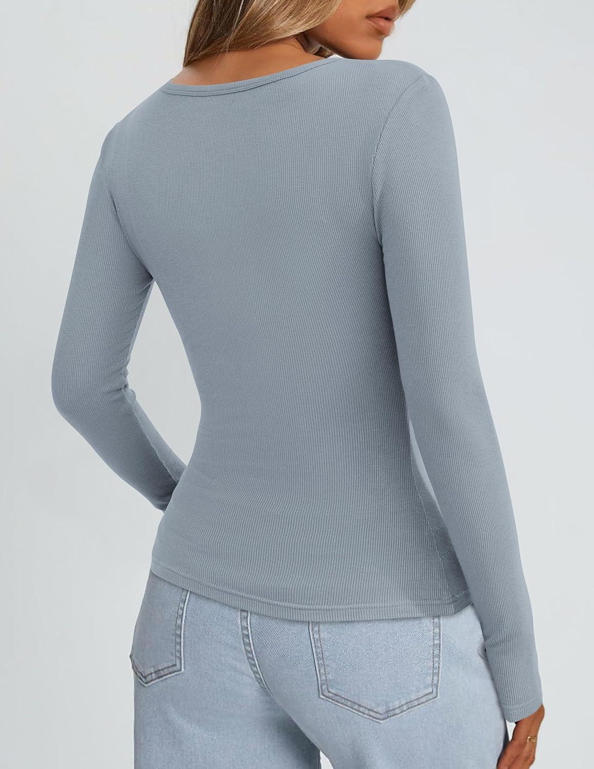 PRETTYGARDEN Long Sleeve Shirts for Women Fall Clothes 2025 Ribbed Basic Tees Scoop Neck Going Out Tops Fashion Clothing(Light Grey)