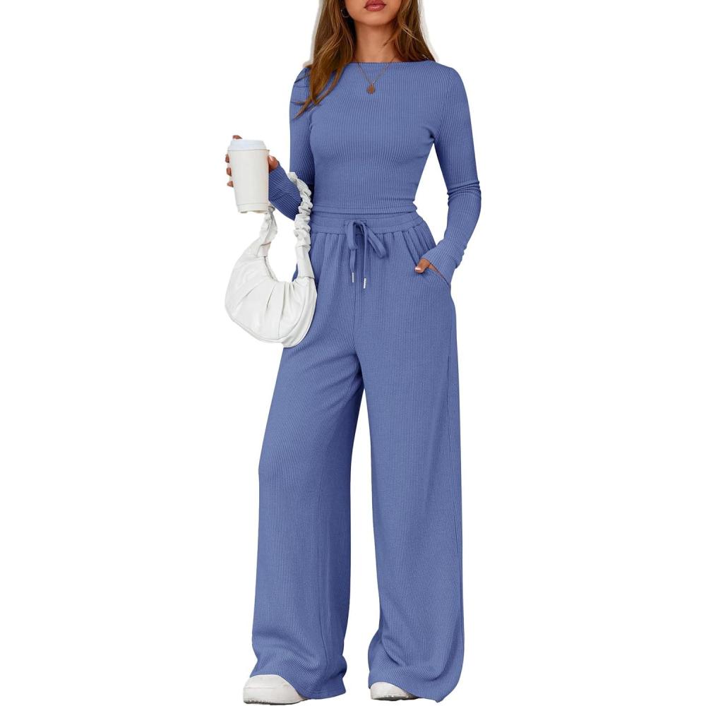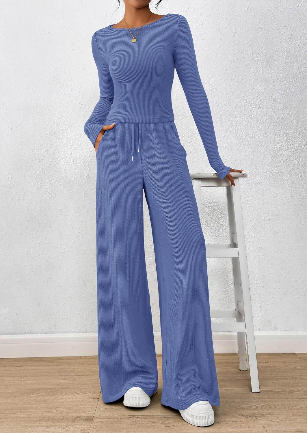 PRETTYGARDEN Matching Sets Women Clothing 2025 Fall Fashion Travel 2 Piece Lounge Sets Long Sleeve Crop Top Wide Leg Pants(Blue)