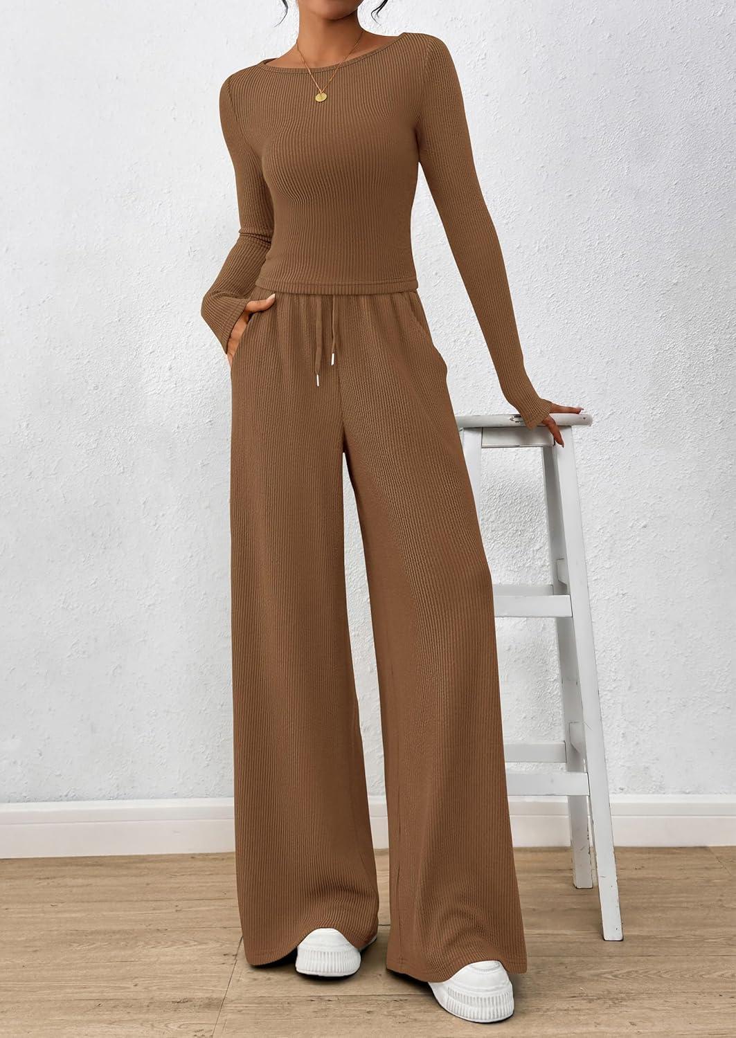 PRETTYGARDEN Matching Sets Women Clothing 2025 Fall Fashion Travel 2 Piece Lounge Sets Long Sleeve Crop Top Wide Leg Pants(Dark Khaki)