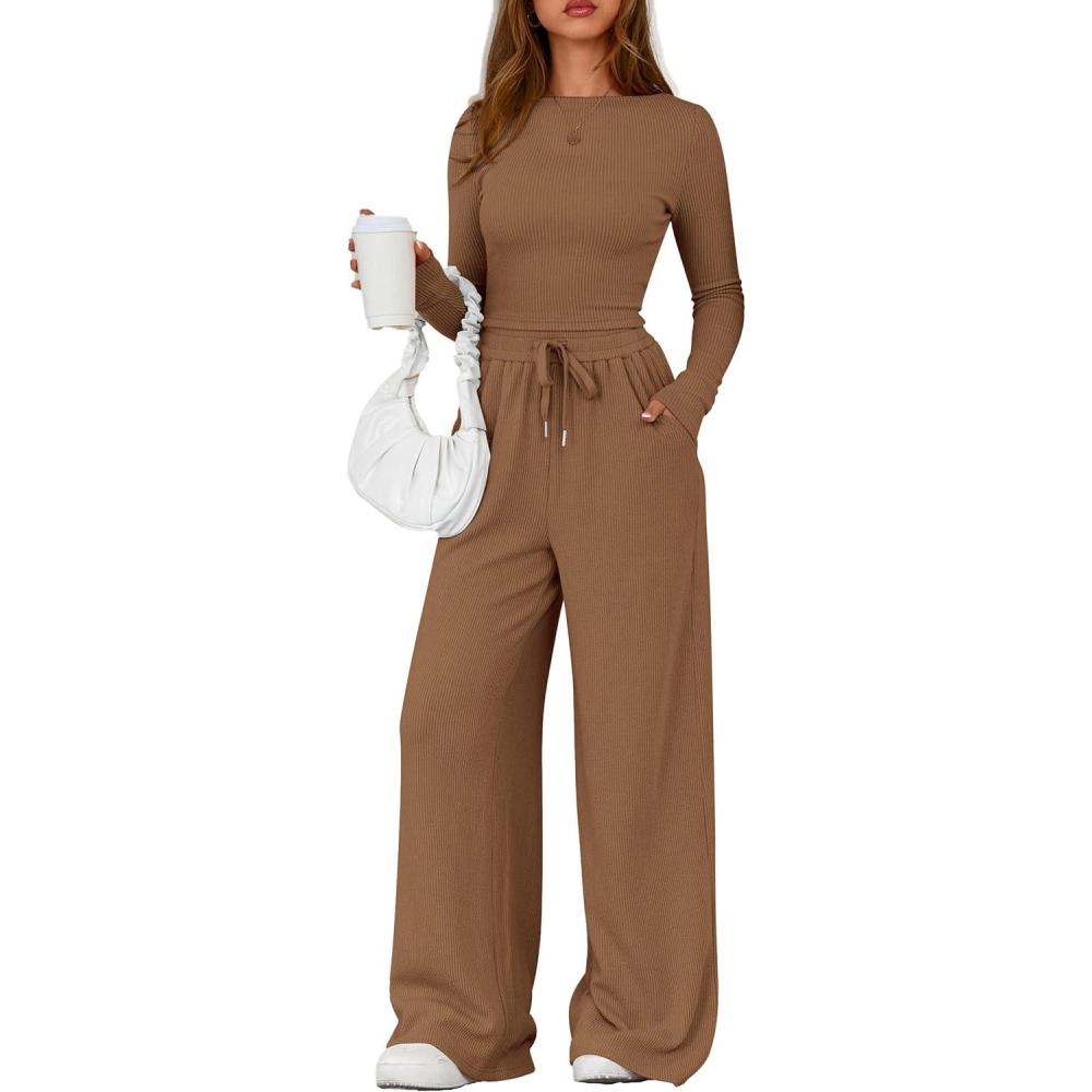imagePRETTYGARDEN Matching Sets Women Clothing 2025 Fall Fashion Travel 2 Piece Lounge Sets Long Sleeve Crop Top Wide Leg PantsDark Khaki