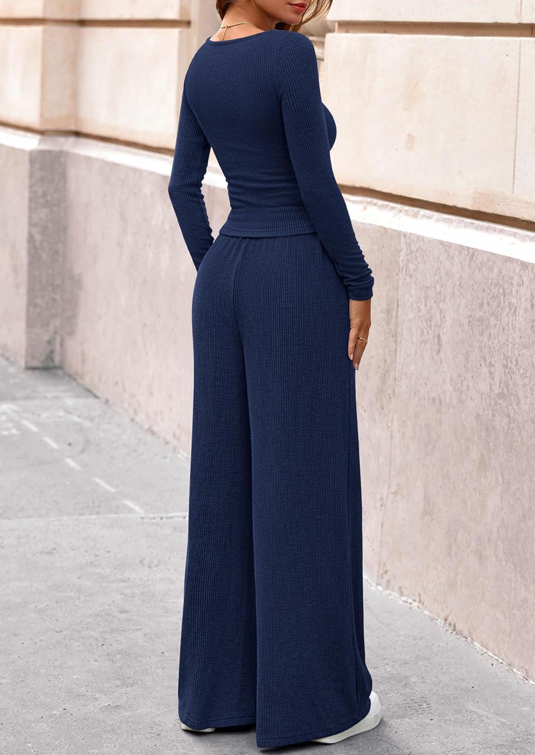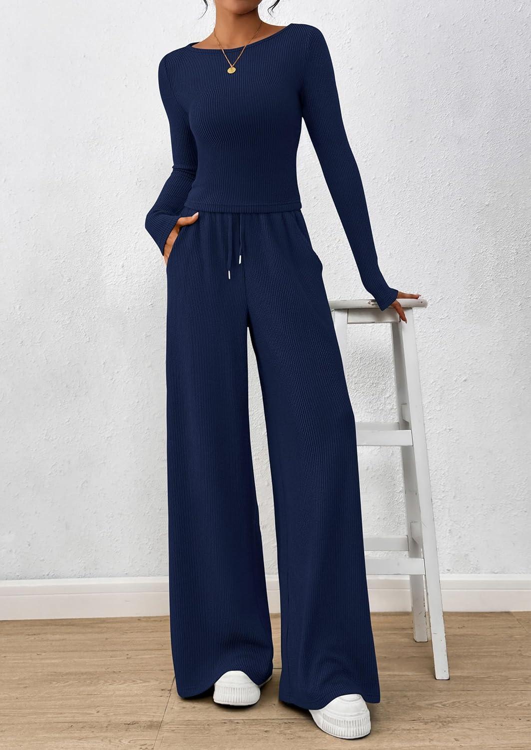 PRETTYGARDEN Matching Sets Women Clothing 2025 Fall Fashion Travel 2 Piece Lounge Sets Long Sleeve Crop Top Wide Leg Pants(Navy)