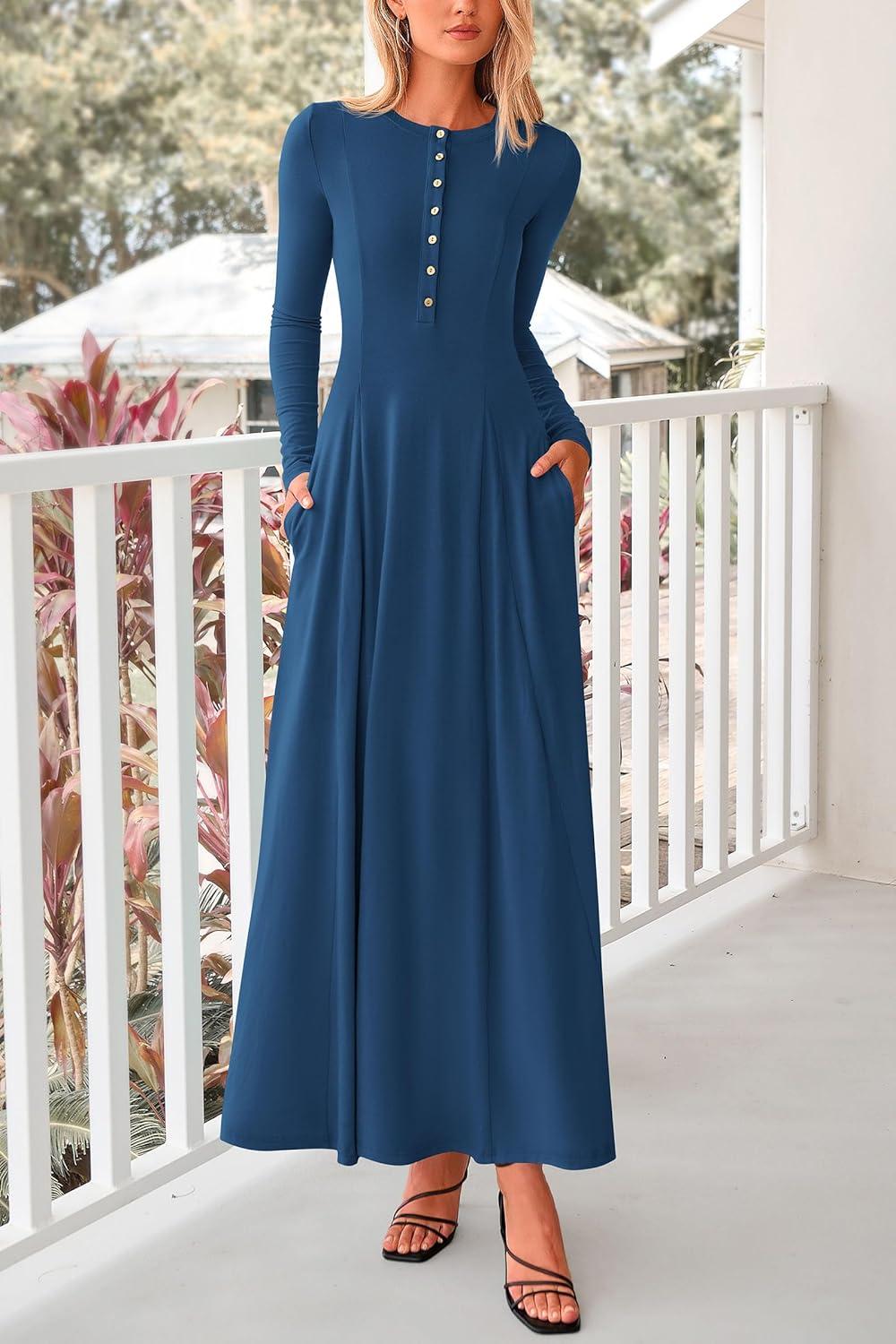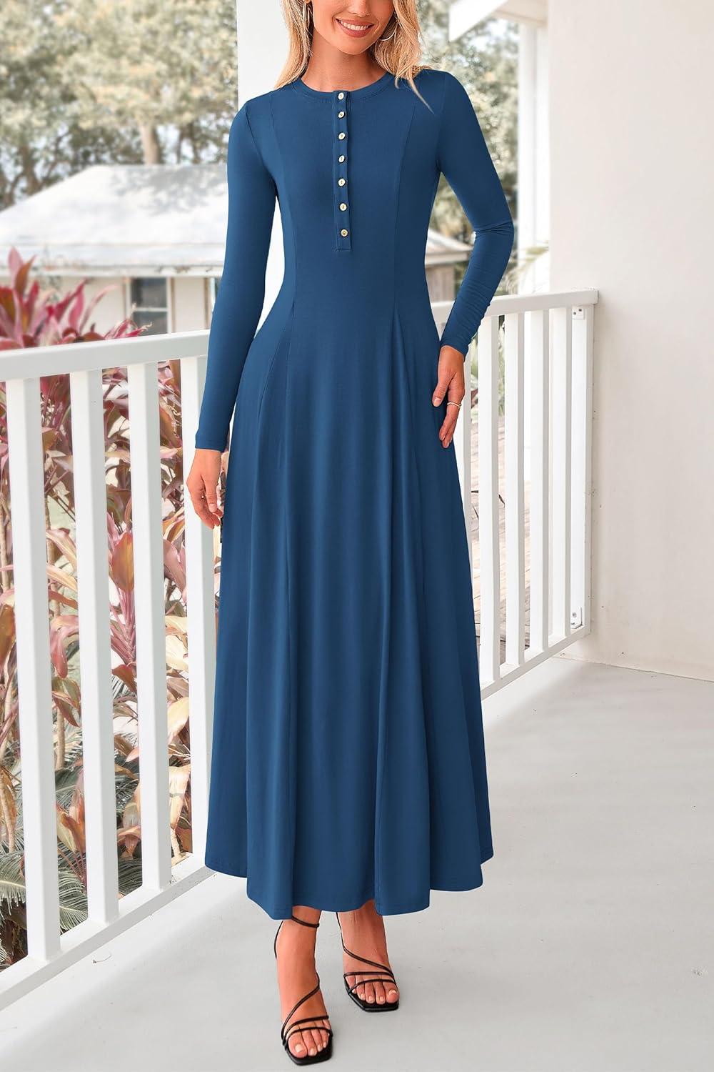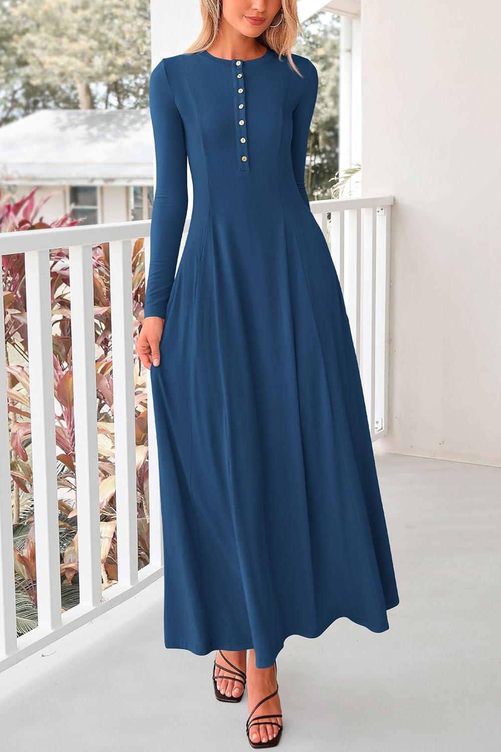 PRETTYGARDEN Maxi Dresses for Women 2025 Fall Casual Long Sleeve Button Fit and Flare Long Flowy Going Out Dress(Dark Blue)