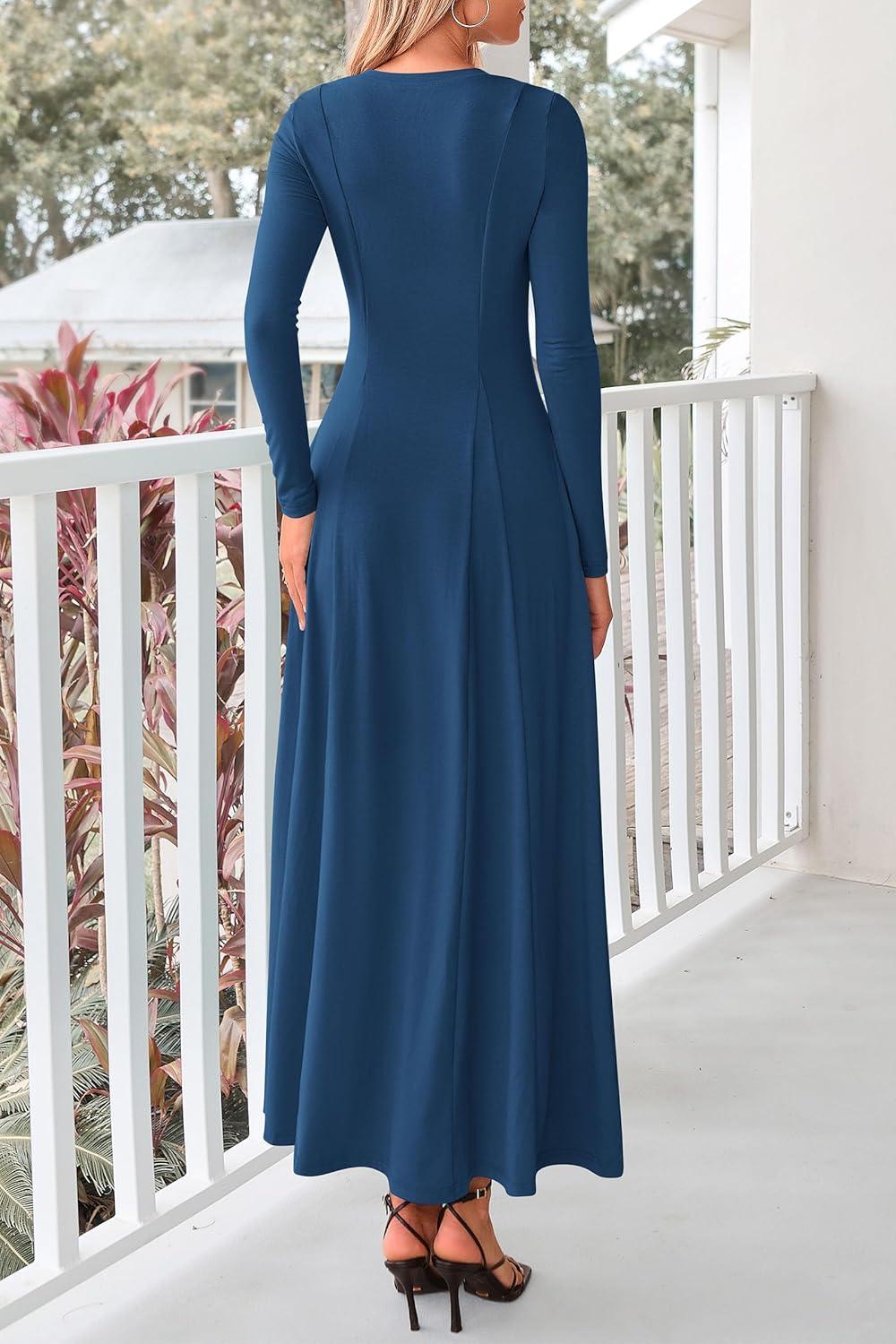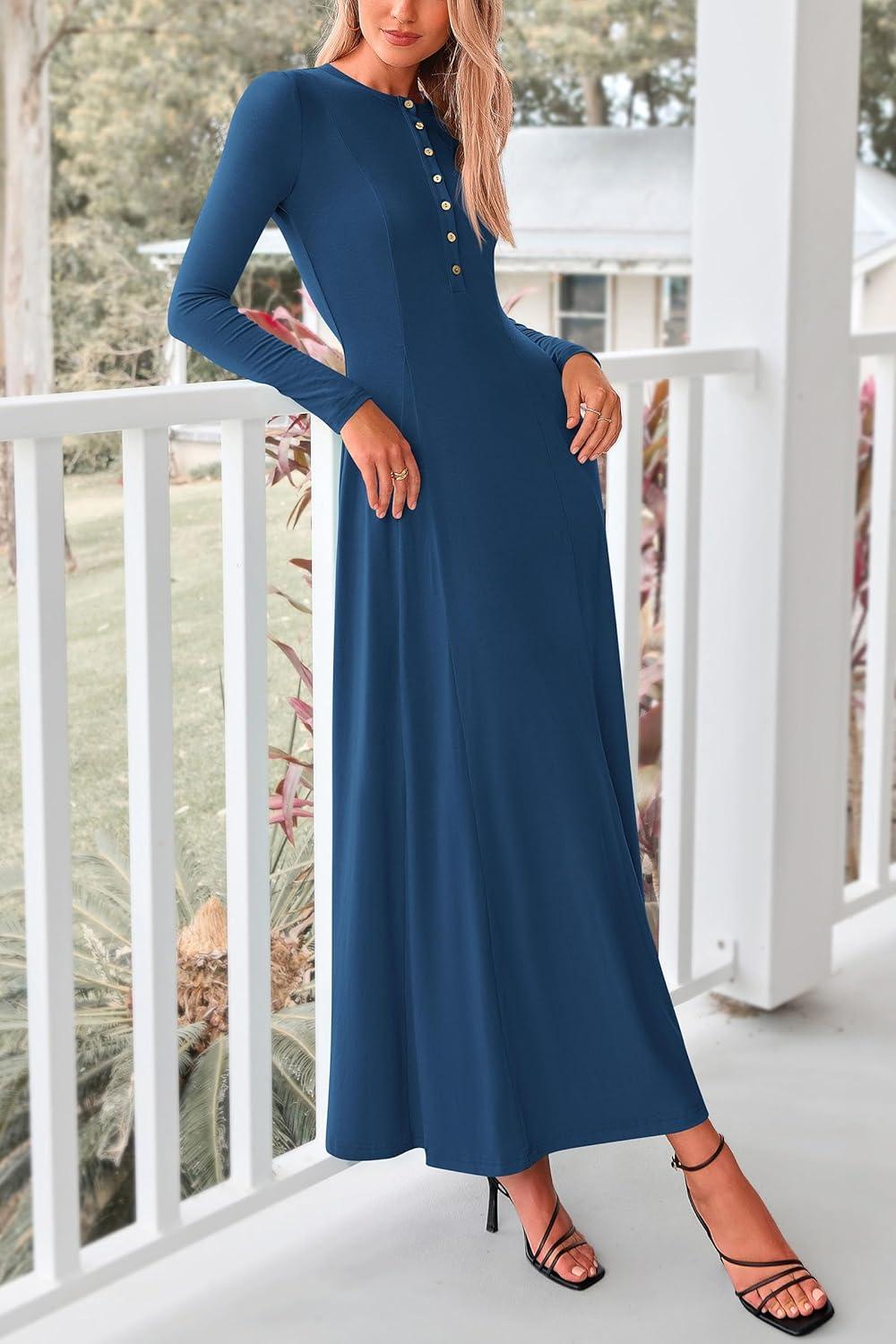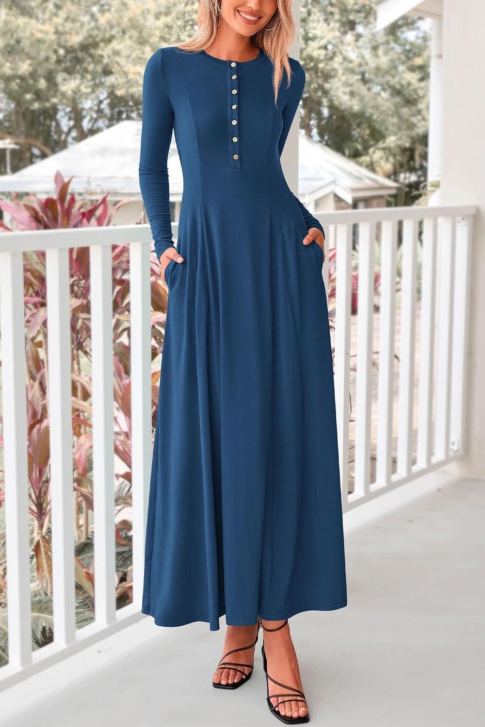 PRETTYGARDEN Maxi Dresses for Women 2025 Fall Casual Long Sleeve Button Fit and Flare Long Flowy Going Out Dress(Dark Blue)