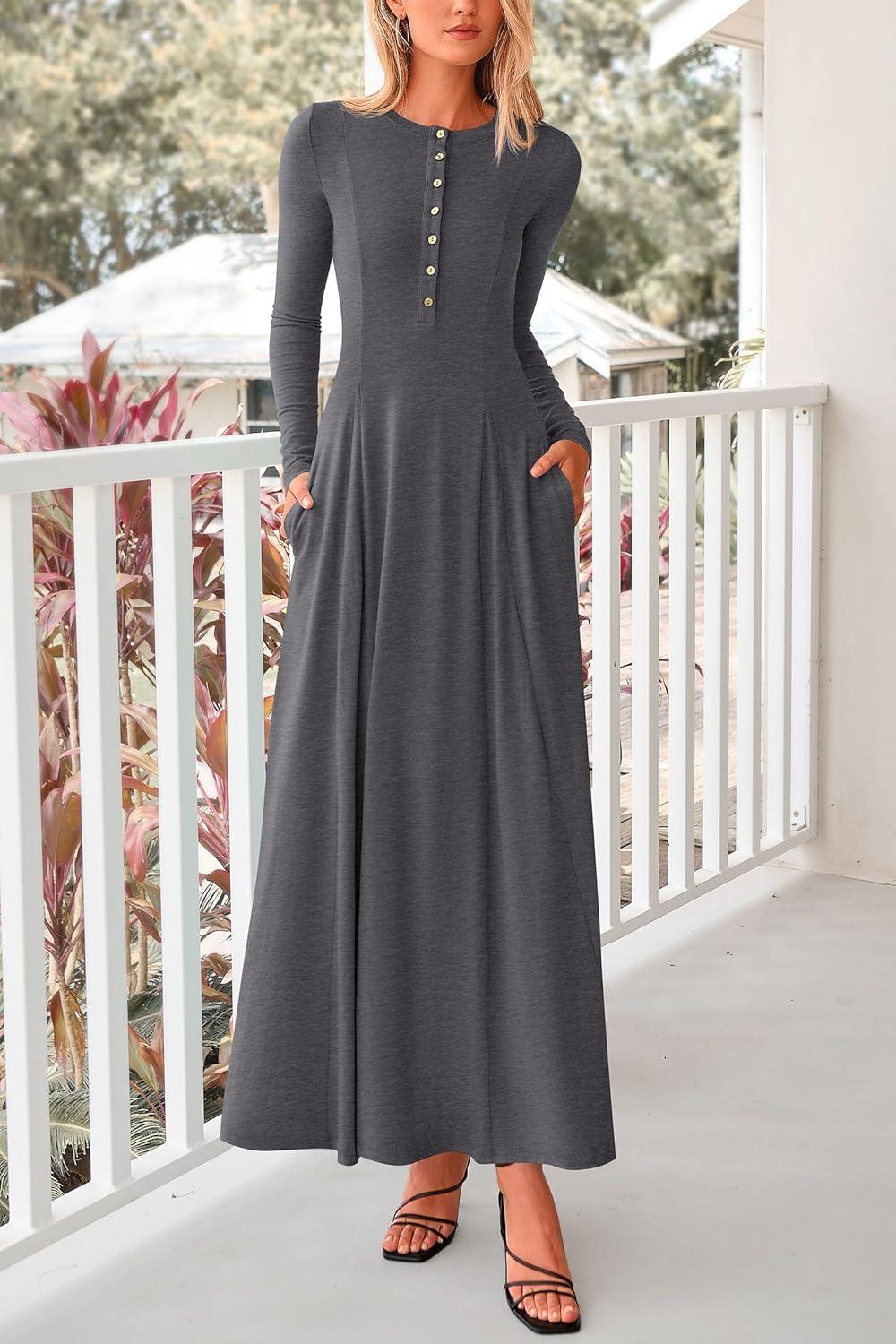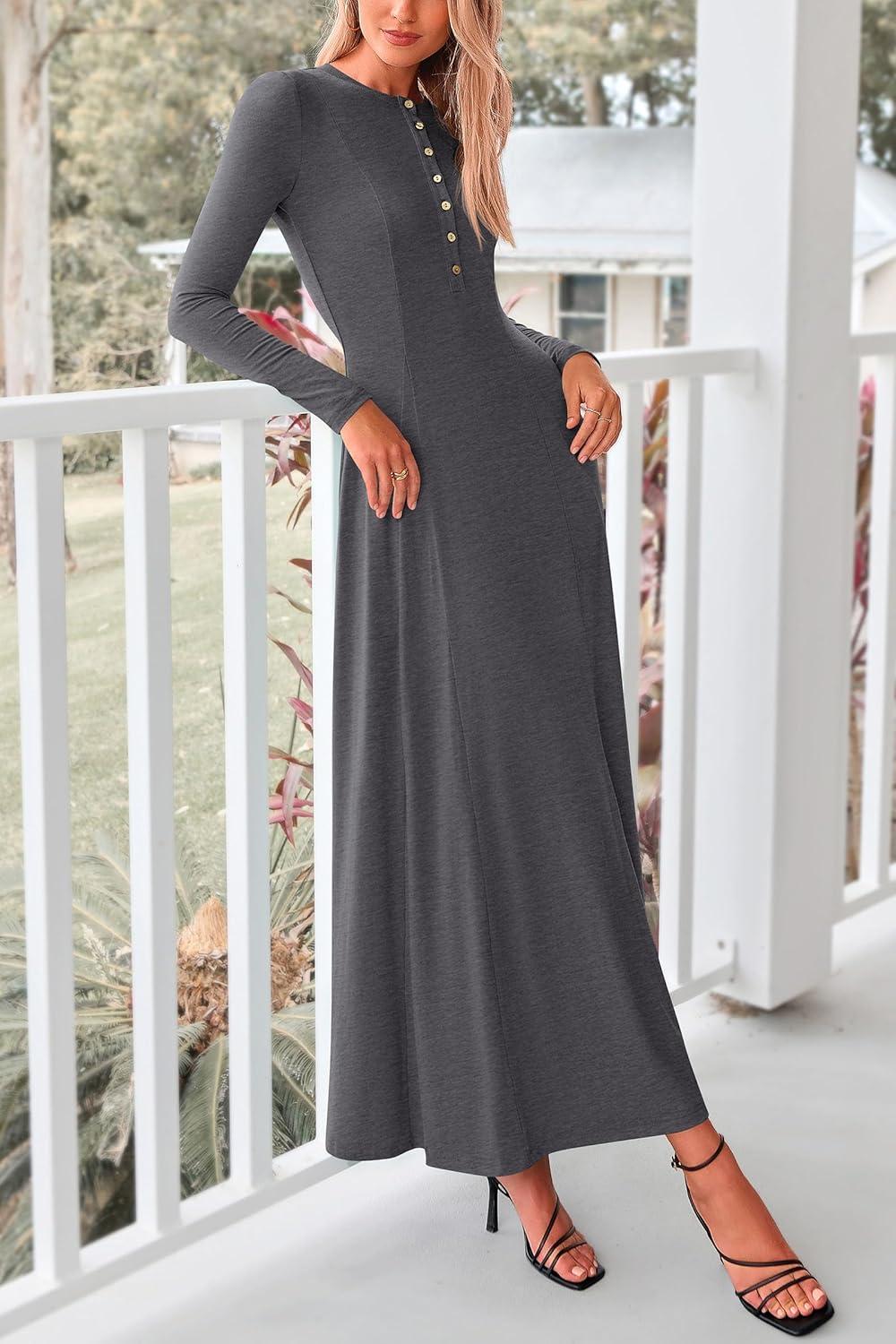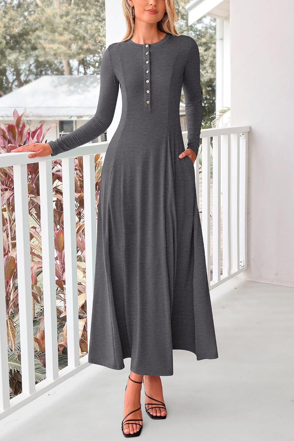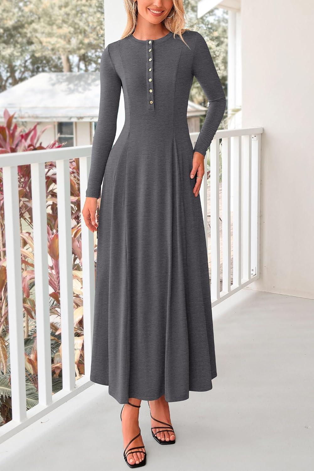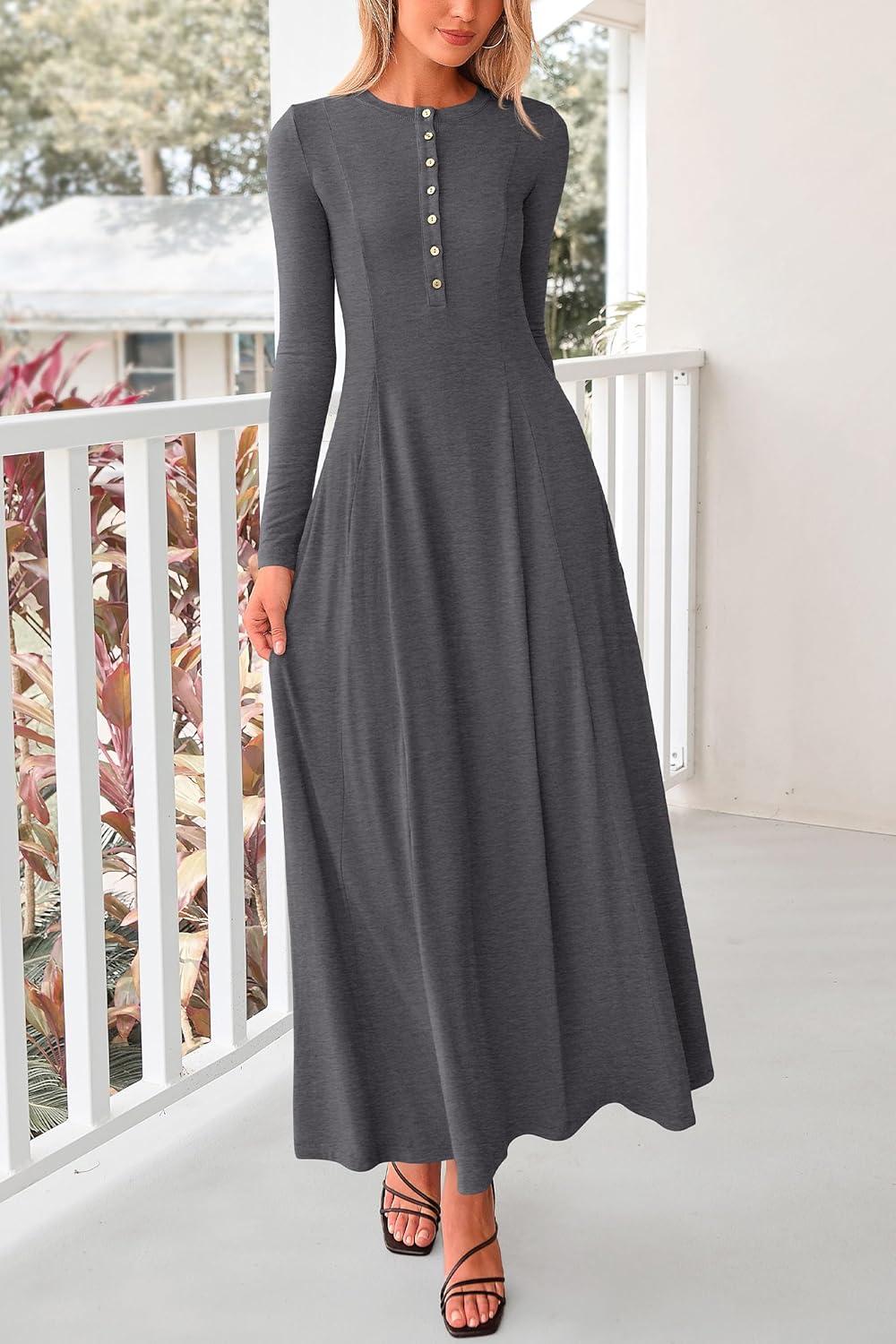 PRETTYGARDEN Maxi Dresses for Women 2025 Fall Casual Long Sleeve Button Fit and Flare Long Flowy Going Out Dress(Dark Grey)