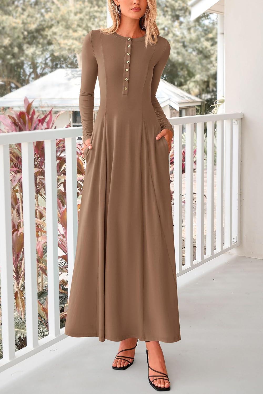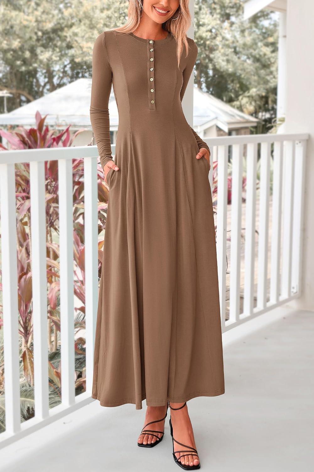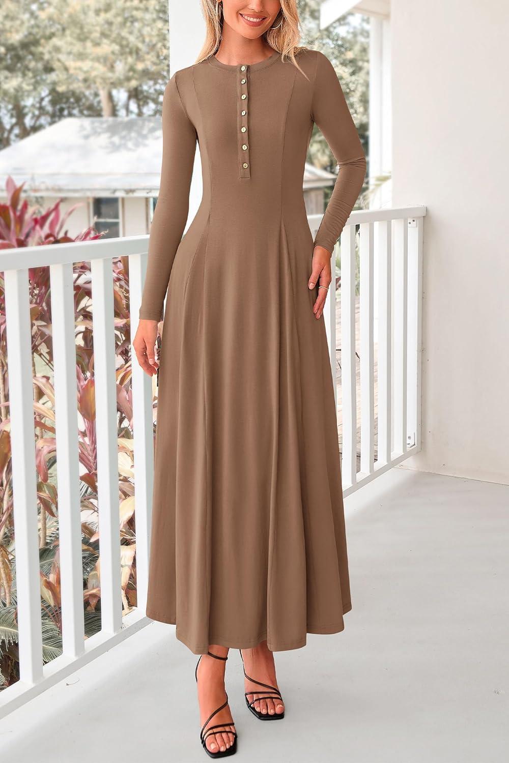 PRETTYGARDEN Maxi Dresses for Women 2025 Fall Casual Long Sleeve Button Fit and Flare Long Flowy Going Out Dress(Dark Khaki)