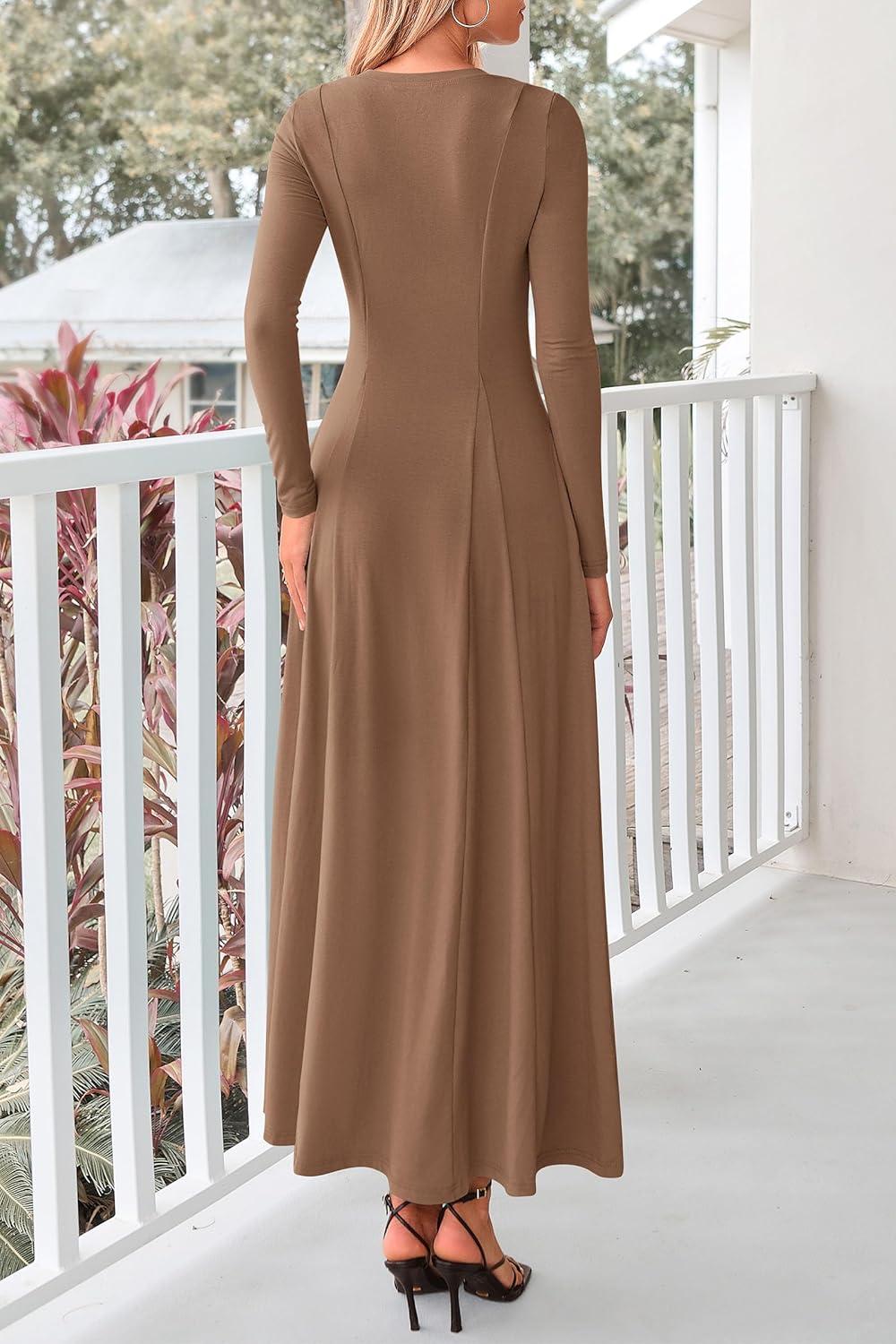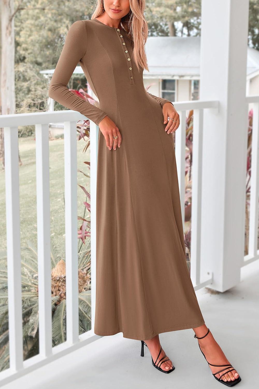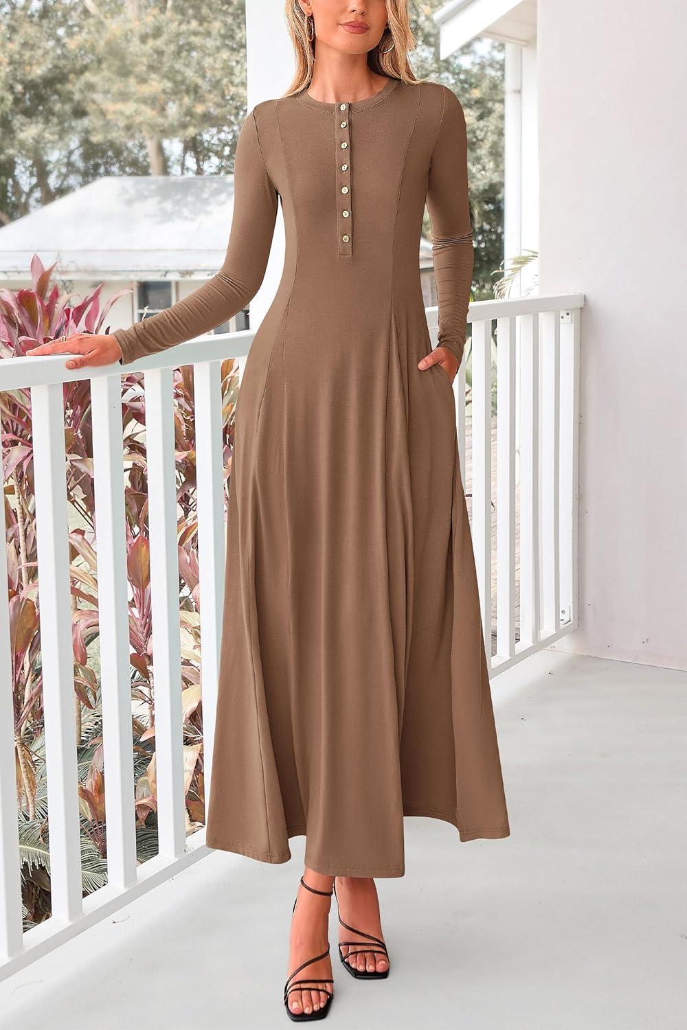 PRETTYGARDEN Maxi Dresses for Women 2025 Fall Casual Long Sleeve Button Fit and Flare Long Flowy Going Out Dress(Dark Khaki)