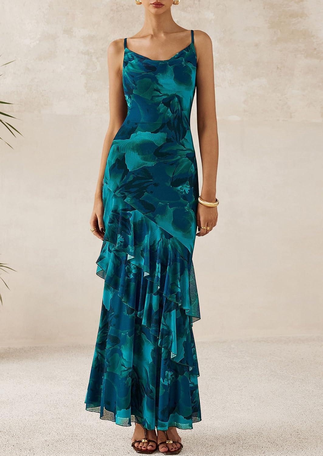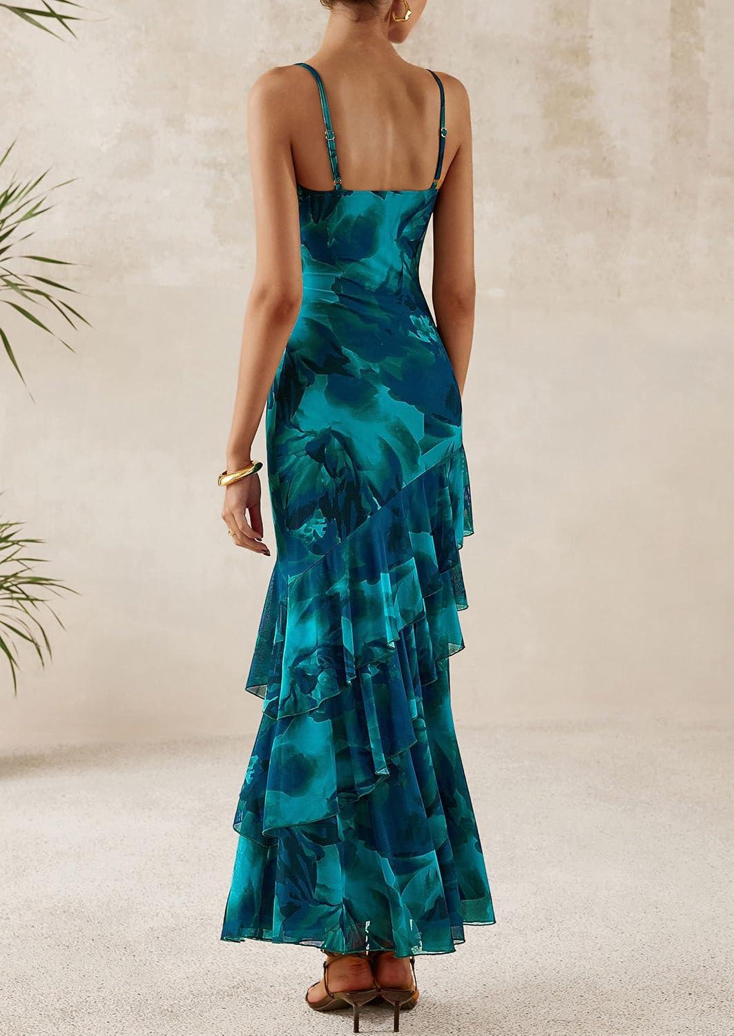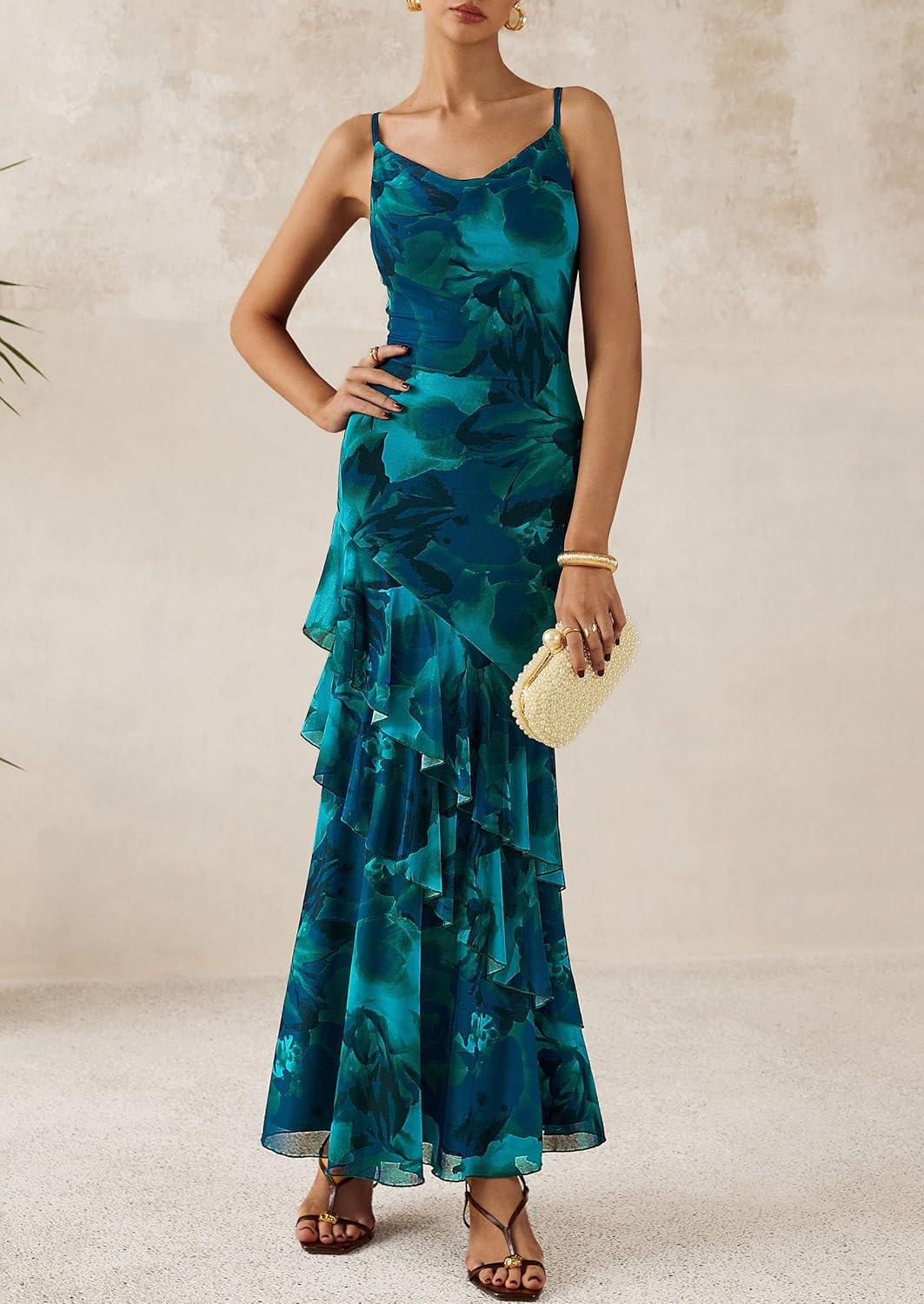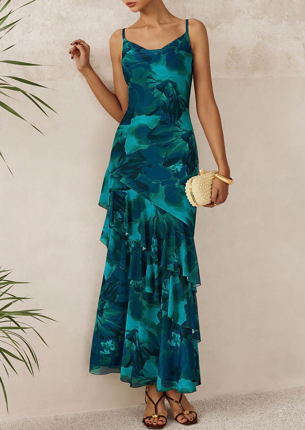 PRETTYGARDEN Maxi Dresses for Women 2025 Floral Beach Sundress Spaghetti Strap Tiered Summer Wedding Guest Long Dress(Floral Lake Blue)