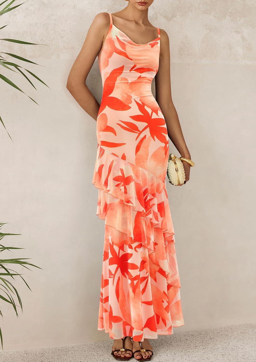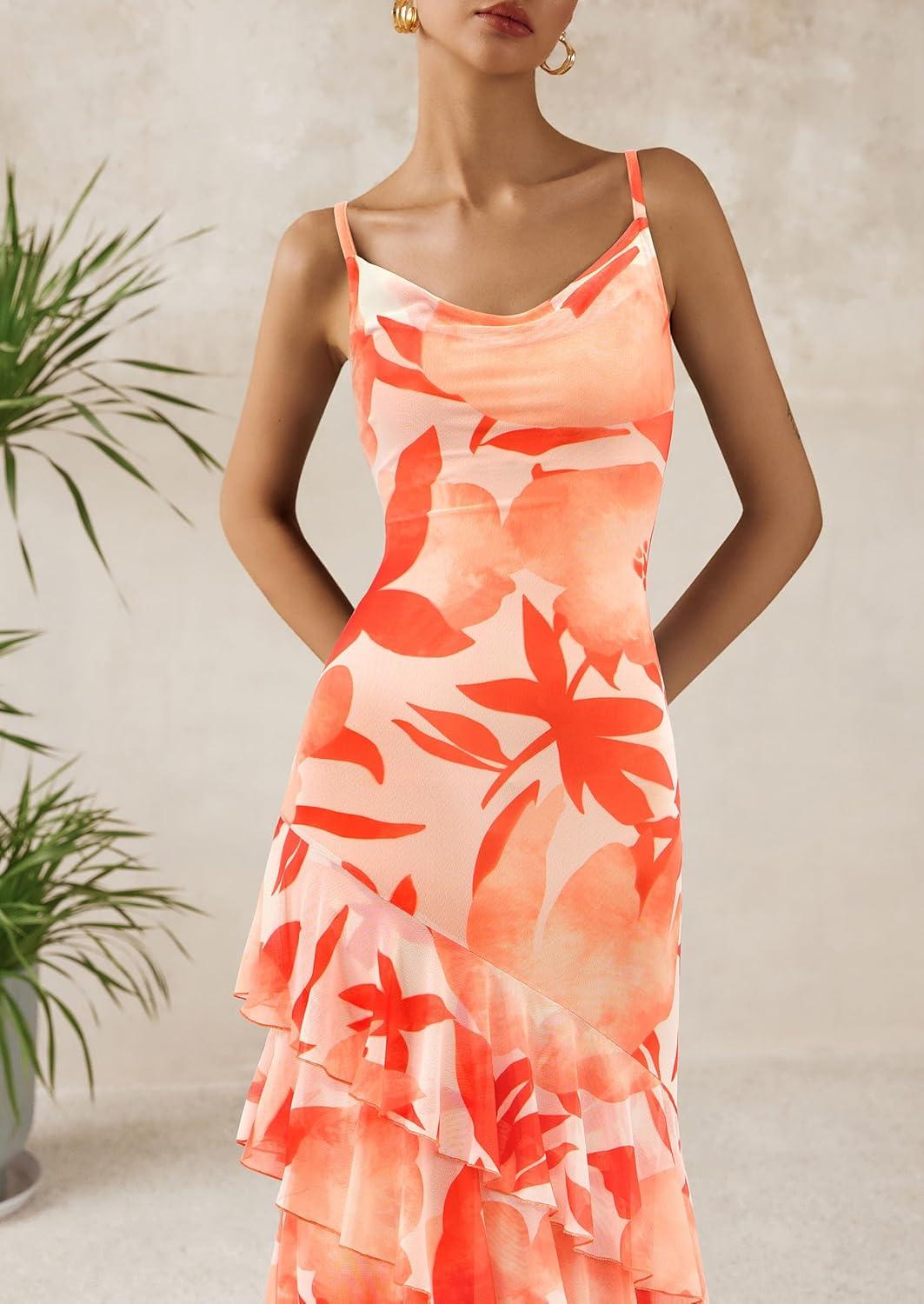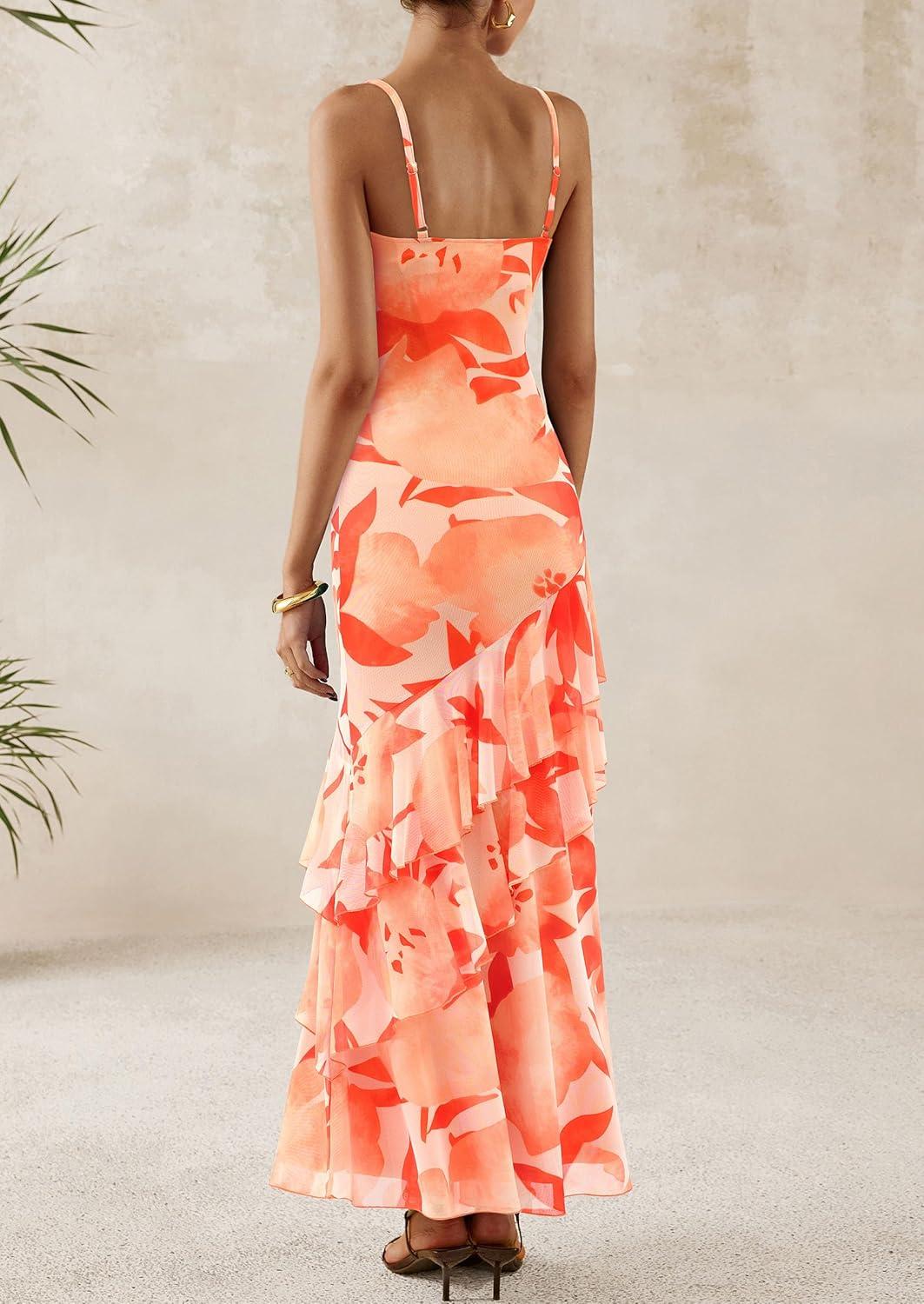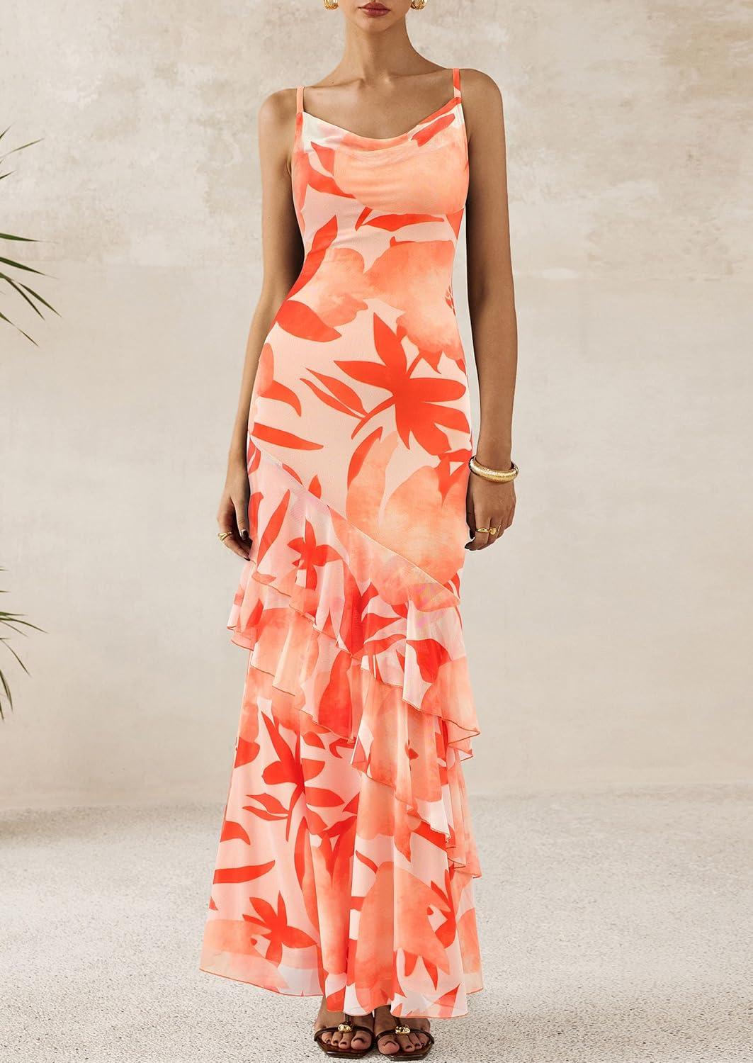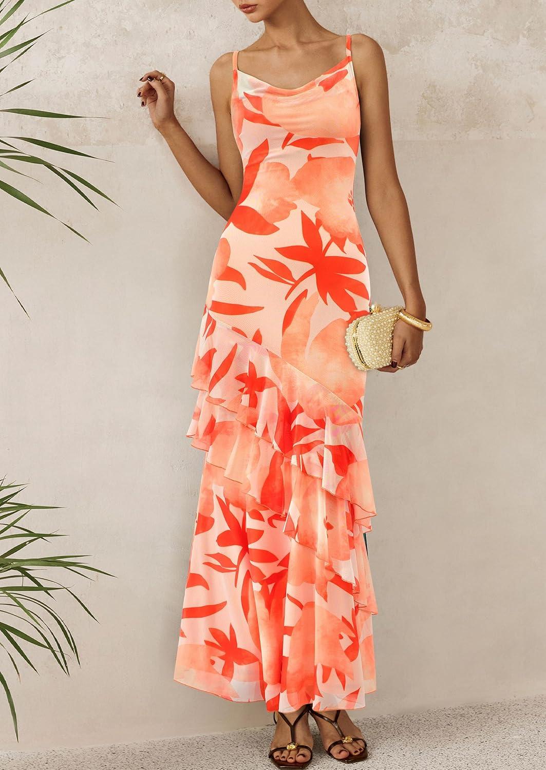 PRETTYGARDEN Maxi Dresses for Women 2025 Floral Beach Sundress Spaghetti Strap Tiered Summer Wedding Guest Long Dress(Floral Light Orange)