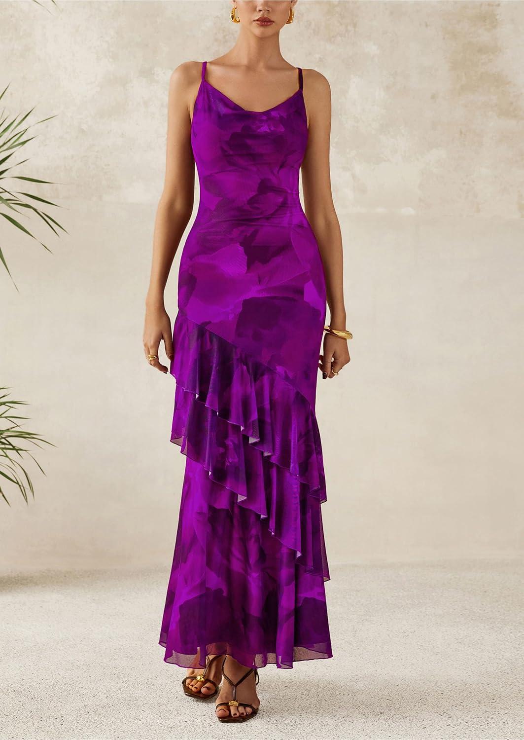 imagePRETTYGARDEN Maxi Dresses for Women 2025 Floral Beach Sundress Spaghetti Strap Tiered Summer Wedding Guest Long DressPrint Purple