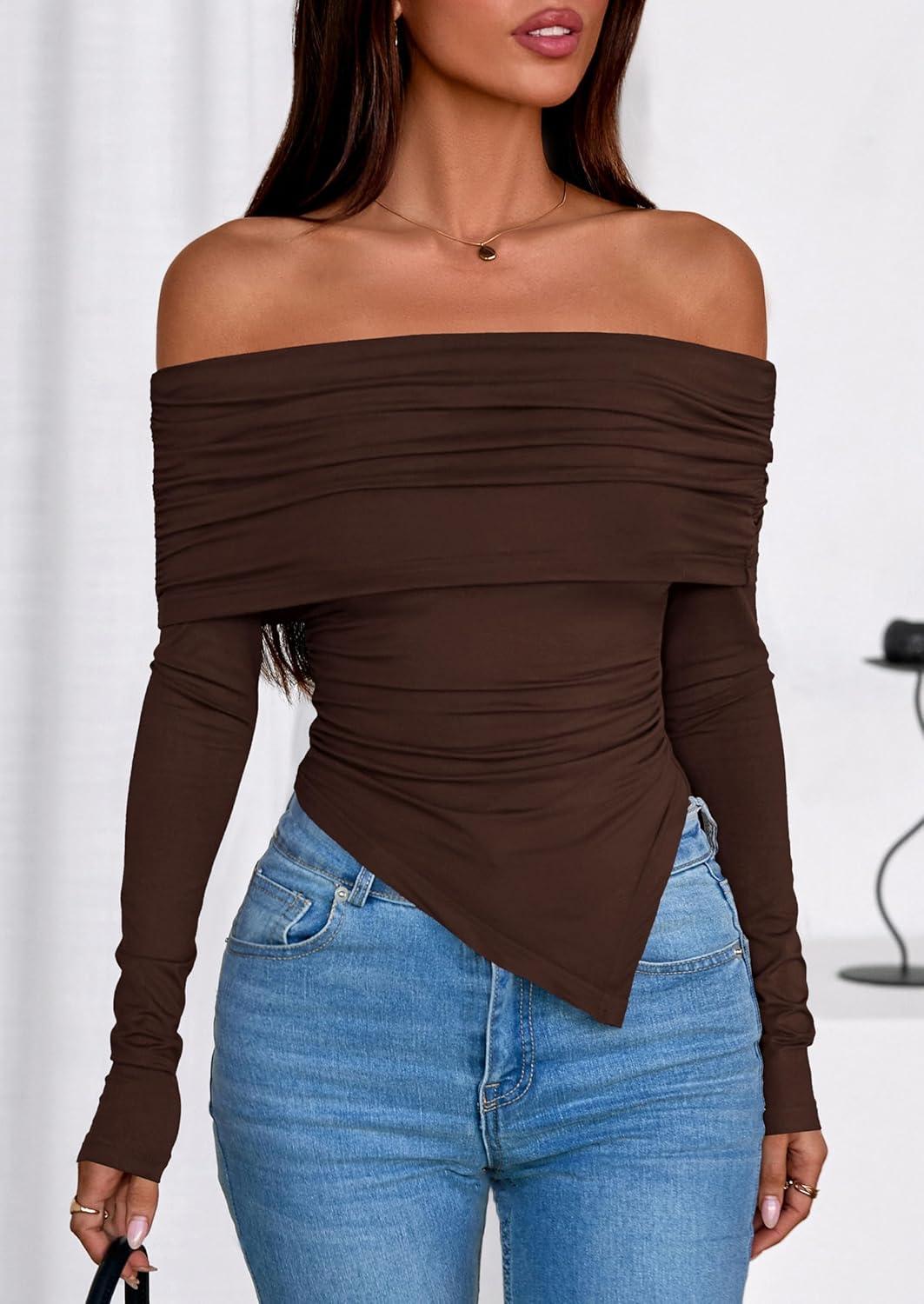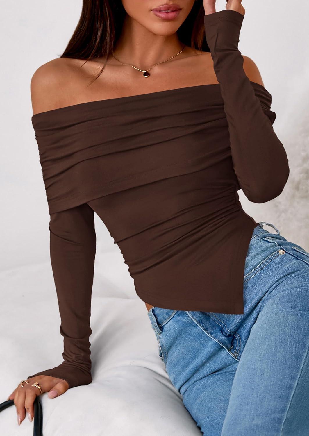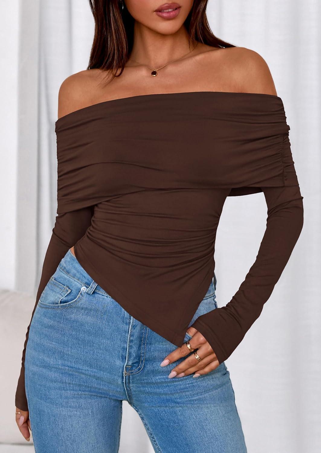 Discover the latest PRETTYGARDEN Off The Shoulder Tops for Women Fall Fashion 2025 Long Sleeve Shirts Going Out Slim Fitted Blouses Y2K Clothes(Brown) from and take advantage of our limited-time introductory offer.