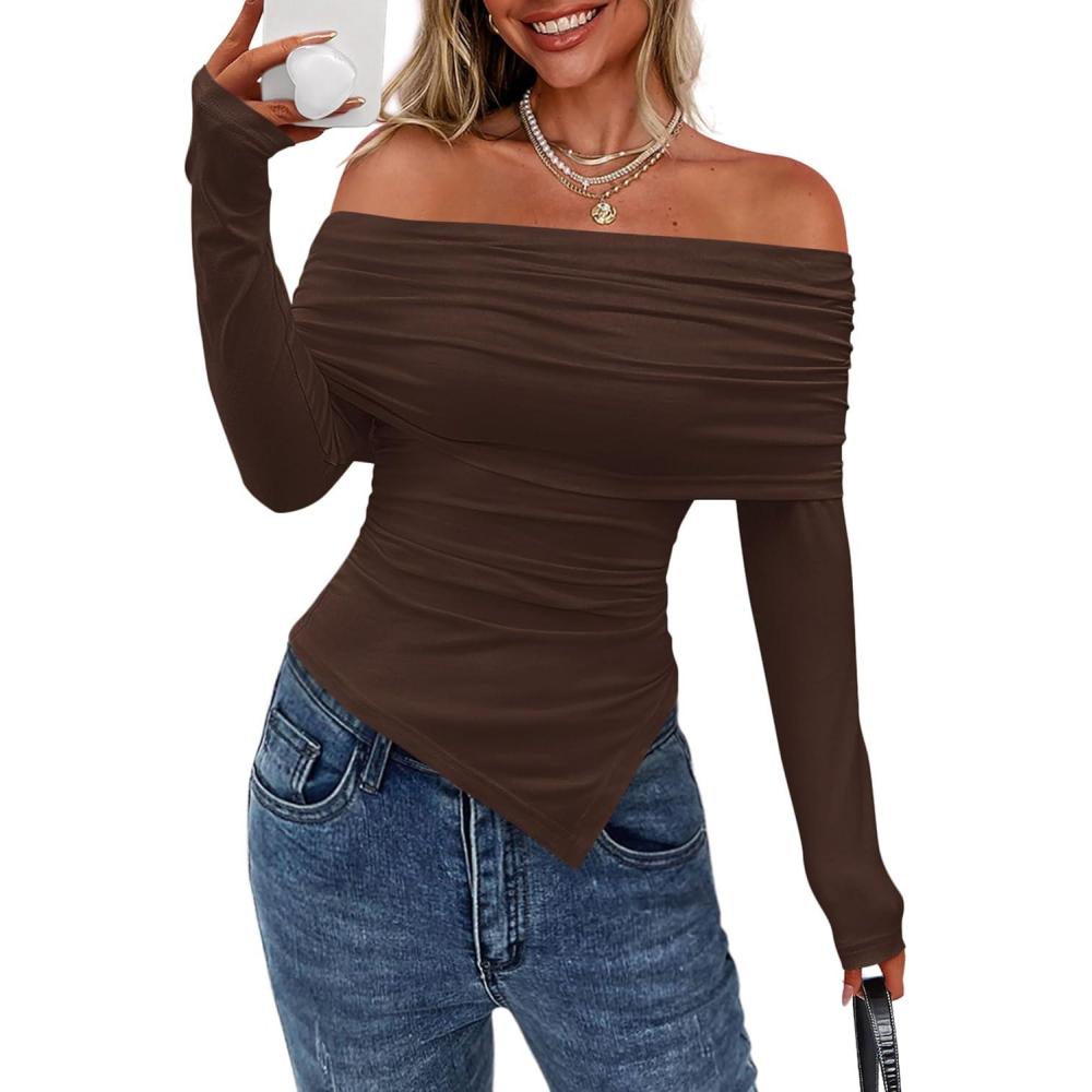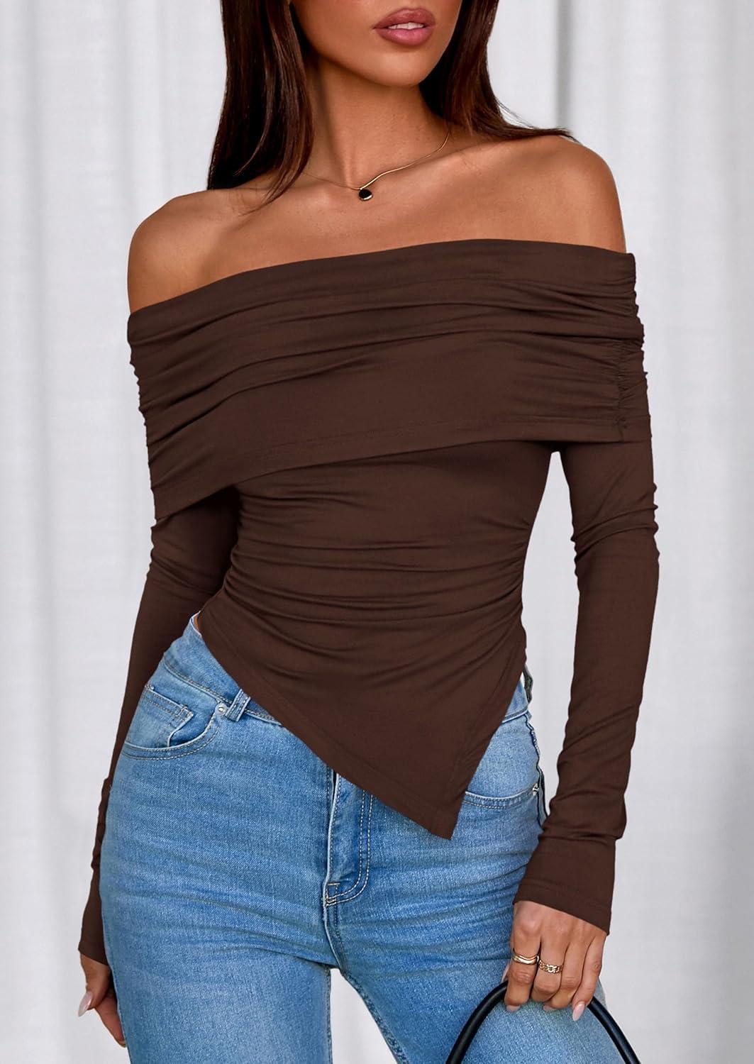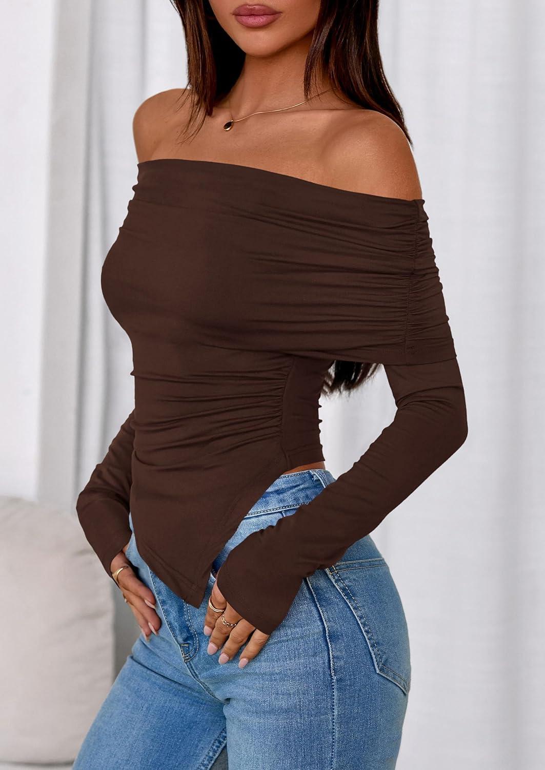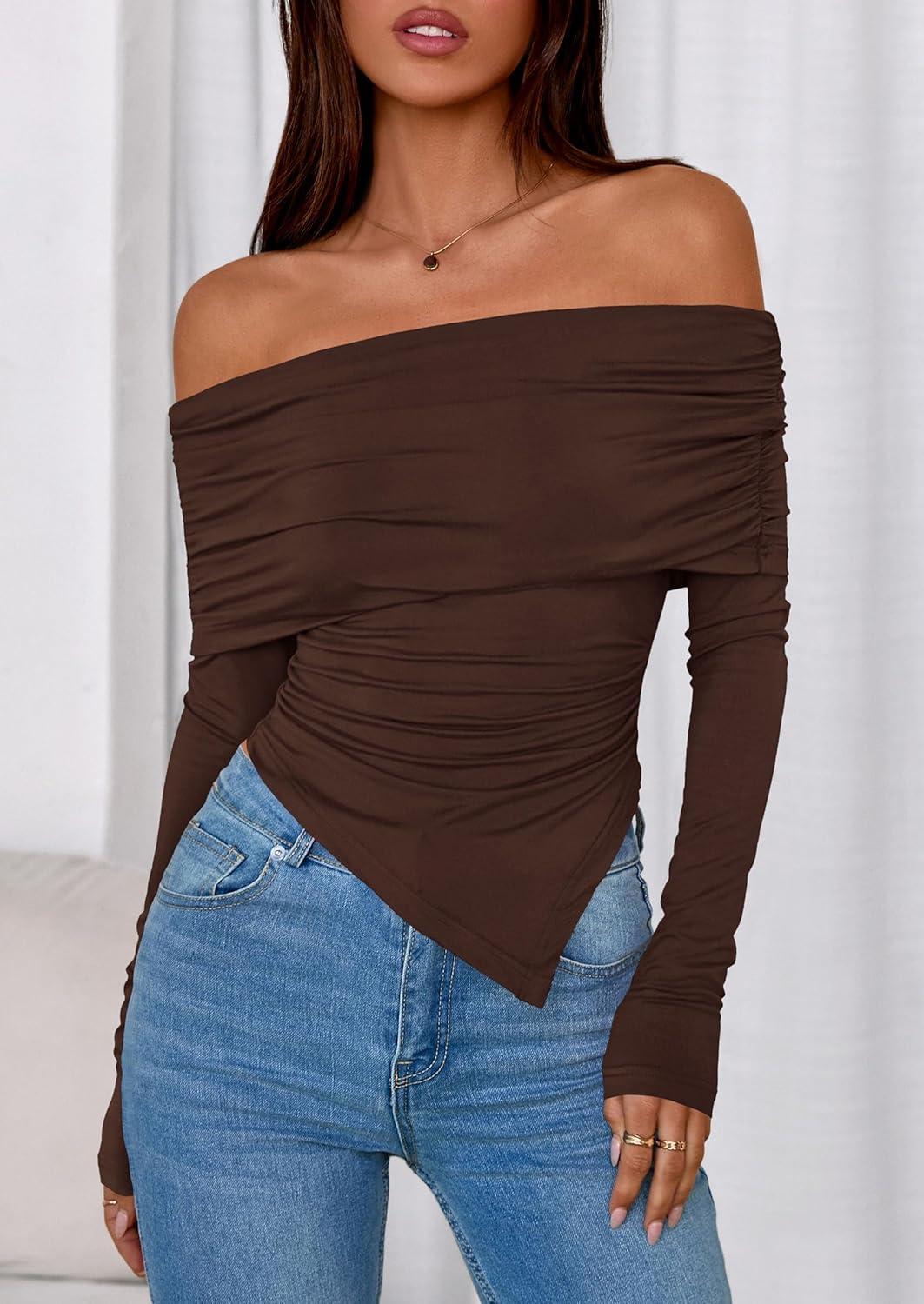 Discover the latest PRETTYGARDEN Off The Shoulder Tops for Women Fall Fashion 2025 Long Sleeve Shirts Going Out Slim Fitted Blouses Y2K Clothes(Brown) from and take advantage of our limited-time introductory offer.