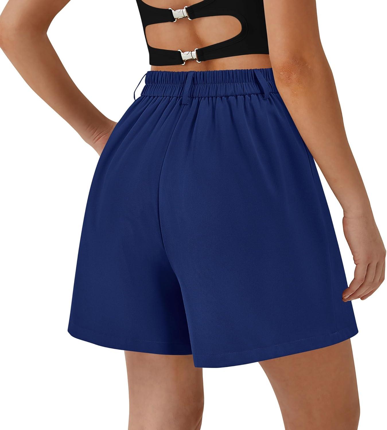 PRETTYGARDEN Shorts for Women Dressy 2025 Summer Elastic High Waisted Wide Leg Business Casual Work Shorts with Pockets(Navy Blue)